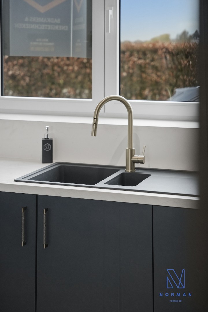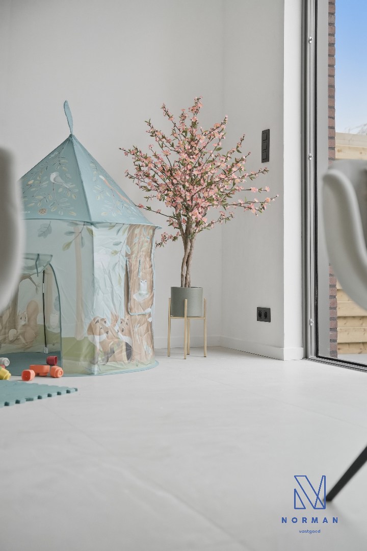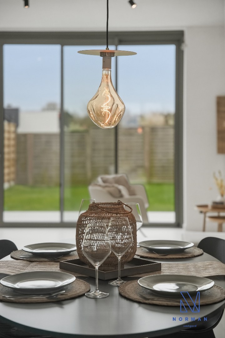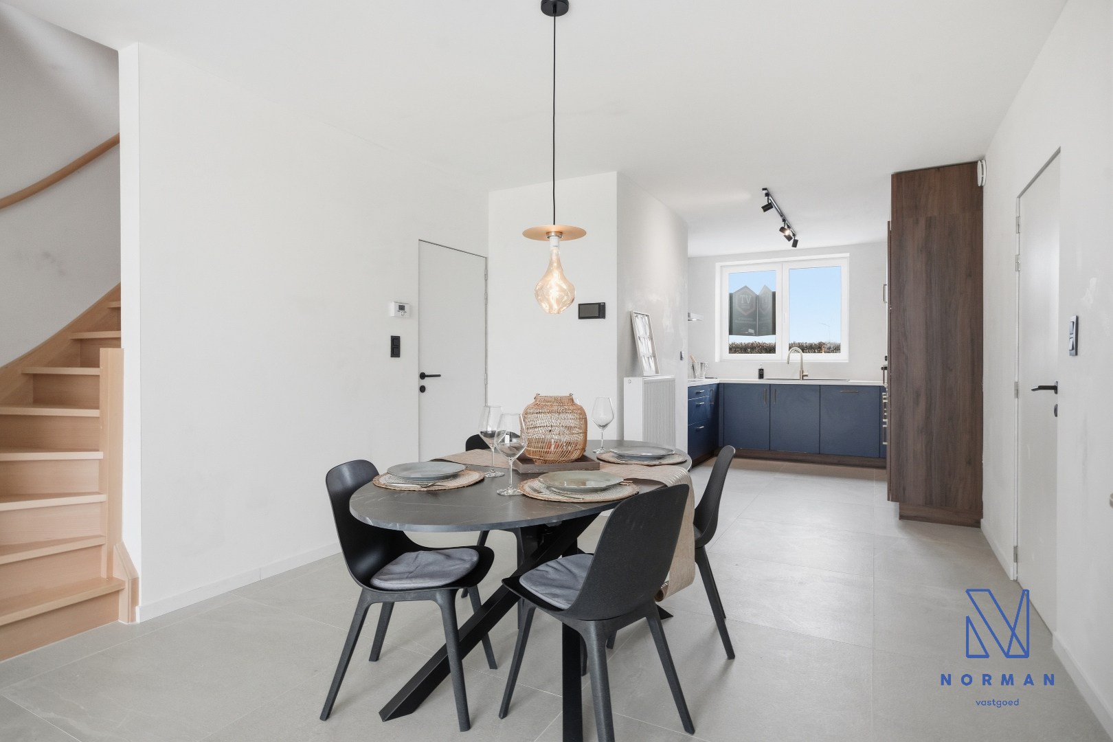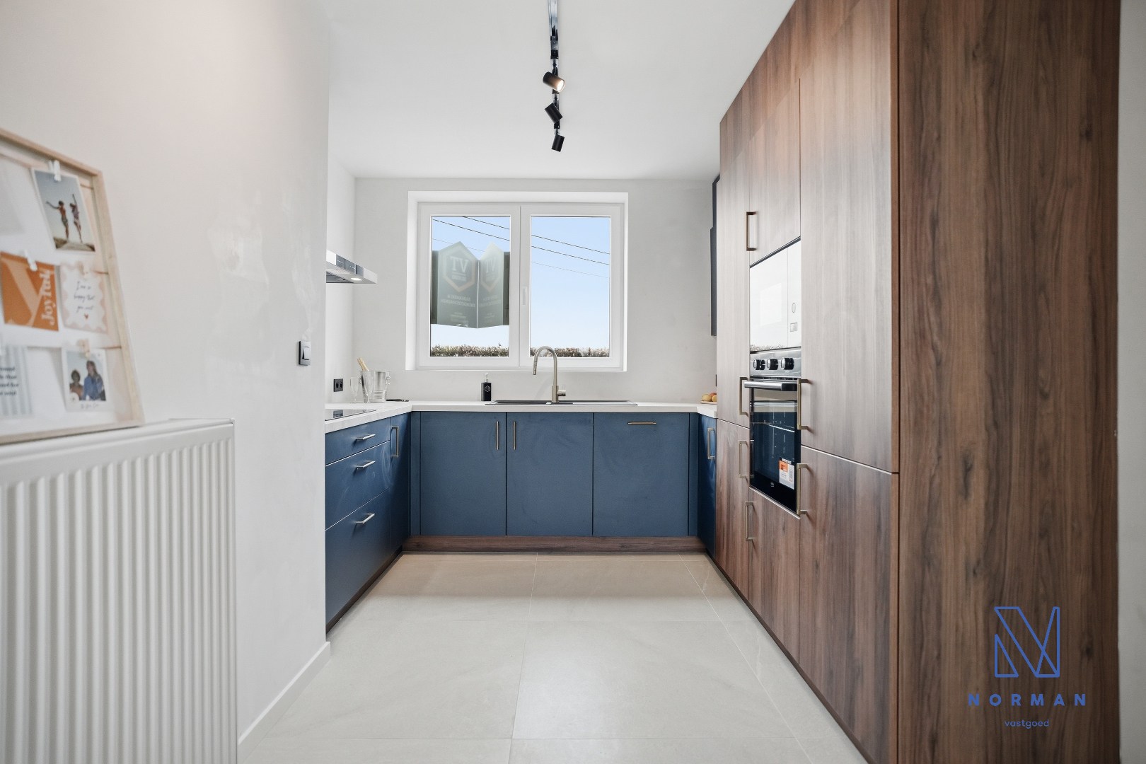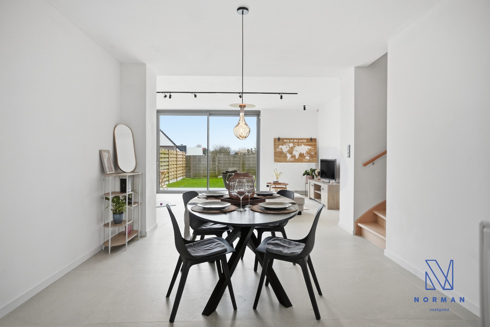 Verder kom je in de lichtrijke leefruimte met een open, volledig uitgeruste keuken voorzien van alle moderne toestellen. Vanuit de leefruimte geniet je van een mooi zicht op de verzorgde tuin met terras.