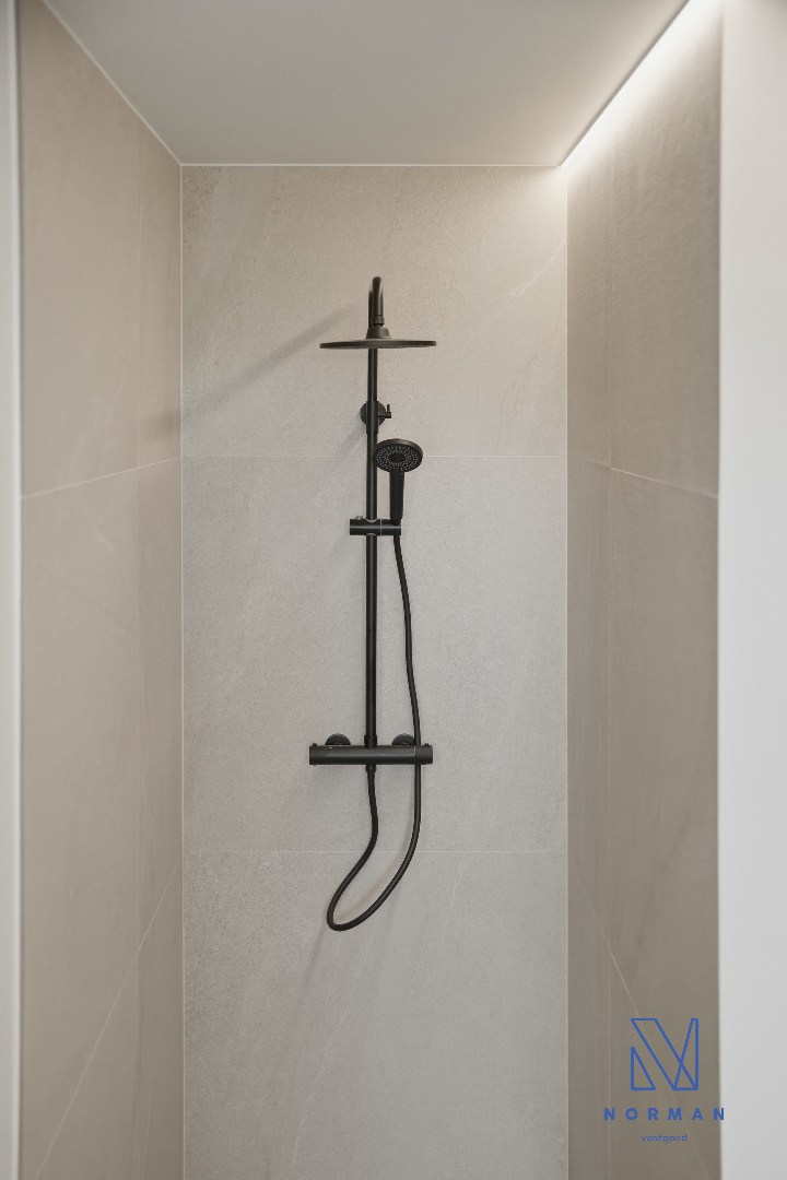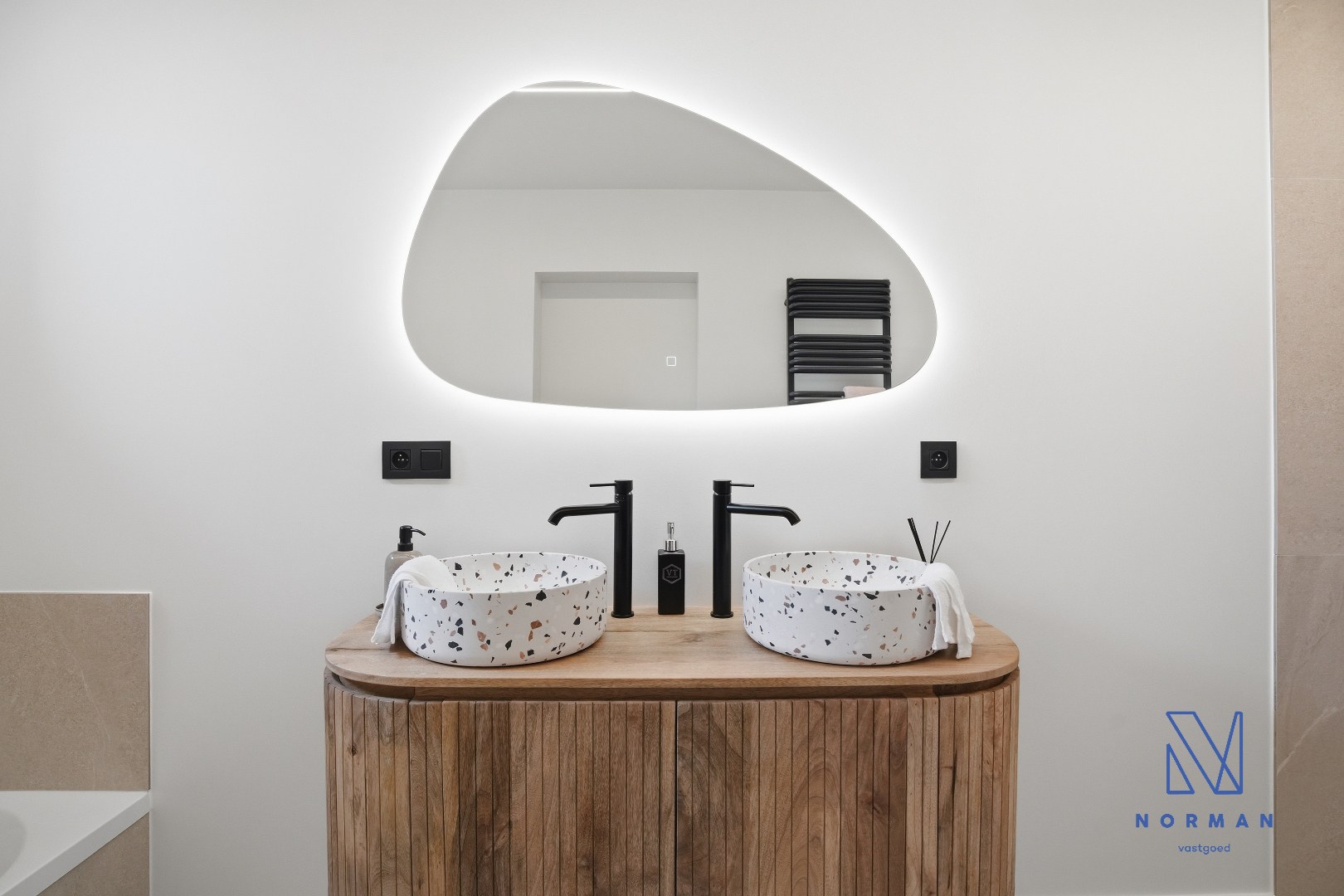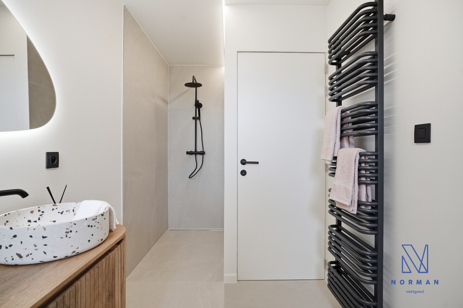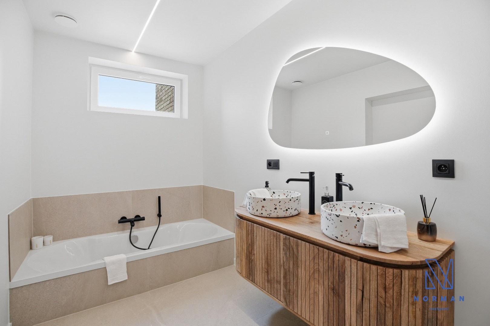 De badkamer is uitgerust met een ligbad, douche en dubbele lavabo. Daarnaast is er een aparte, ruime wasplaats voorzien voor een wasmachine en droogkast, hier zit ook de condenserende ketel op de gas.