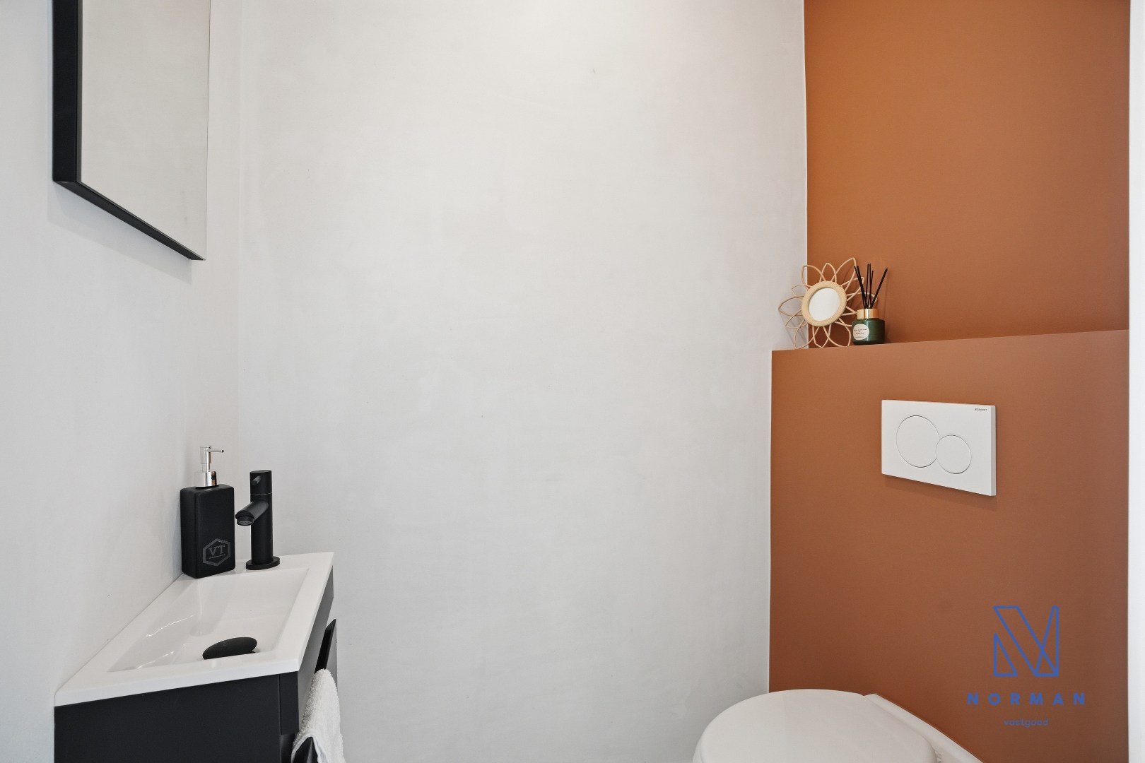 Bij het binnengaan van de woning kom je in de inkomhal met ingemaakte kasten aan de linkerkant, waar ook de technische installaties netjes zijn weggewerkt. Aansluitend bevindt zich een apart gastentoilet en is er toegang tot de kelder.
