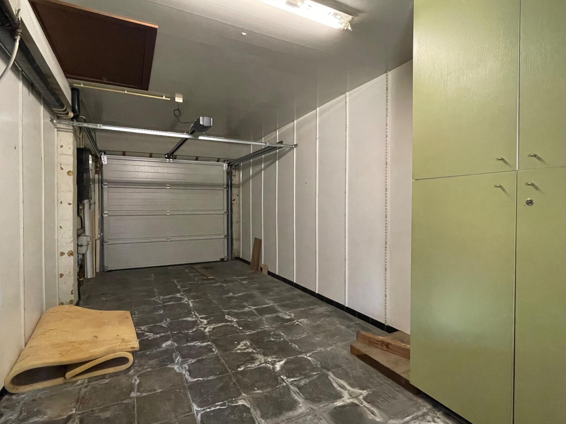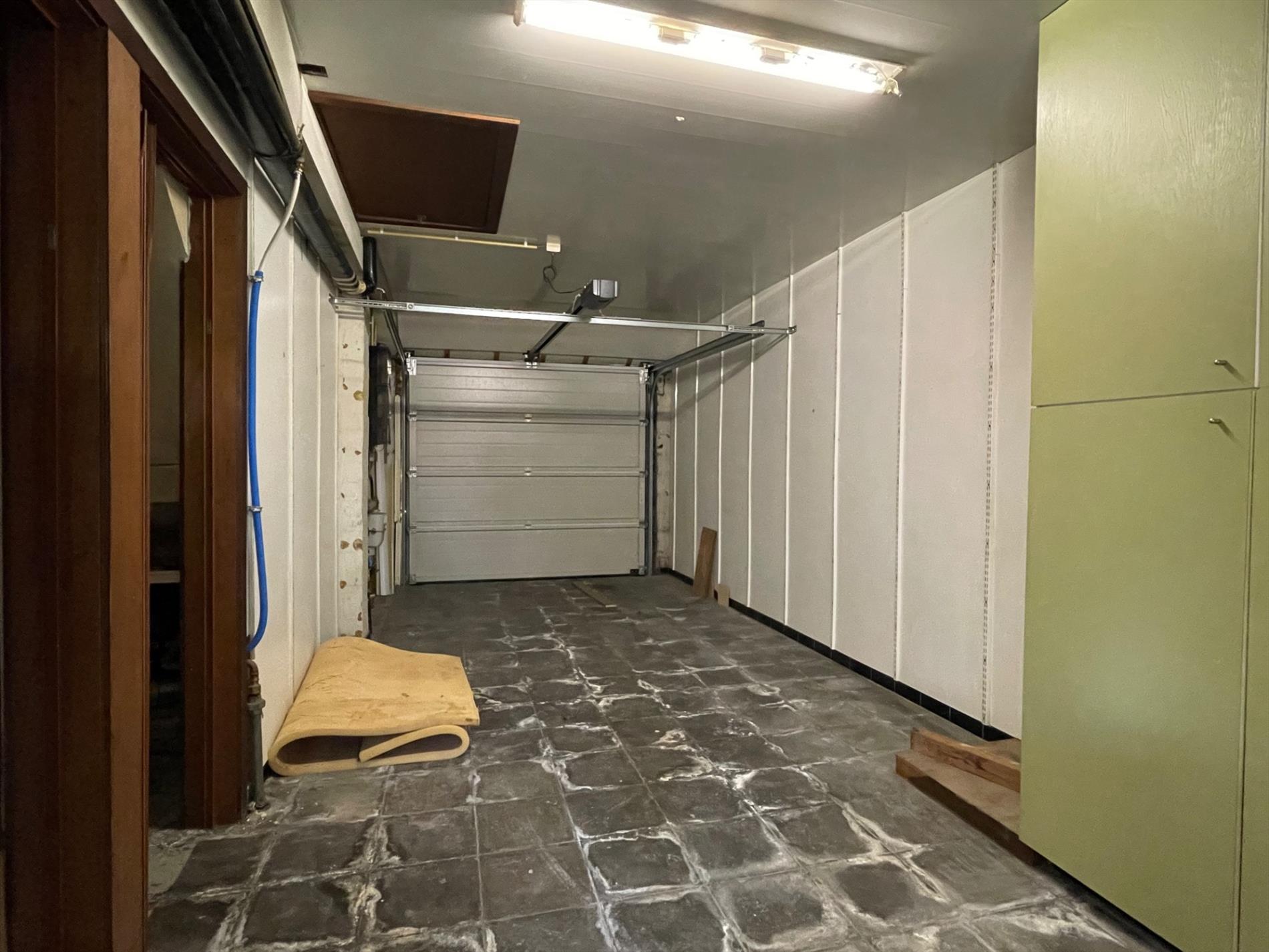 Ruime garage met automatische sectionaalpoort en aansluitende wasruimte.