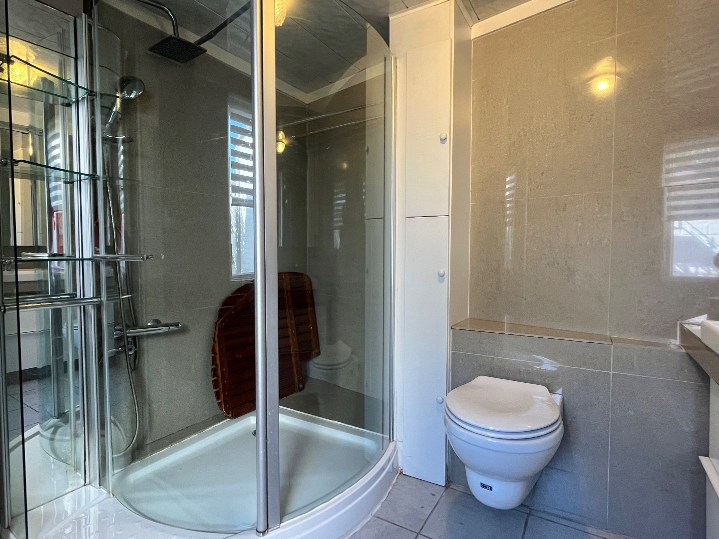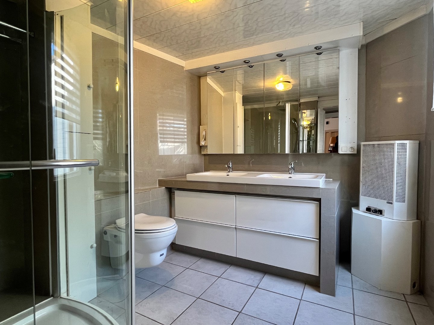 Bij het binnenkomen van de woning stap je de ruime leefruimte in, die meteen een gezellige en warme sfeer uitstraalt. Aansluitend vind je de lichtrijke, uitgeruste keuken met voldoende ruimte om een eettafel te plaatsen. Naast de keuken is er een praktische berging voorzien voor een koelkast en diepvries. Verder is er nog een aparte berging met aansluitingen voor wasmachine en droogkast. De vernieuwde badkamer beschikt over een dubbele lavabo, toilet en douche.