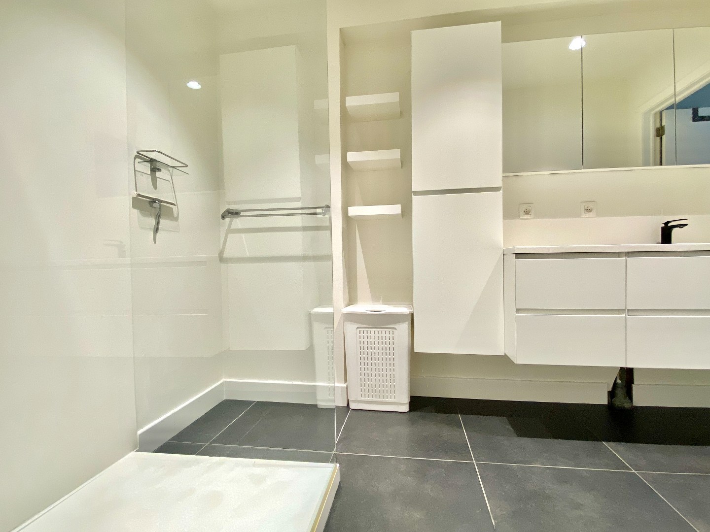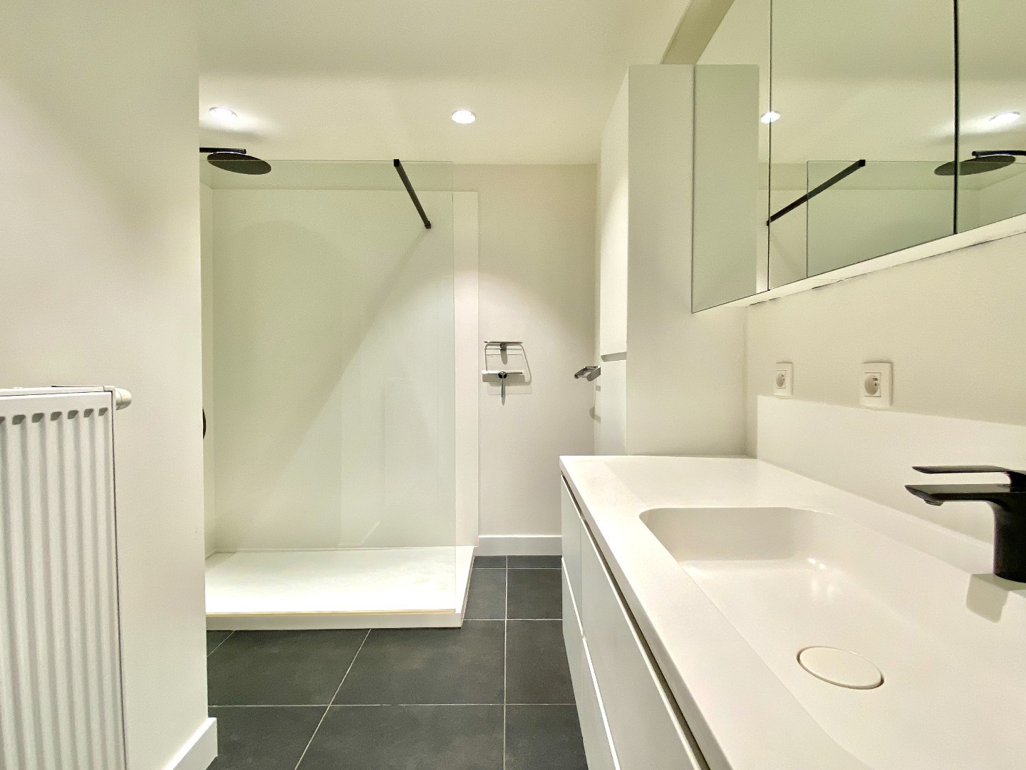 De badkamer bevat een inloopdouche, wastafel met bijhorende kasten en vooral voldoende ruimte. Het verdiep is 1 heel grote slaapkamer.