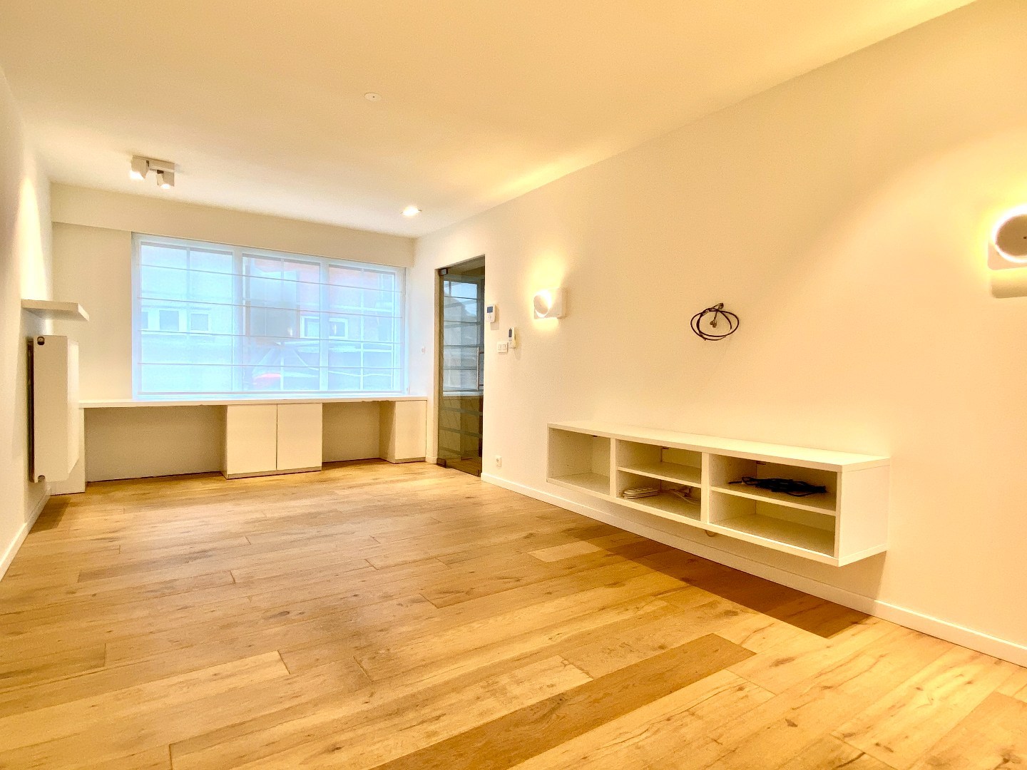 Inkom met apart toilet, toegang naar de badkamer, trap naar het verdiep en doorgang naar de leefruimte. De leefruimte is voorzien van parket, designverlichting, TV meubel en keuken om de hoek. Al deze ruimten hebben zicht over het terras en de tuin.