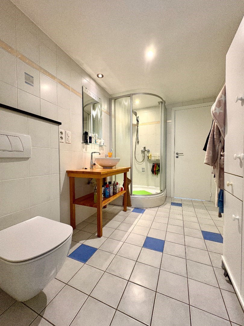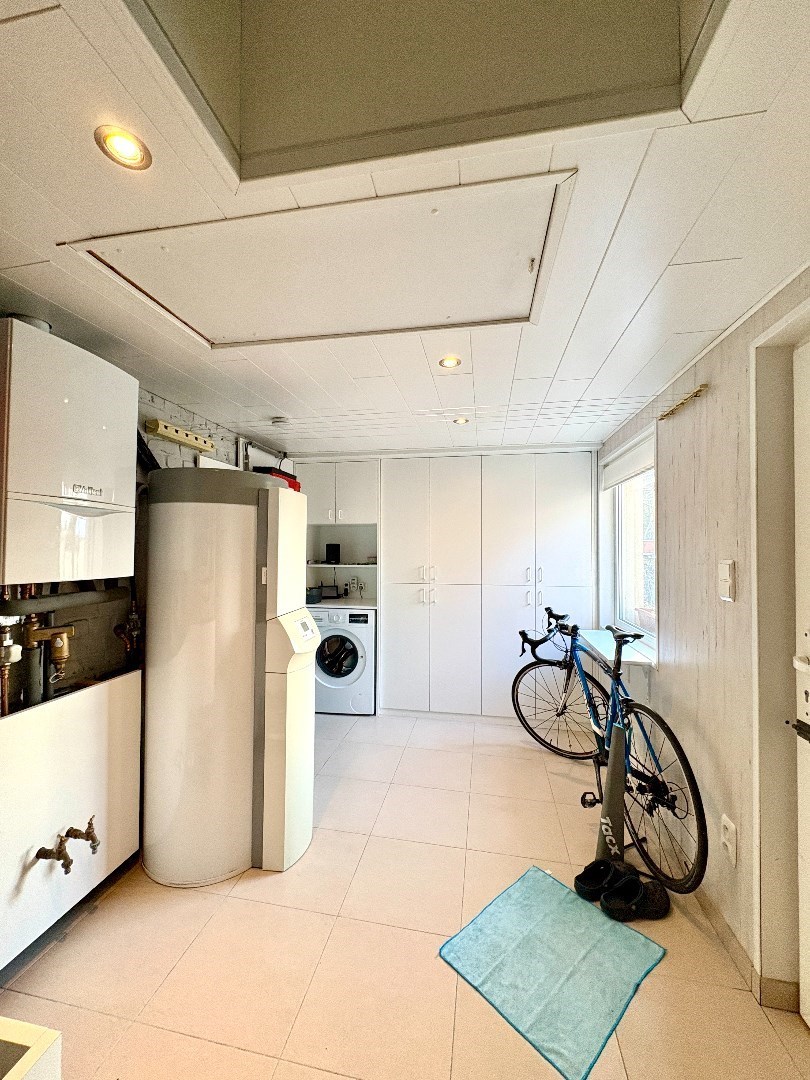 Op het gelijkvloers is de badkamer met douche, toilet en wastafel. Achteraan het huis is er een ruime berging met vele kastruimten en technieken.