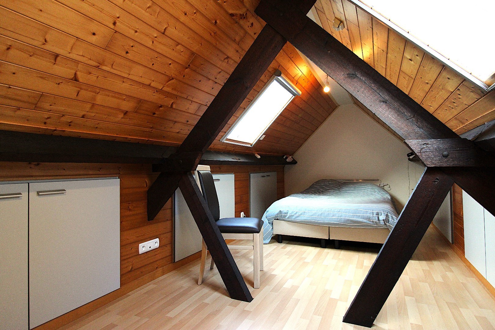 Het verdiep bevat 2 echt ruime slaapkamers en een vaste trap brengt ons naar de masterbedroom.
