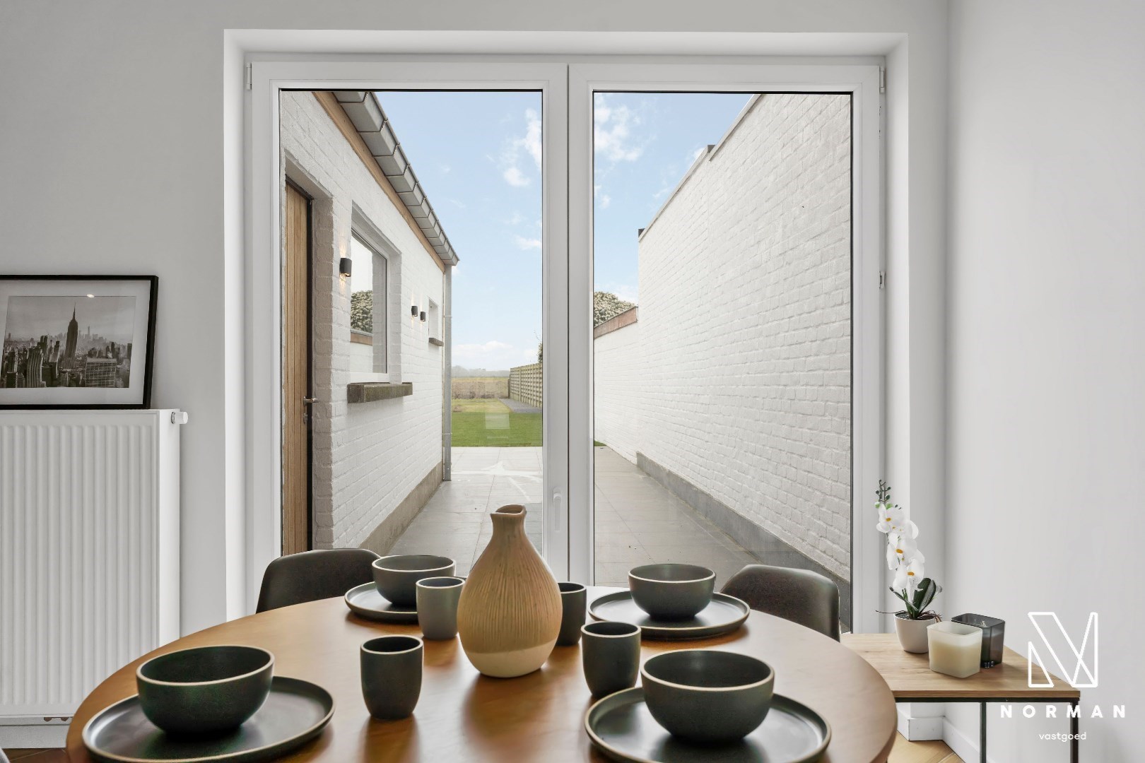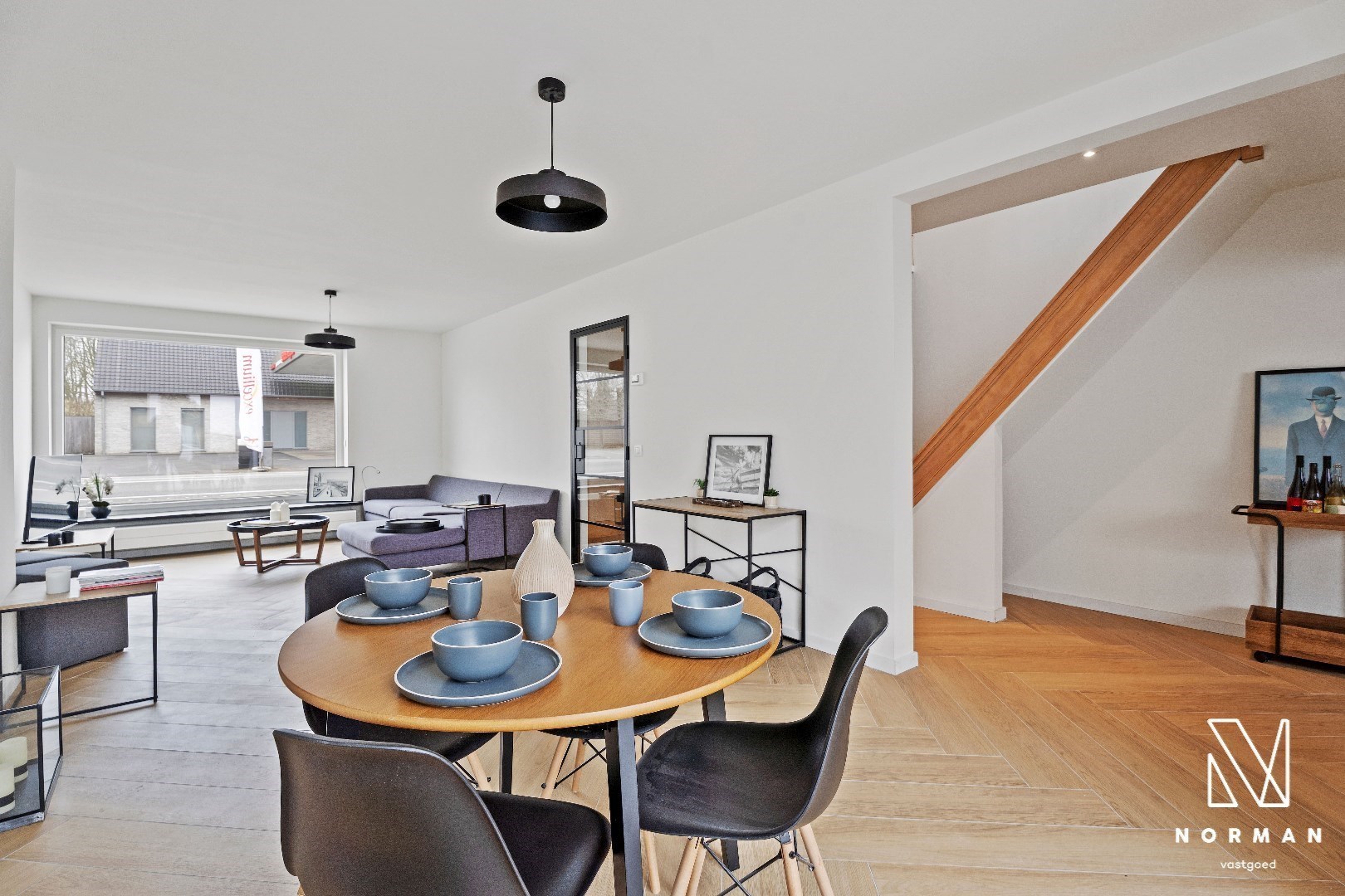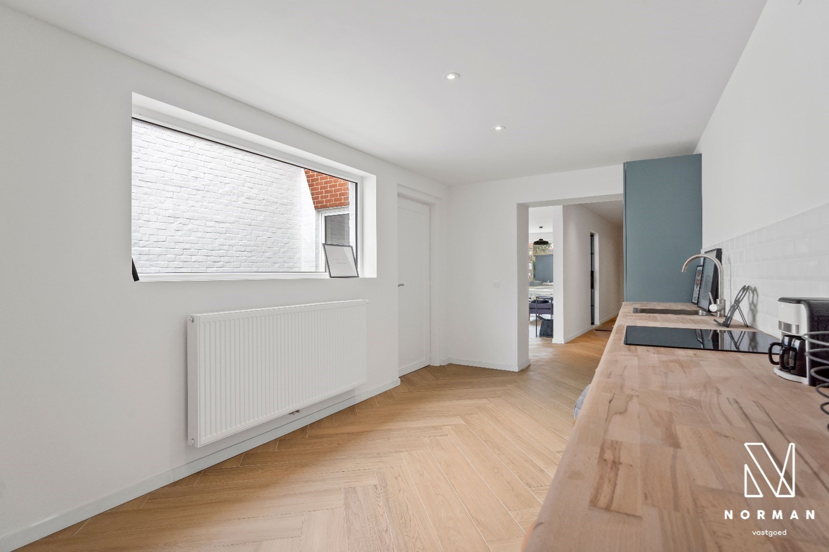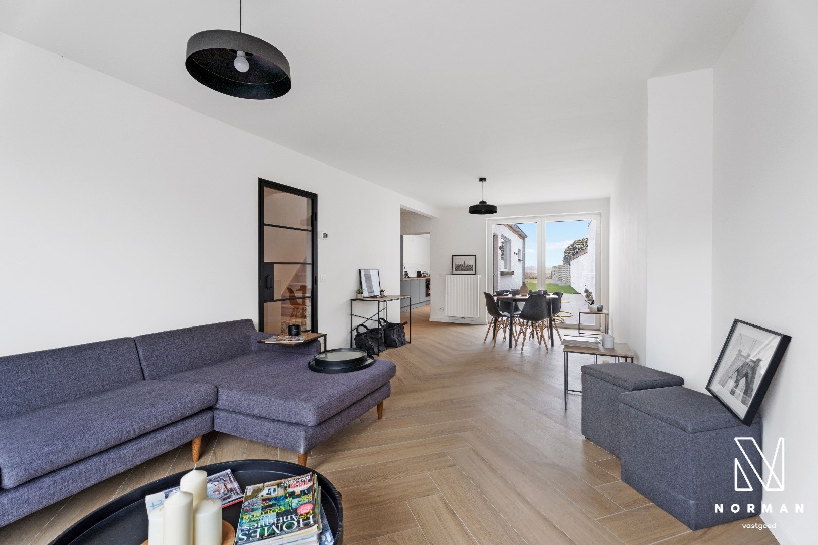 Bij aankomst wordt u verwelkomd in de ruime leef- en zitruimte, waar grote raampartijen zorgen voor veel lichtinval en een mooi zicht op de grote tuin met vernieuwd terras en verzorgde grasmat. Aansluitend vindt u de volledig uitgeruste keuken, voorzien van alle nodige toestellen, met toegang tot een praktische berging en een afzonderlijk toilet.