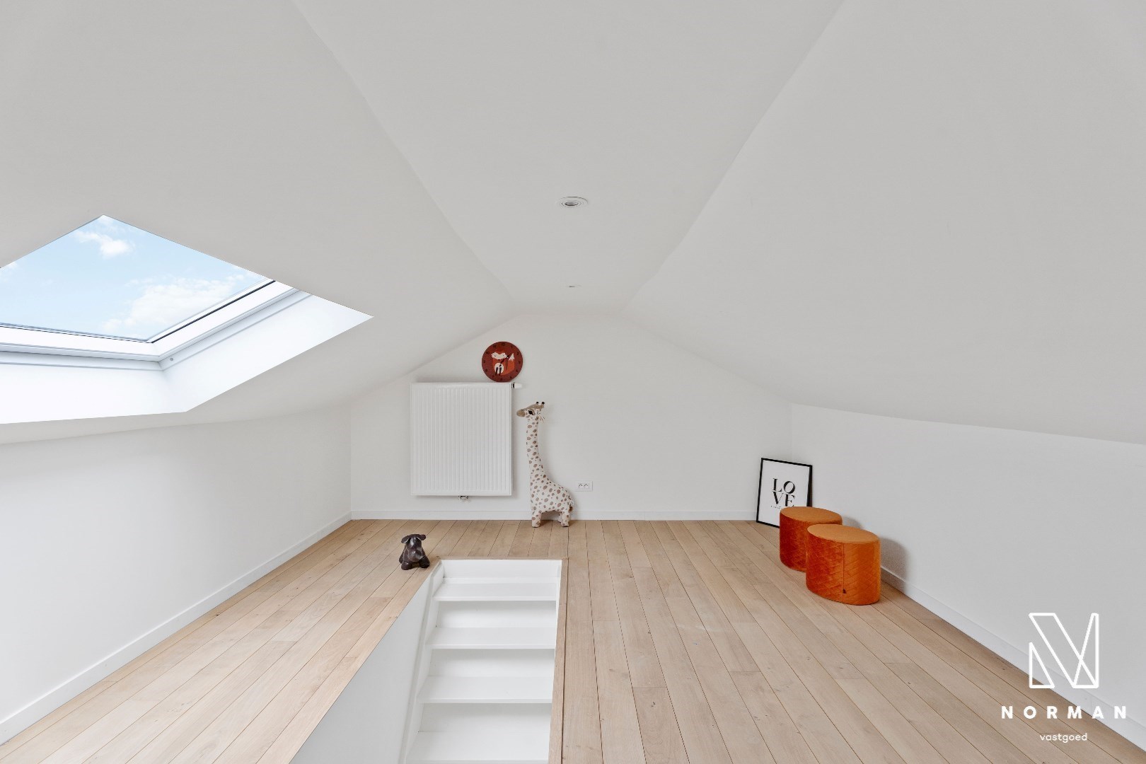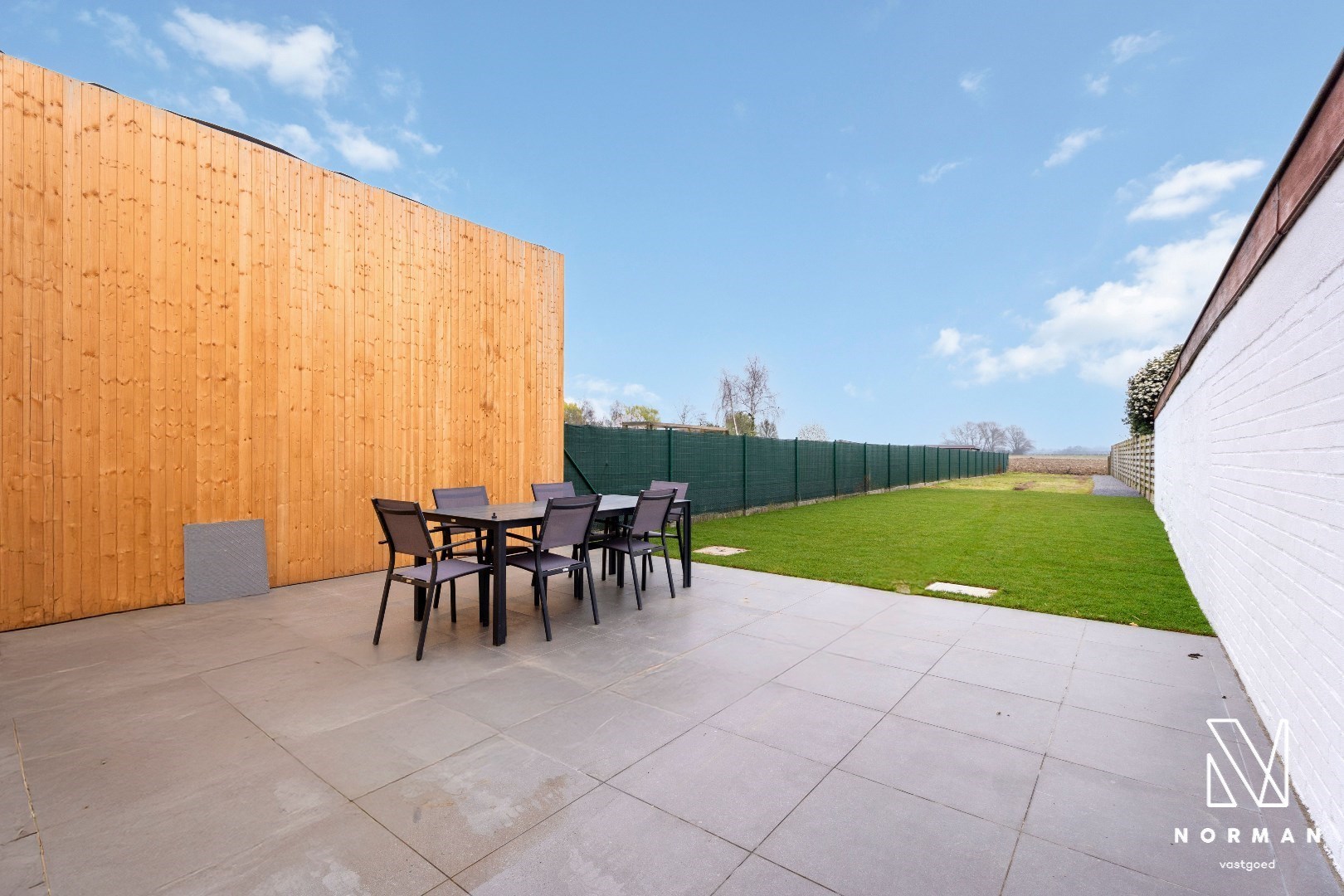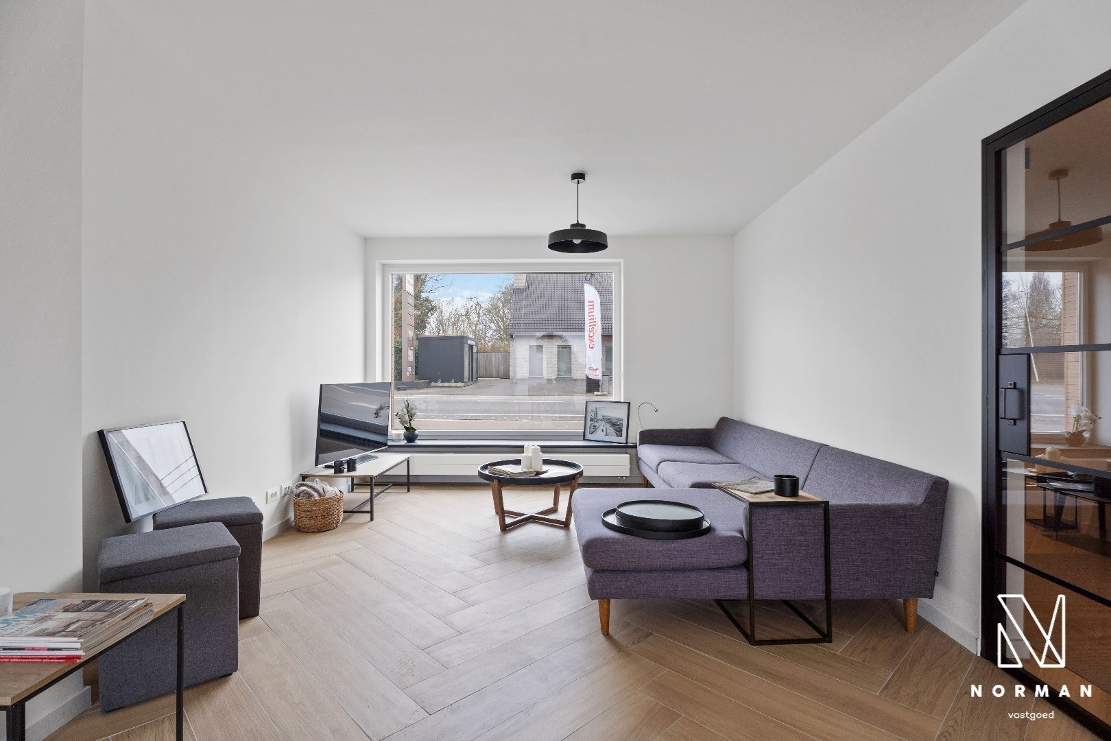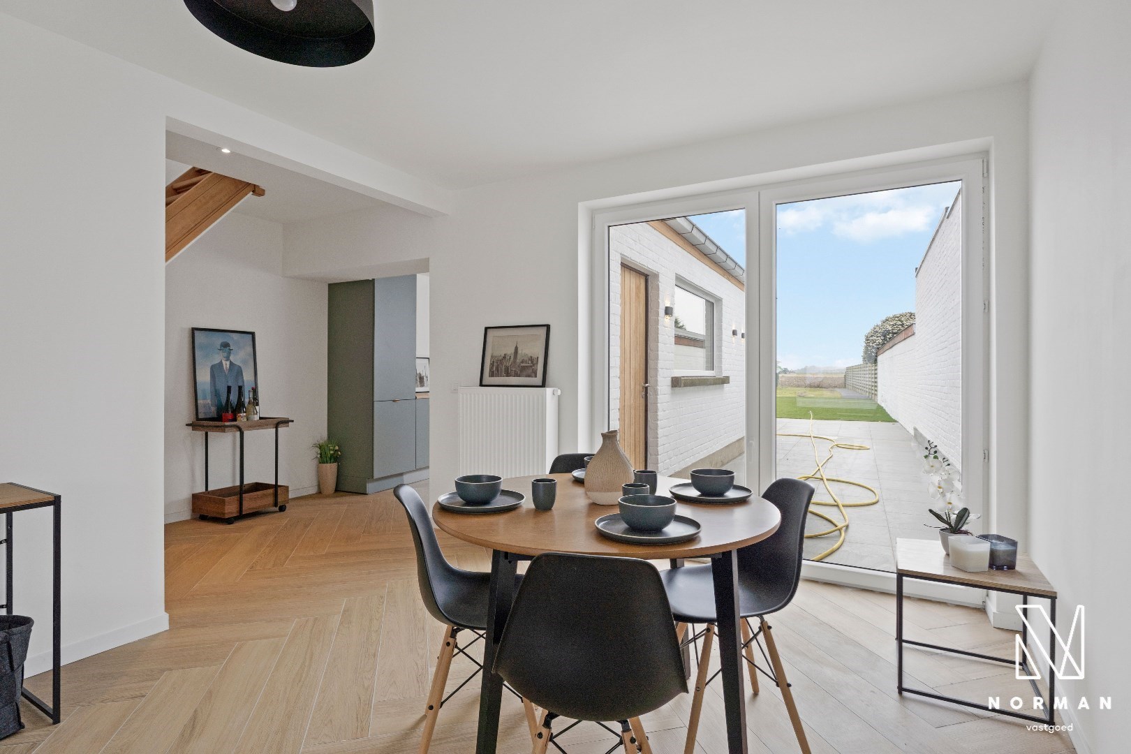 Bij aankomst wordt u verwelkomd in de ruime leef- en zitruimte, waar grote raampartijen zorgen voor veel lichtinval en een mooi zicht op de grote tuin met vernieuwd terras en verzorgde grasmat. Aansluitend vindt u de volledig uitgeruste keuken, voorzien van alle nodige toestellen, met toegang tot een praktische berging en een afzonderlijk toilet.