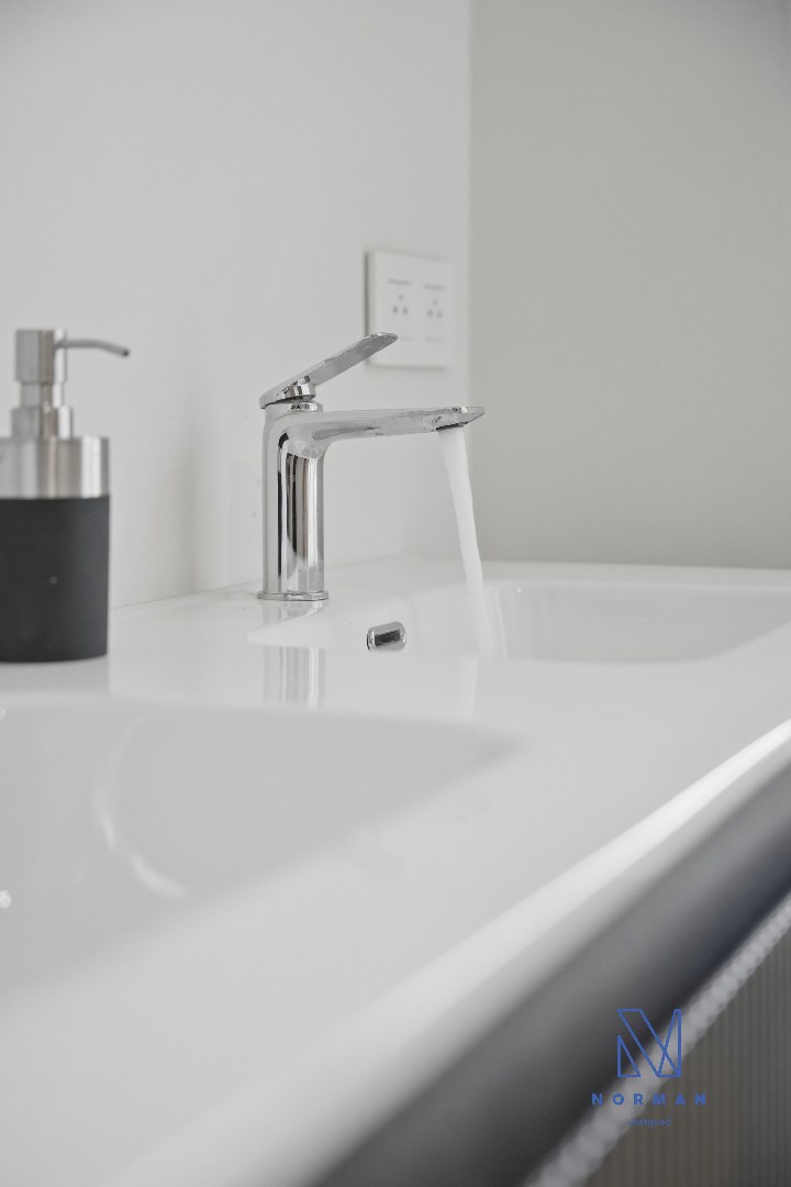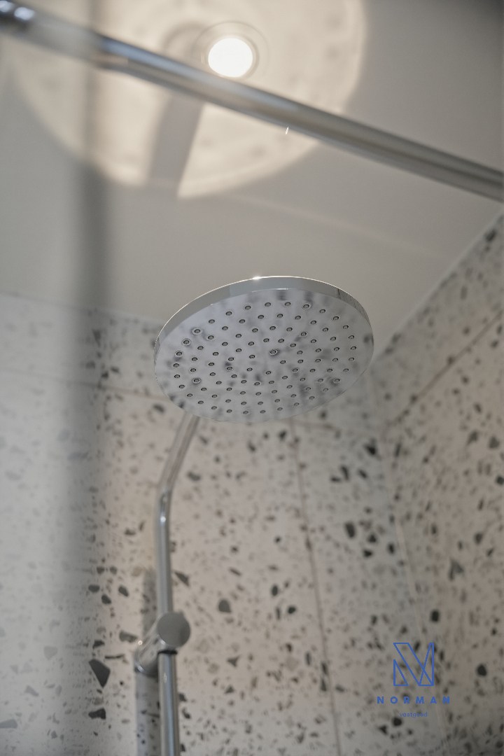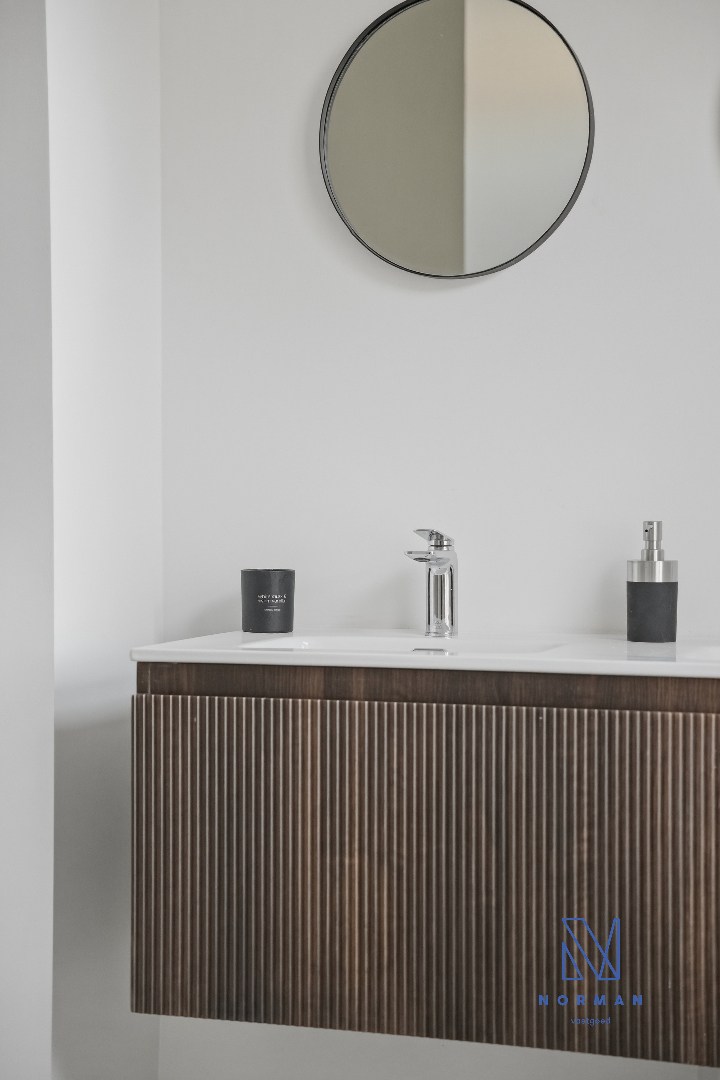 Op de eerste verdieping vind je rechts een bergruimte met ingemaakte kasten. Verder is er een ruime badkamer met dubbele lavabo, inloopdouche en ligbad. Op deze verdieping bevindt zich eveneens de master bedroom.