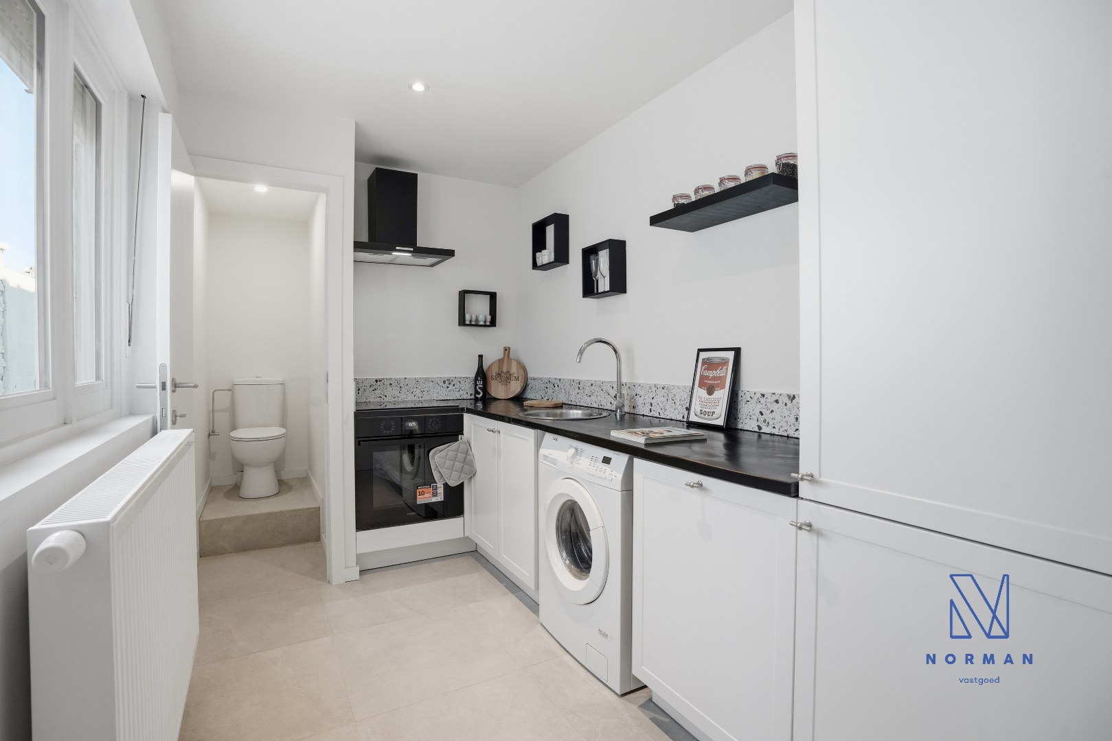 Bij het betreden van de woning kom je in de inkomhal, die via een stijlvolle stalen deur toegang geeft tot de lichtrijke leefruimte. De woning is overal voorzien van centrale verwarming op gas. Aansluitend bevindt zich de volledig uitgeruste keuken, waar ook een apart gastentoilet aanwezig is. Daarnaast is er een praktische kelder.