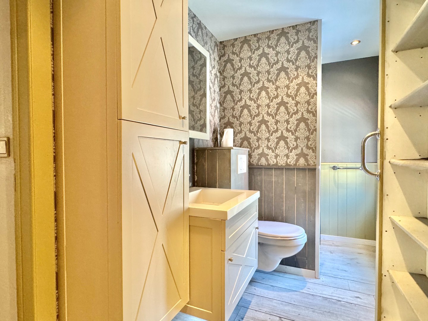 Naast de leefruimte bevindt zich de keuken met daarnaast een extra bergruimte en toilet. Verder is er op het gelijkvloers ook een doorgang voor de kelder.