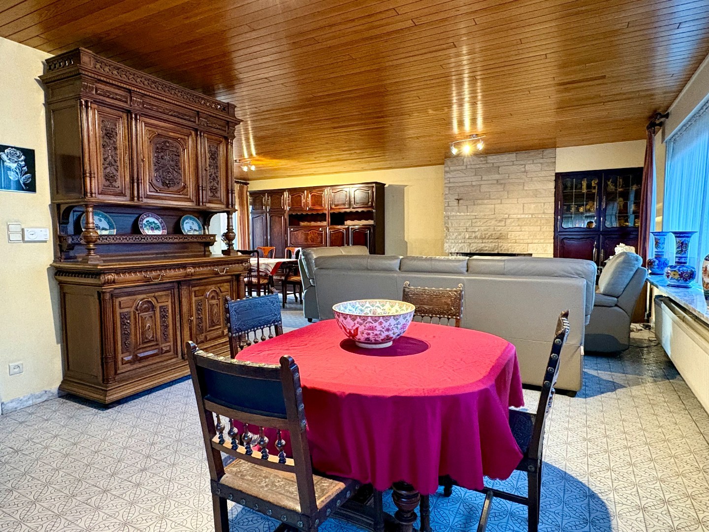 Vervolgens kom je in de lichtrijke leefruimte, uitgerust met centrale verwarming en een gezellige houtkachel. Vanuit de leefruimte geniet je van een mooi zicht op de zuidoost-georiënteerde tuin.