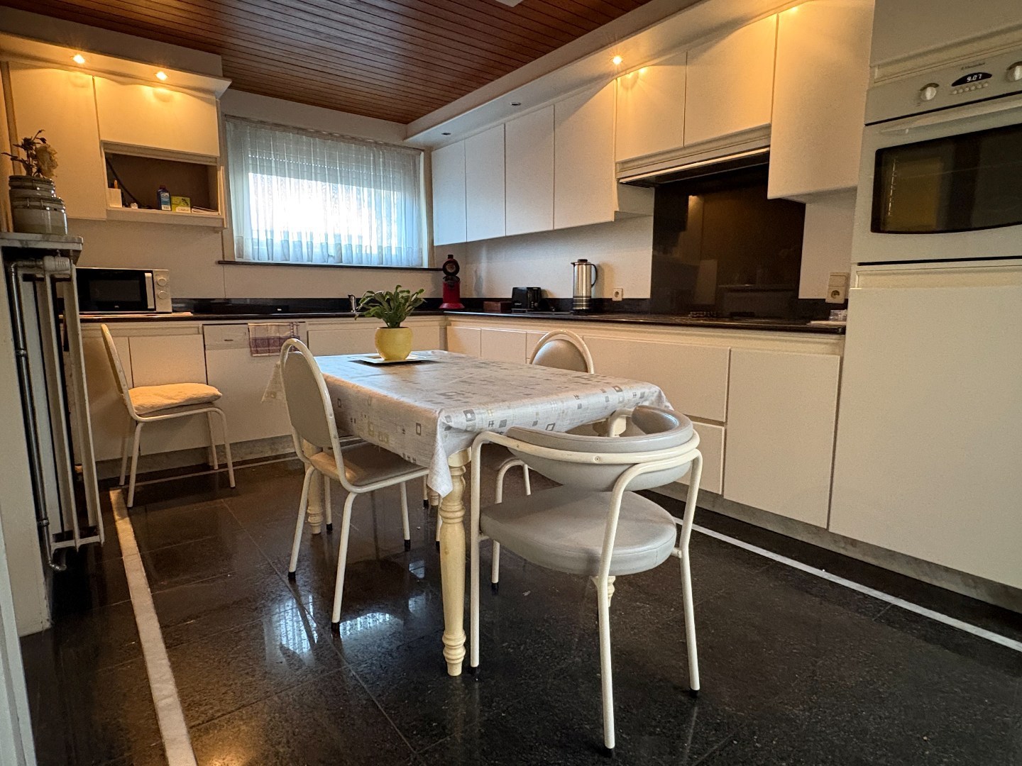 Aansluitend bevindt zich de vernieuwde keuken, van waaruit je rechtstreeks toegang hebt tot de tuin. Verder is er nog een inpandige garage die omgebouwd kan worden tot bureauruime of praktijkruimte.