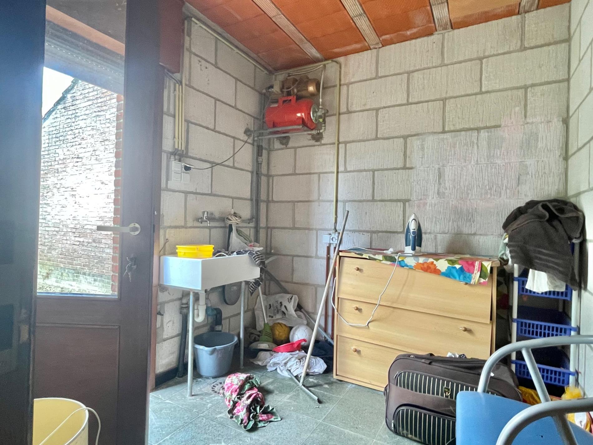 Vooraan vinden we een ruime oprit, de inkom, een ontvangstruimte, de keuken, een kelder, de badkamer, de slaapkamer, toilet en berging met doorgang naar de tuin.