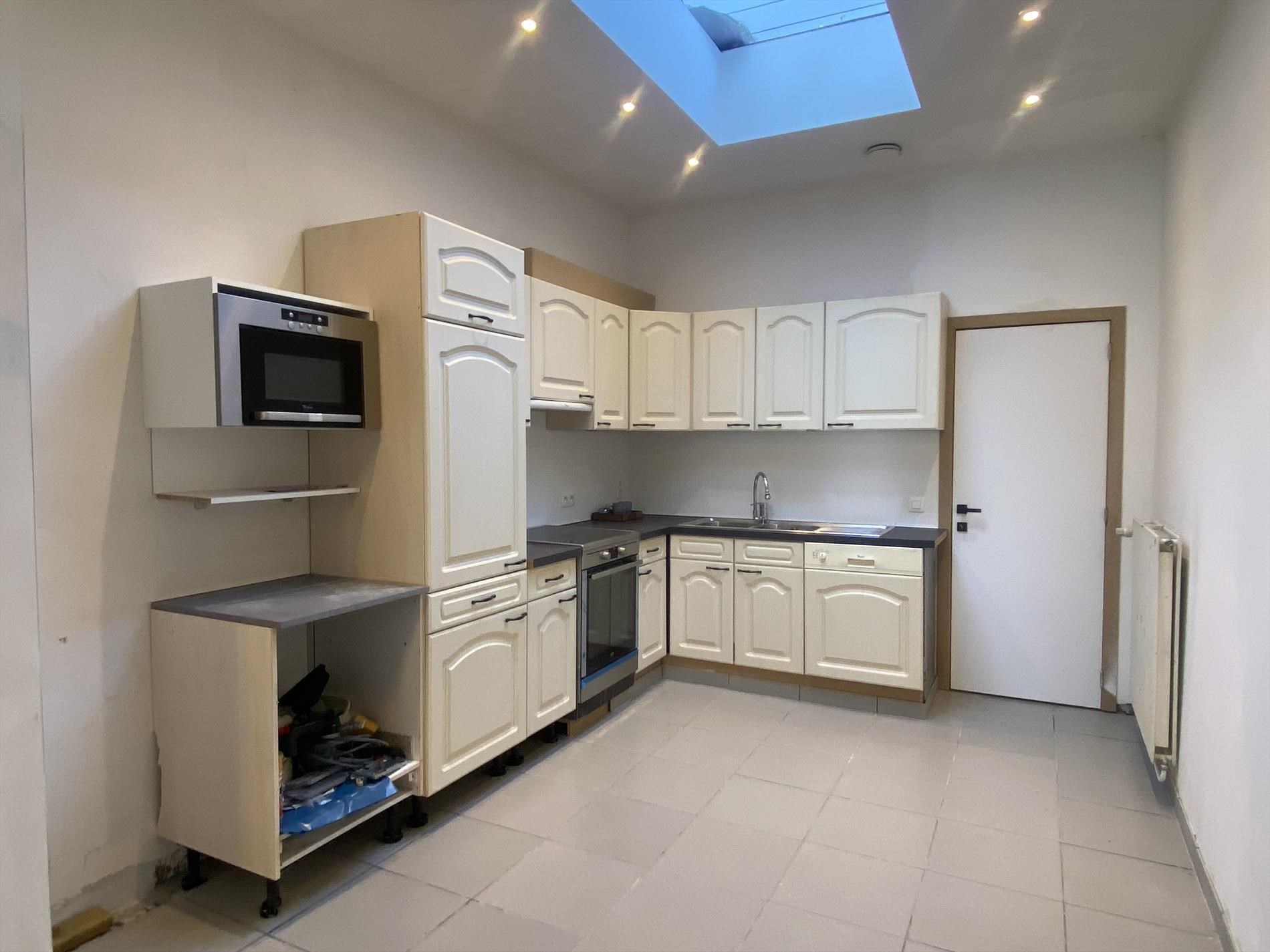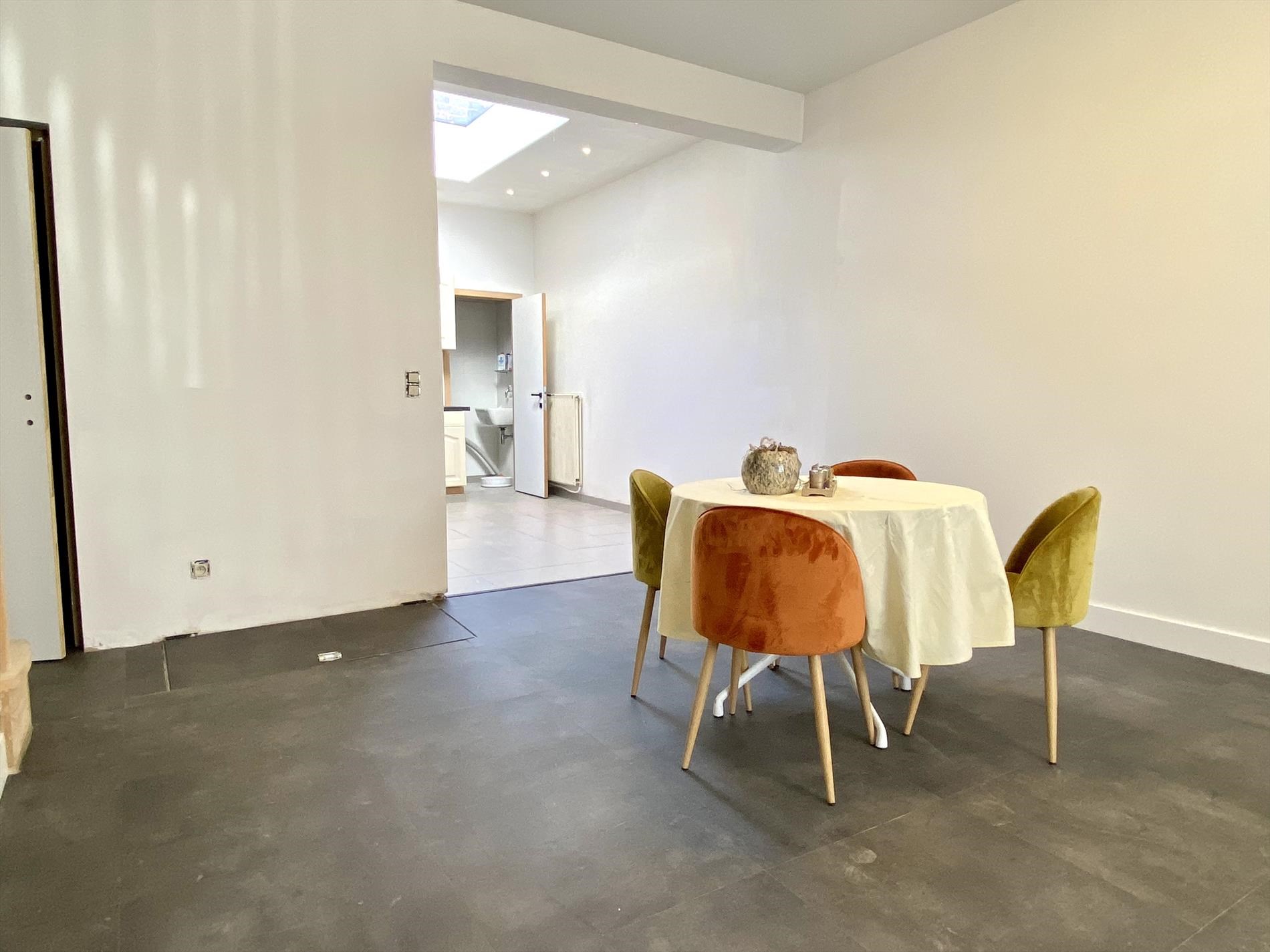 Bij het binnenkomen hebben we na de inkomhal meteen een apart gastentoilet, lopen we door komen we uit in de ruime leefruimte met aanpalend een open keuken met een gezellig lichtinval dankzij de koepel. Aanpalend aan de keuken bevindt zich ook een technische ruimte die kan dienen als opslag maar ook als wasplaats aangezien er aansluiting zit voor een wasmachine. Op het gelijkvloers hebben we ook nog de volledige vernieuwde, trendy badkamer.
