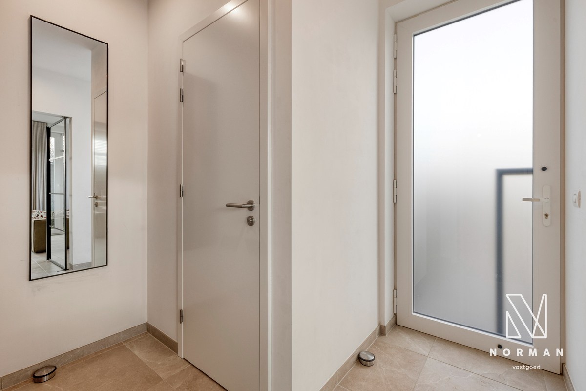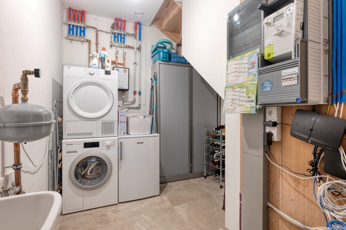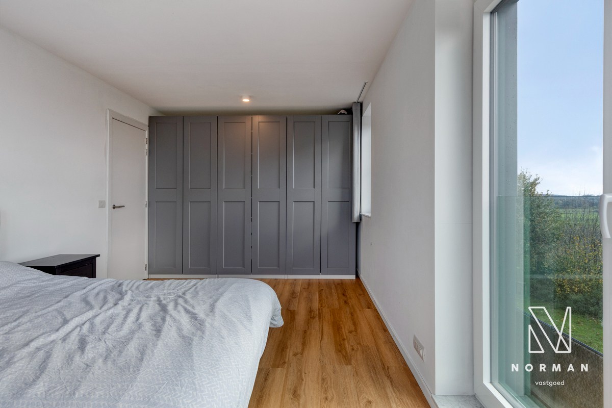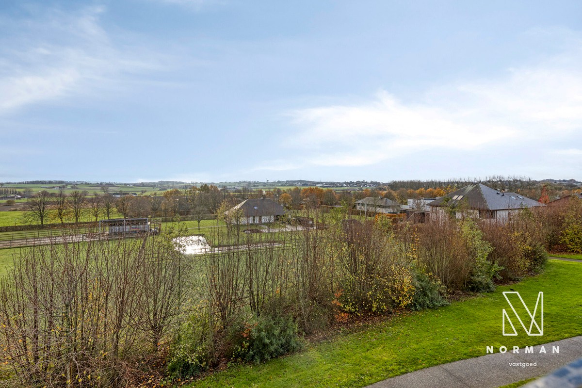 Via de inkomhal met apart toilet, maatkasten/vestiaire en ruime berging kom je binnen in de leefruimte, gescheiden door een stijlvolle stalen deur. De extra grote raampartijen halen het landelijke uitzicht volledig naar binnen en laten de toch al royale ruimte nog groter aanvoelen. Is het de combinatie met de hoge plafonds of de overvloed aan licht die deze leefruimte zo aangenaam maakt? De open keuken is uitgerust met de nieuwste toestellen en beschikt over veel opbergruimte.