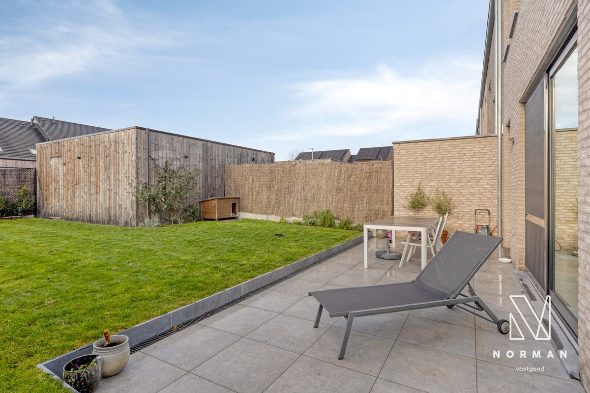 De tuin is volledig omheind en beschikt over een groot zonneterras, aangevuld met een kleiner terras aan de zijkant van de woning. Daarnaast is er een garage met uitweg.