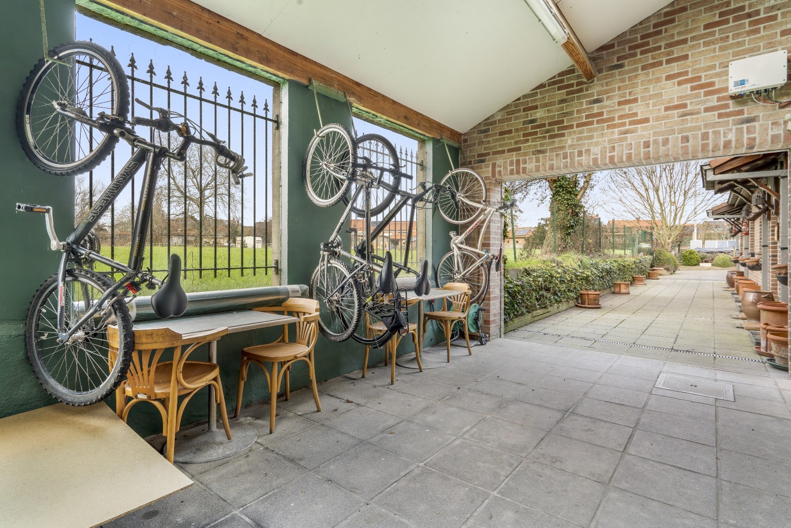 Aan de achterzijde van het pand bevinden zich zes grote kamers, ideaal voor logies of verhuur, gelegen aan een verharde koer met prachtig, landelijk uitzicht op het omliggende groen.