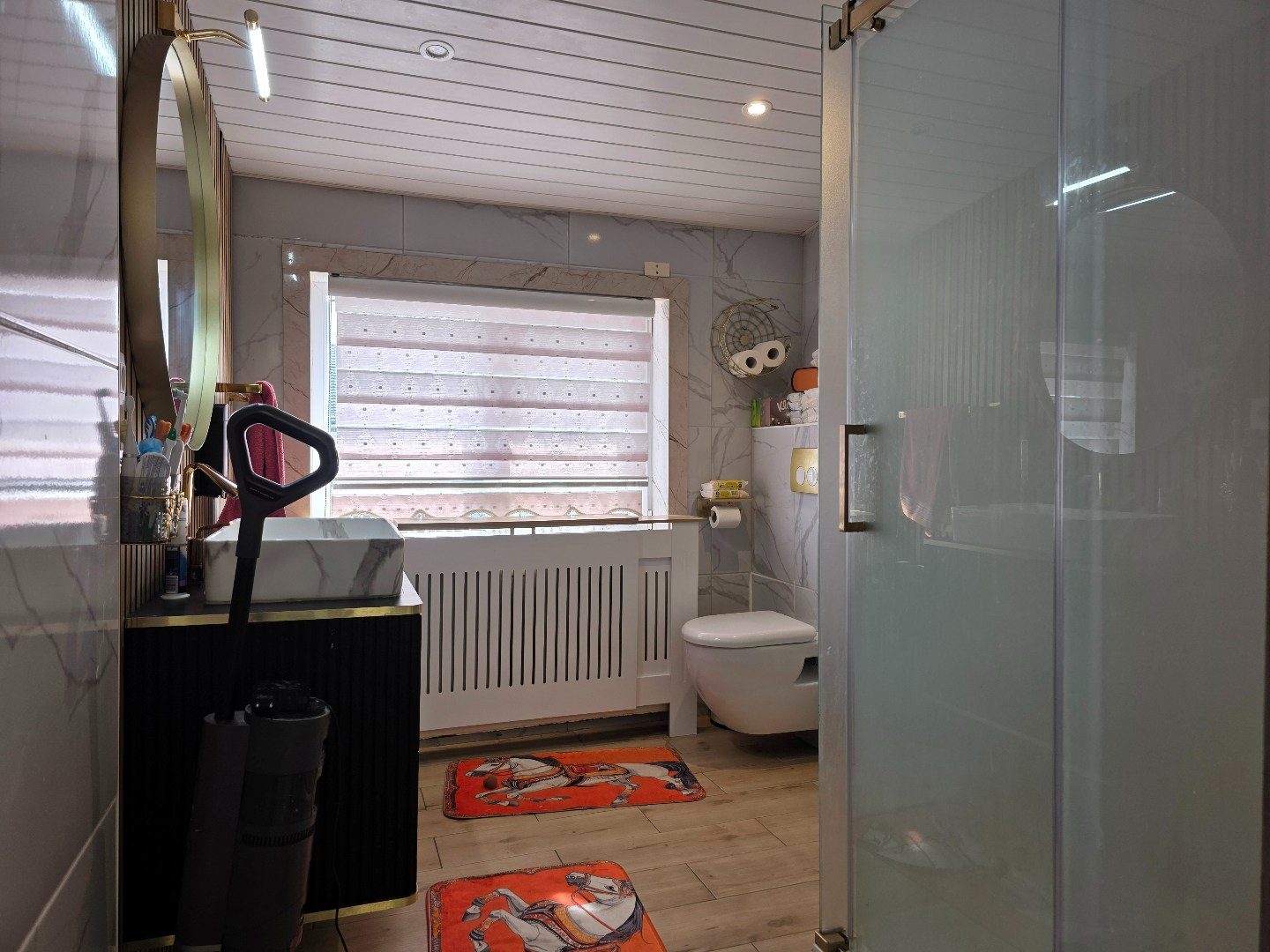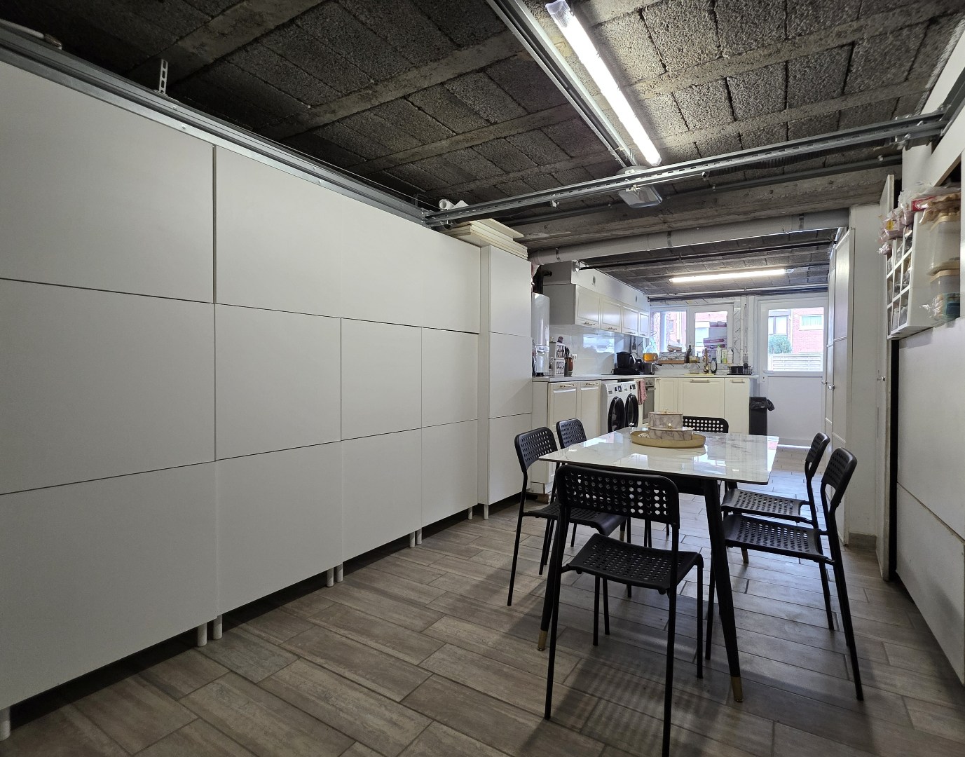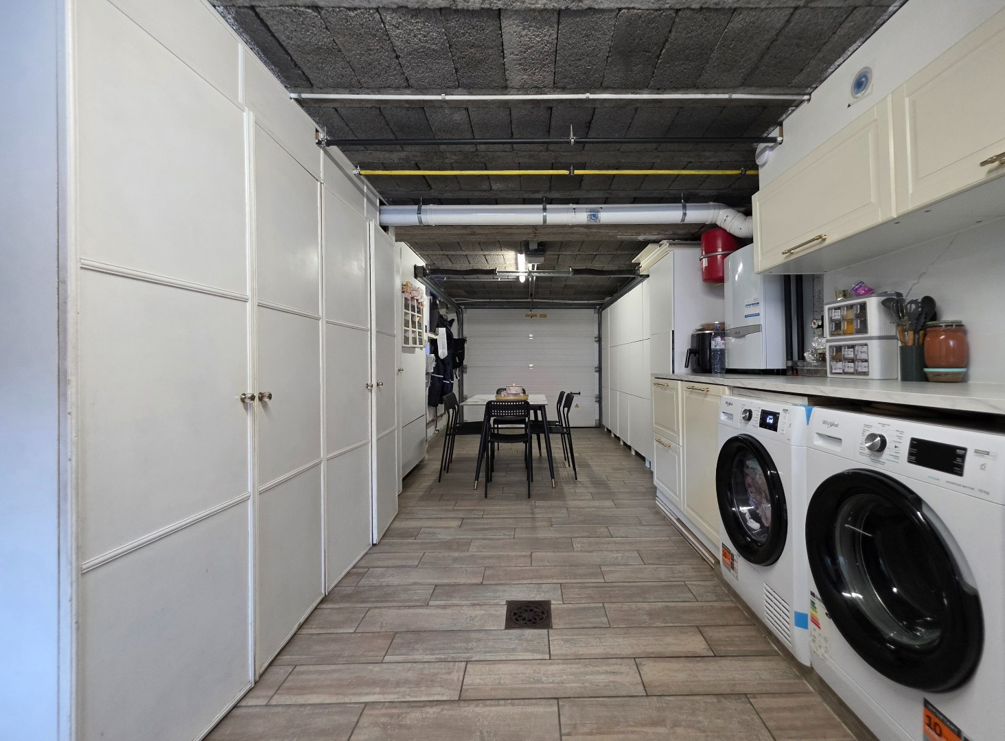 Op de gelijkvloerse verdieping vinden we nóg een luxueuze badkamer met lavabo, douche en toilet. Onder de trap is er handige opbergruimte voorzien. Daarnaast is er nog een zeer ruime inpandige garage (met elektrische poort) die dienst kan doen als was- en opbergruimte maar die ook keukenvoorzieningen heeft. Er is een rechtstreekse toegang tot de ruime tuin.