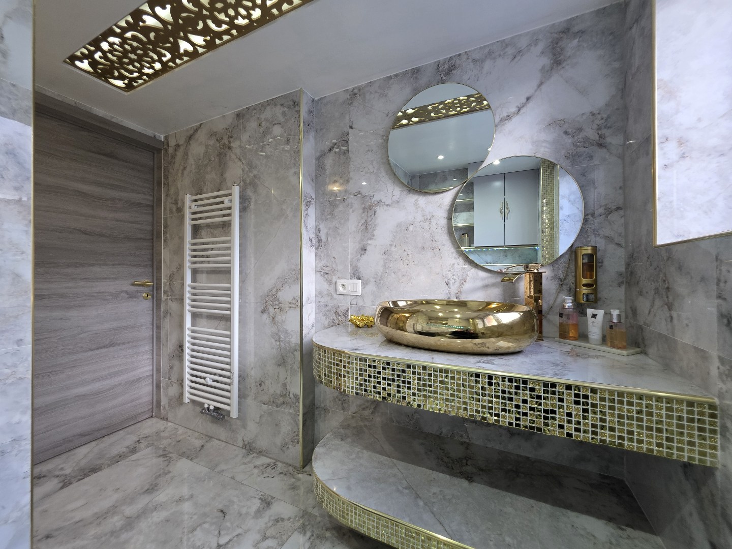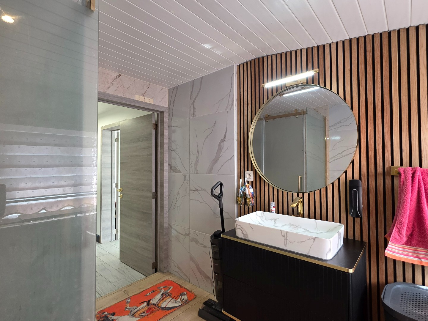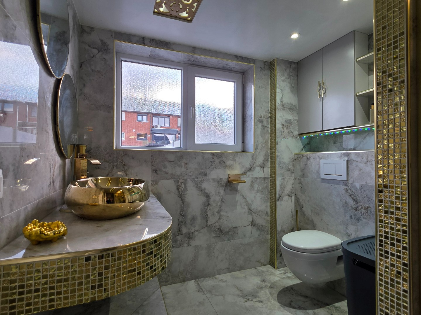Op de gelijkvloerse verdieping vinden we nóg een luxueuze badkamer met lavabo, douche en toilet. Onder de trap is er handige opbergruimte voorzien. Daarnaast is er nog een zeer ruime inpandige garage (met elektrische poort) die dienst kan doen als was- en opbergruimte maar die ook keukenvoorzieningen heeft. Er is een rechtstreekse toegang tot de ruime tuin.
