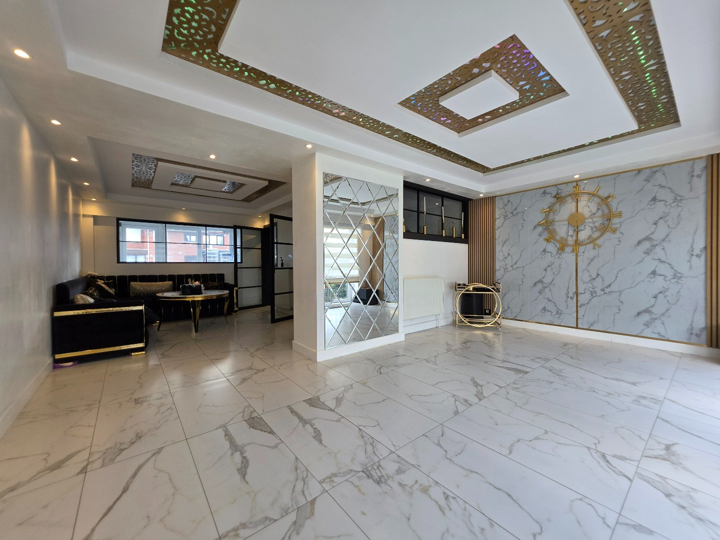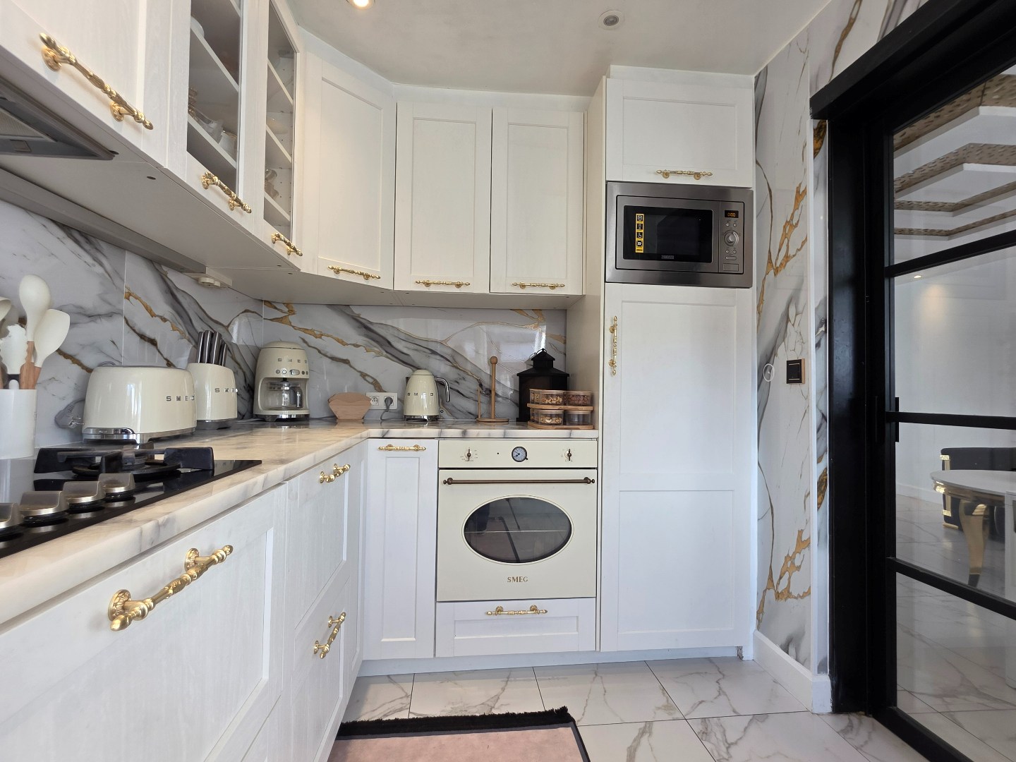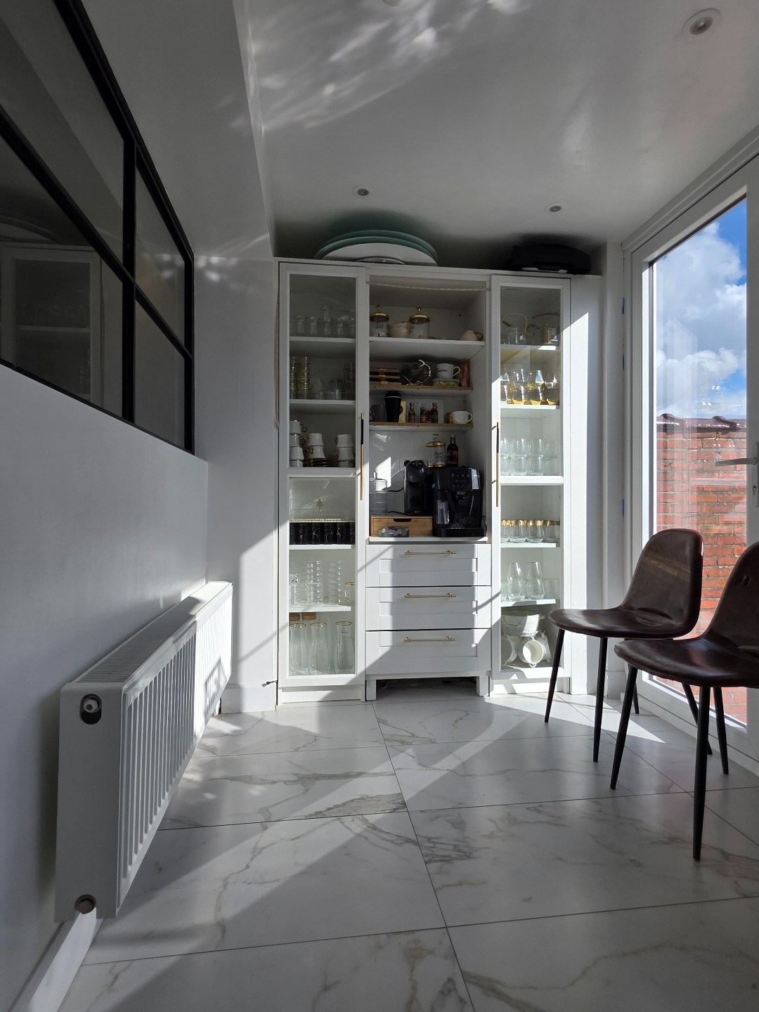 We komen deze volledig gerenoveerde bel-étagewoning binnen via de uitnodigende hall. Op de eerste verdieping vinden we de lichtrijke, ruime leef- en zitkamer, een tot in de puntjes ingerichte keuken en een aanpalende zonnekamer met zicht op de tuin.