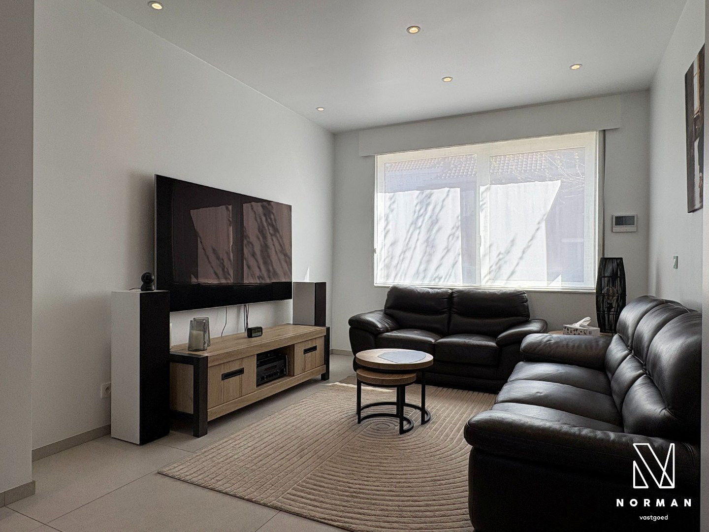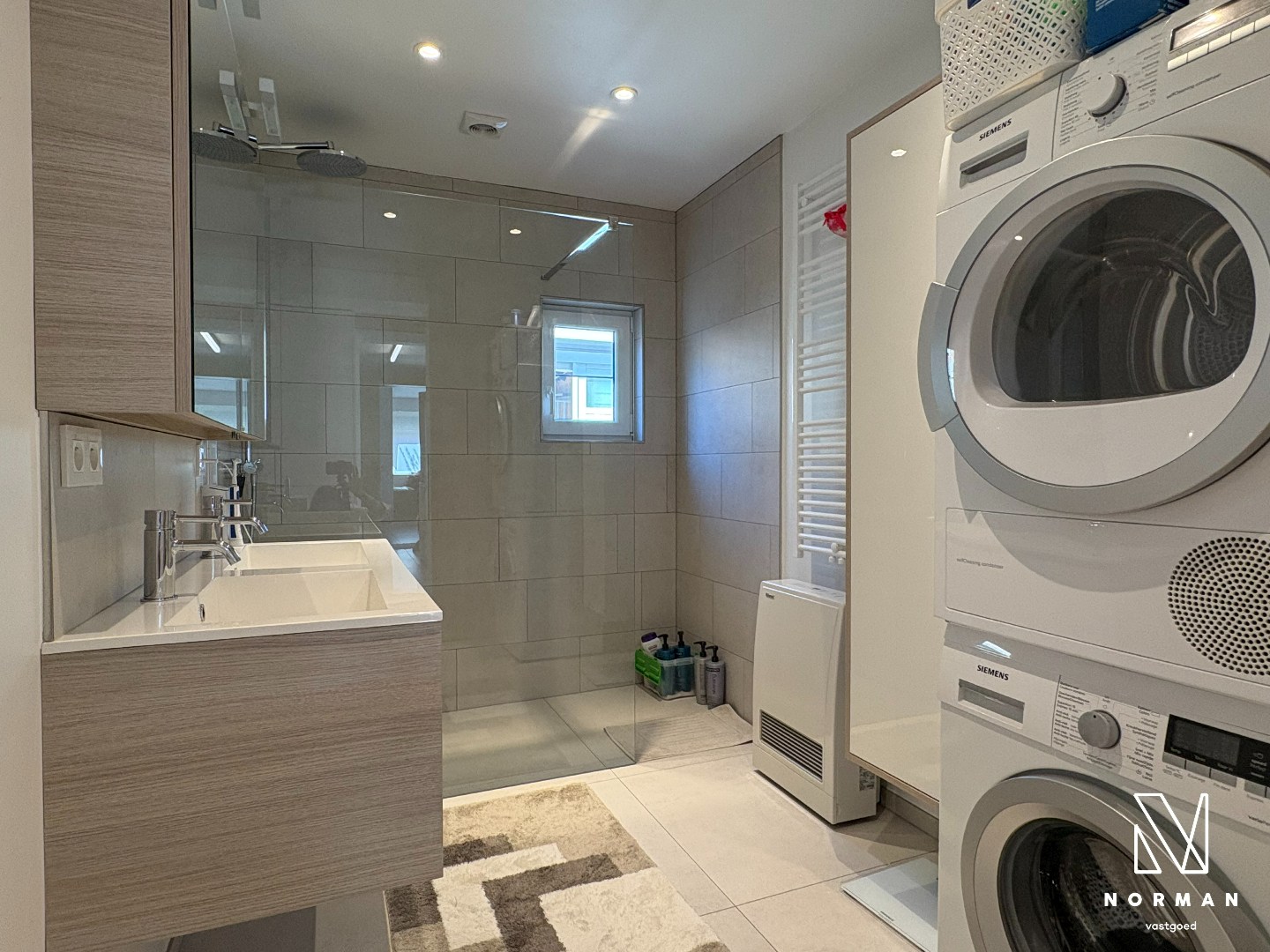 We komen de woning binnen via een mooie hall die toegang geeft tot de zeer lichtrijke leefruimte met eetplaats. De aangrenzende op maat gemaakte keuken is praktisch ingericht en voorzien van alle toestellen. In de badkamer vinden we een mooi meubel met dubbele lavabo en een luxueuze inloopdouche. Er is een afzonderlijk toilet.