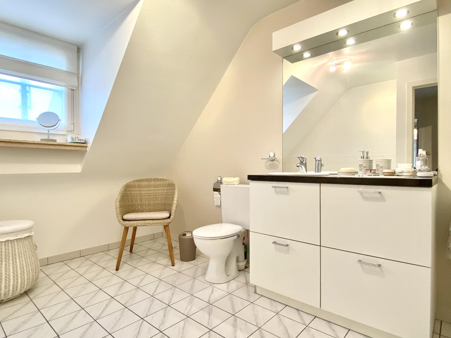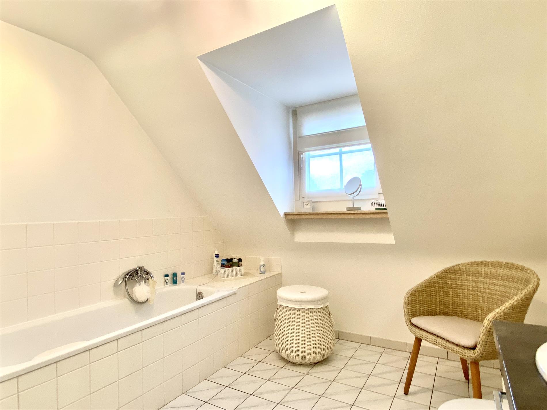 Het verdiep bevat 3 grote slaapkamers en een badkamer. Deze bevat een ligbad, toilet en wastafel.