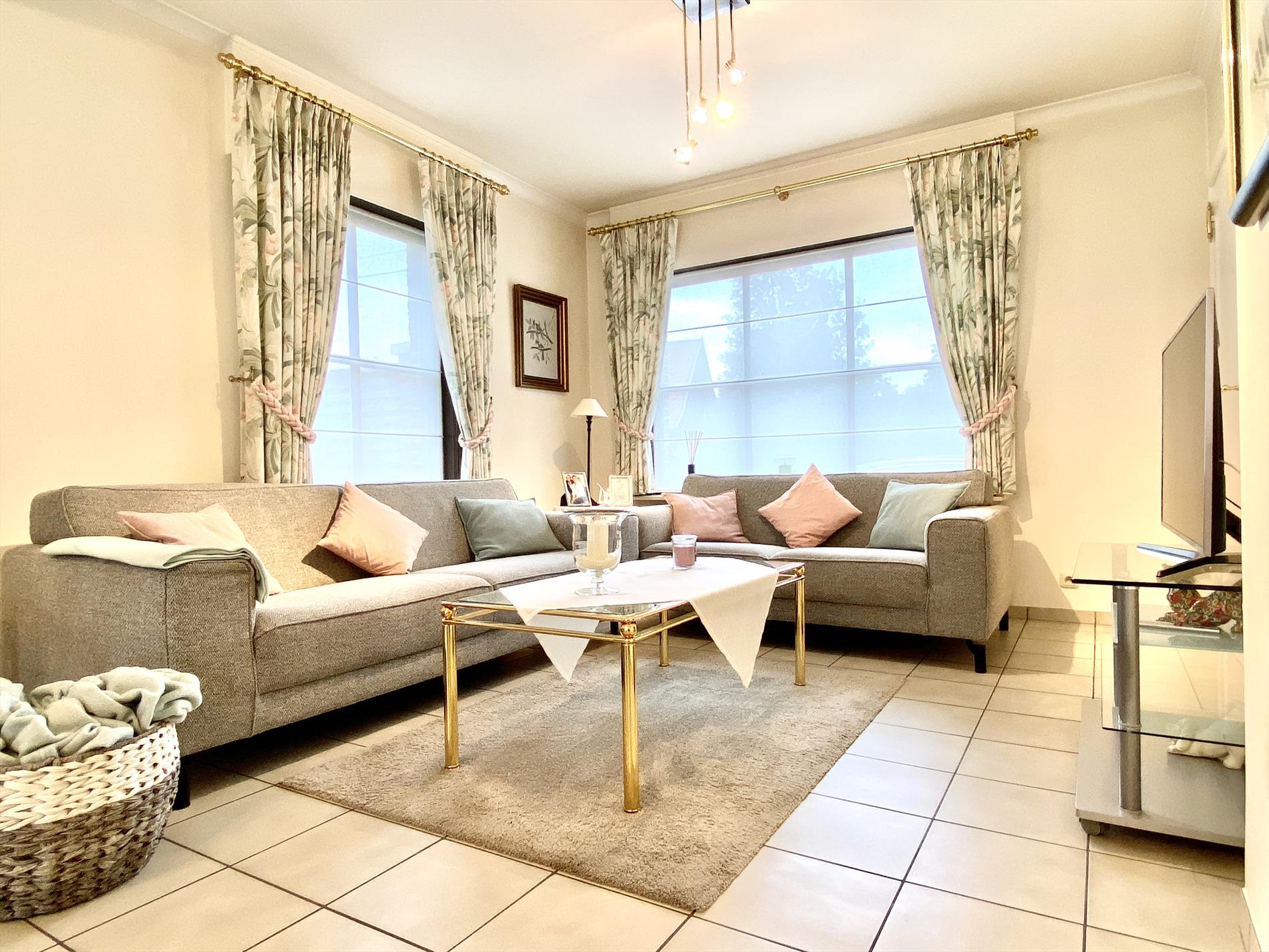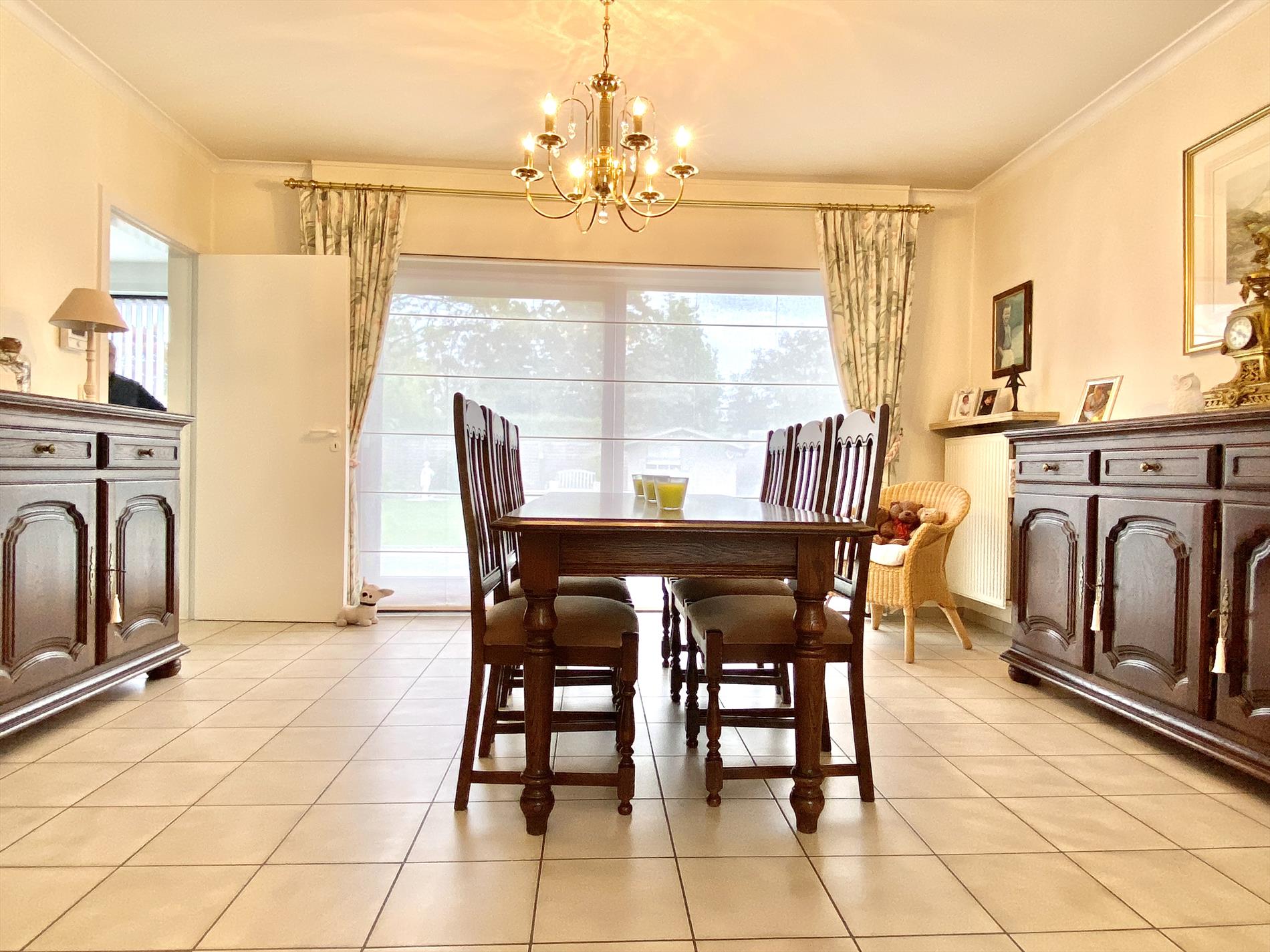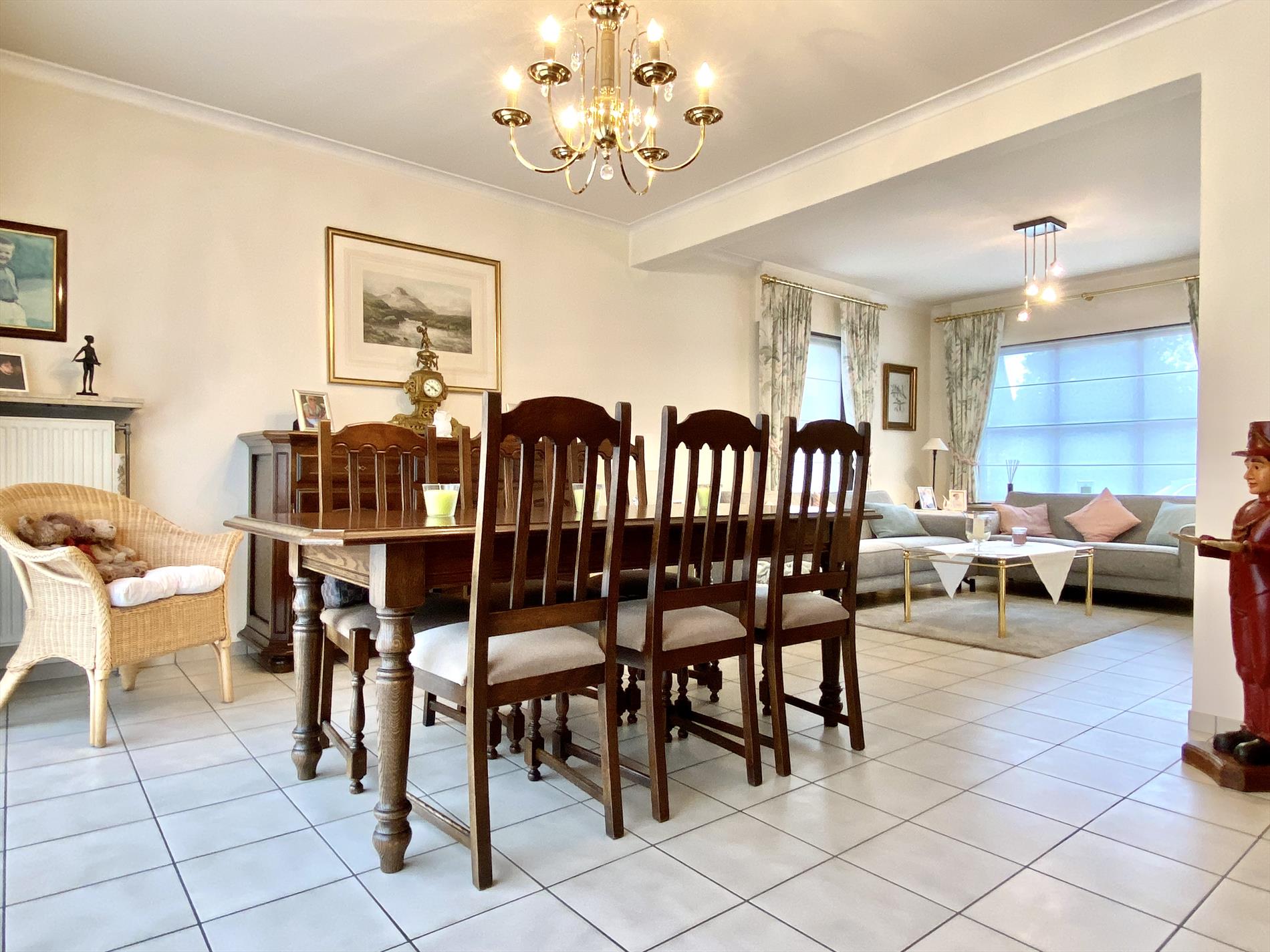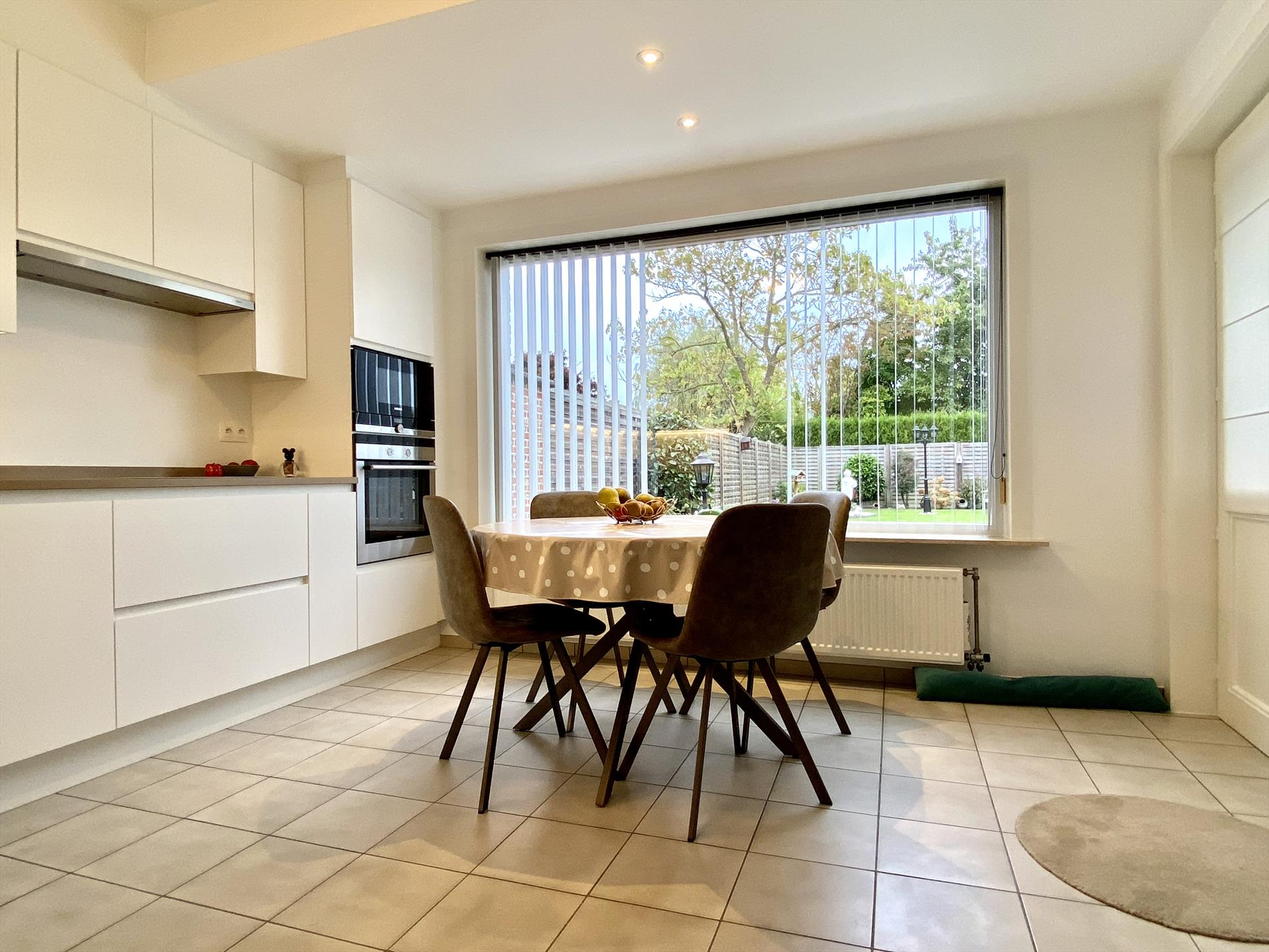 Inkom met apart toilet en trap naar het verdiep. De leefruimte is een lichtrijk geheel en biedt een mooi zicht over terras en tuin. Deze leefruimte heeft de mogelijkheid om een haard bij te plaatsen. De aanpalende keuken is ruim. Vele kasten, recent vernieuwd, indirecte verlichting, TOPPER,.. Verder is er de garage met bijhorende wasruimte.