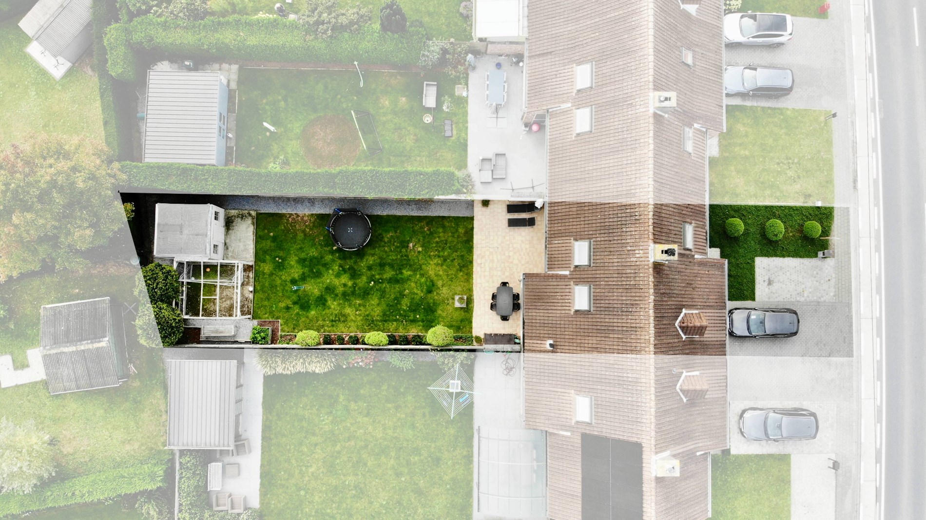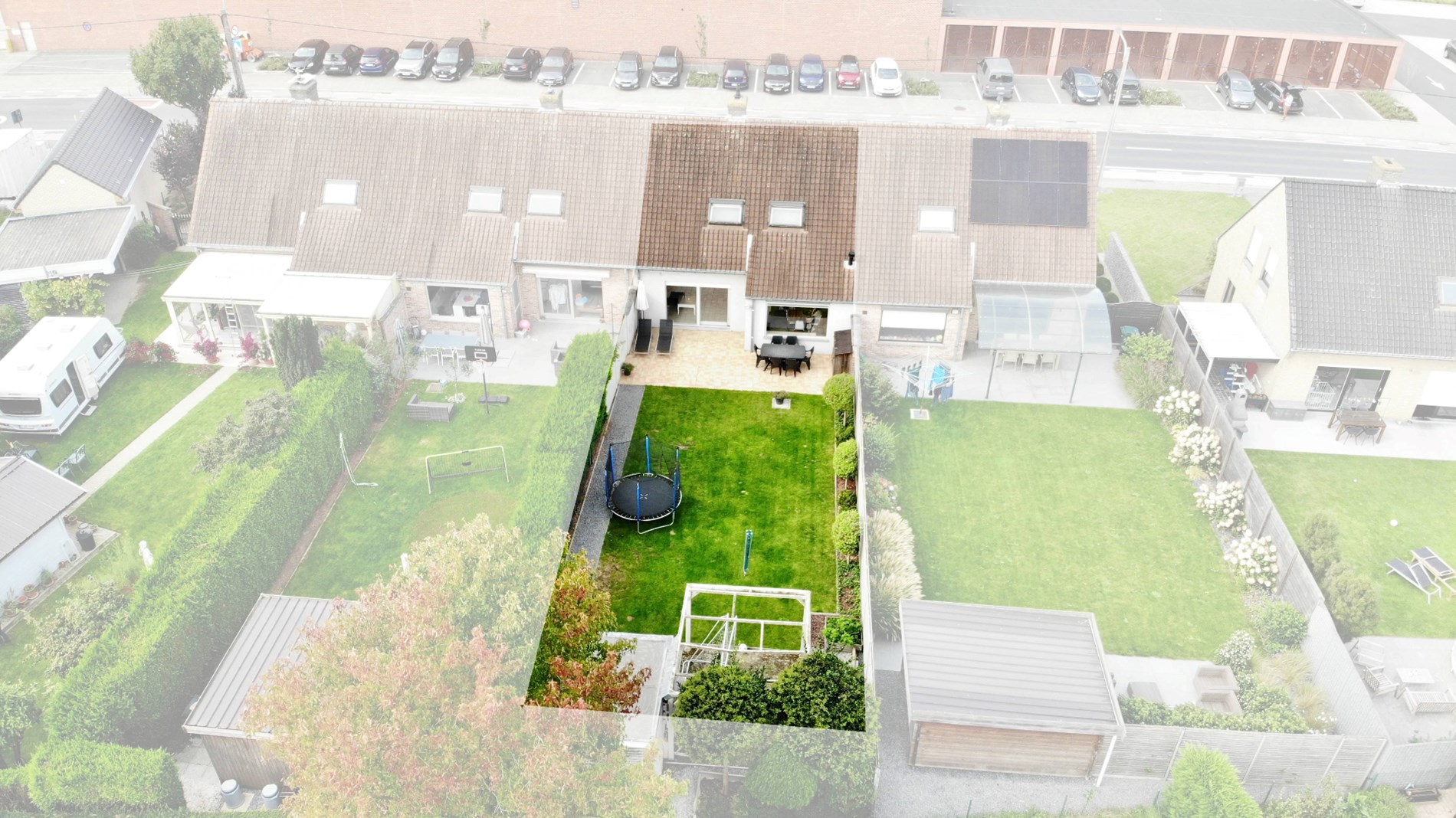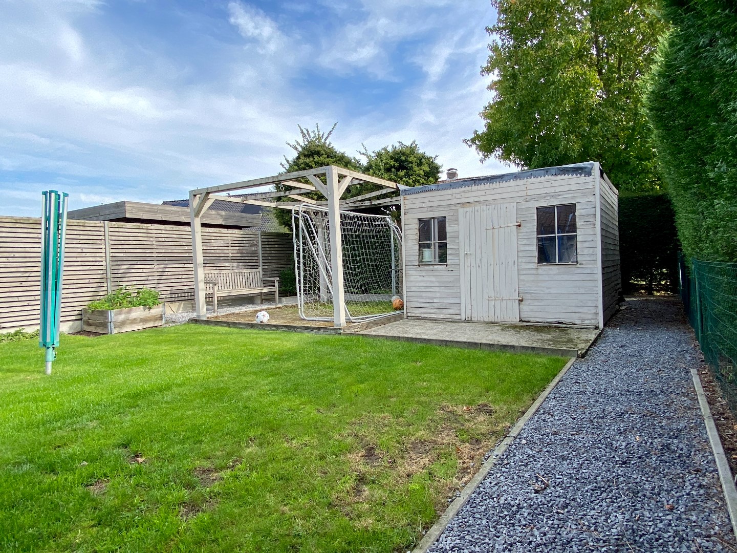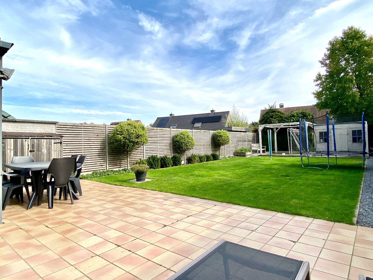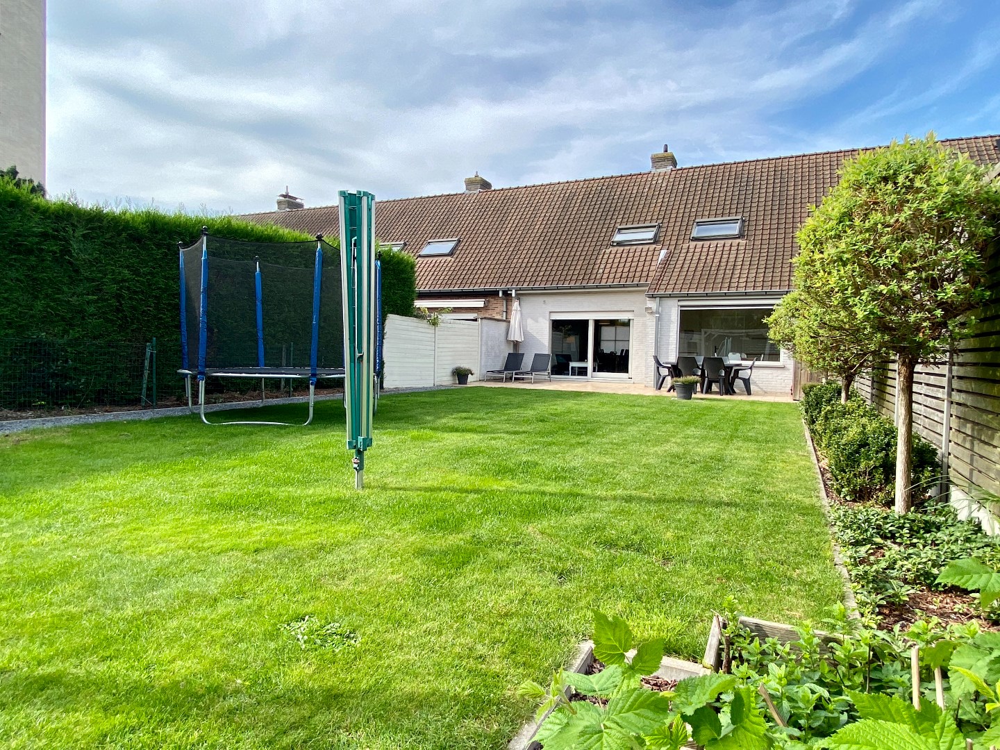 De tuin is volledig omheind, heeft een groot terras en tuinhuis.
