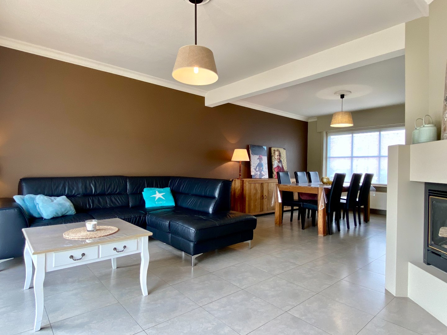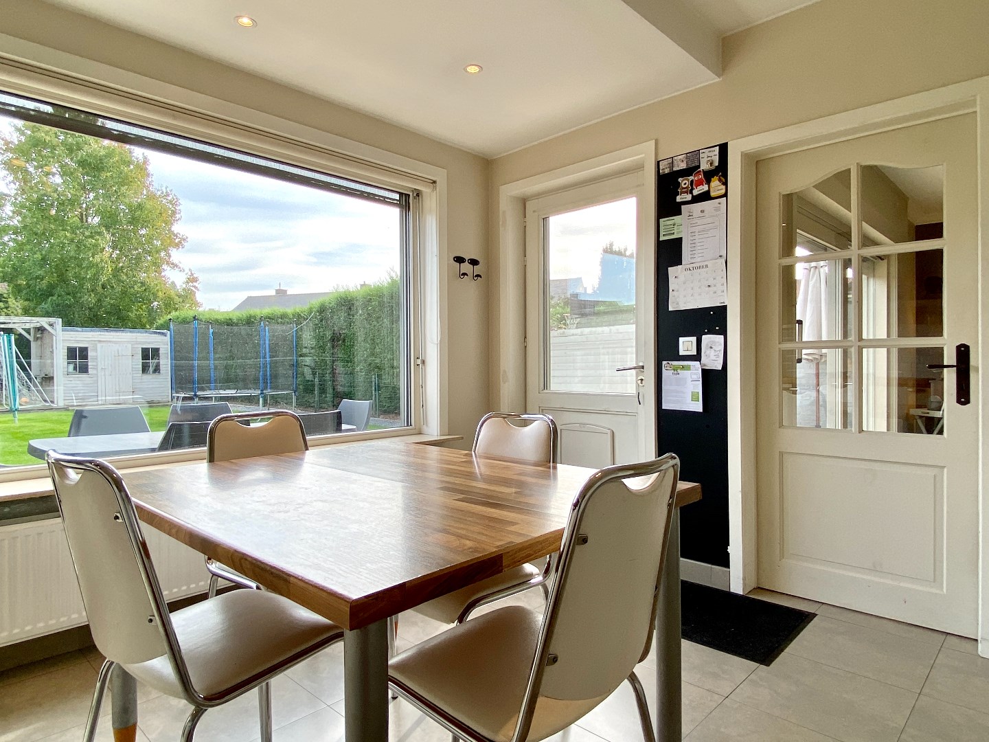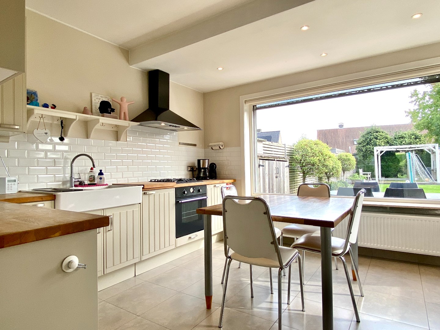 Inkom met apart toilet, leefruimte met grote raampartijen en centrale gashaard. De leefruimte is een mooie overgang tussen terras/tuin en aanpalende leefkeuken. De keuken is volledig geïnstalleerd en is groot genoeg voor het plaatsen van eettafel en dergelijke. Om de hoek is er de ruime garage met was- en droogkastvoorziening.
