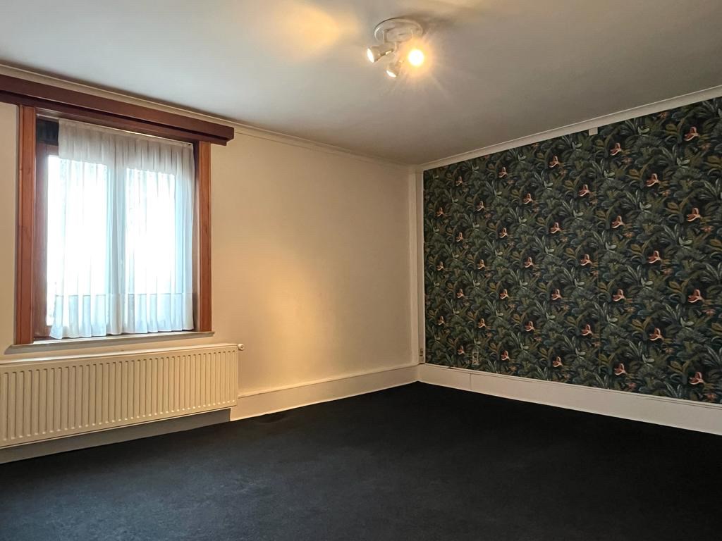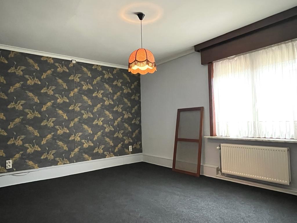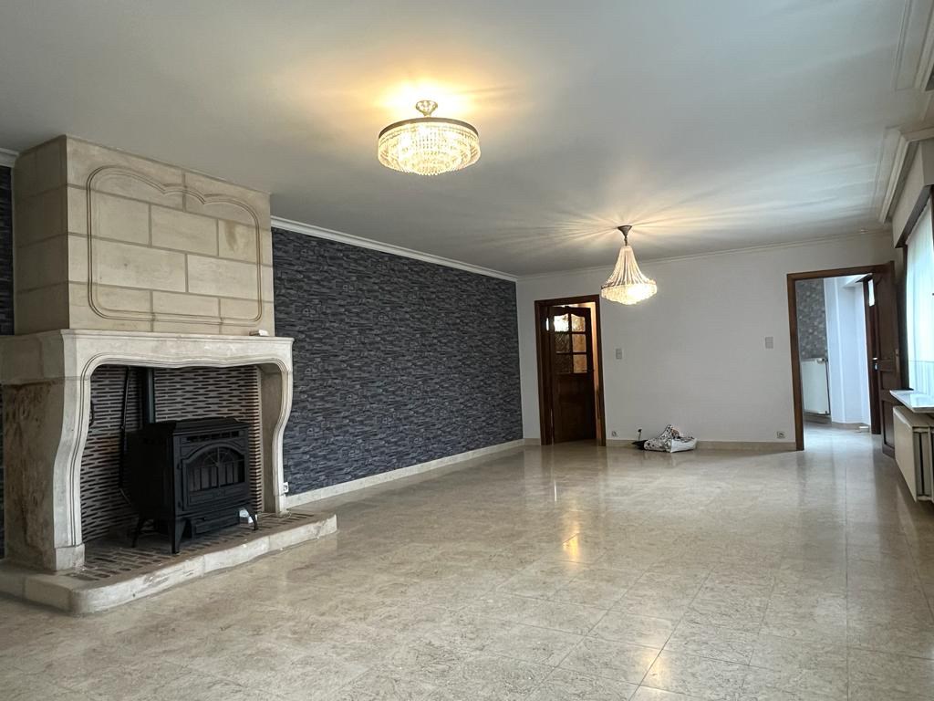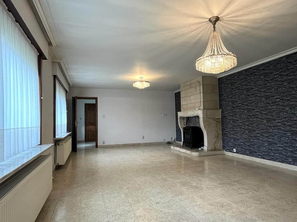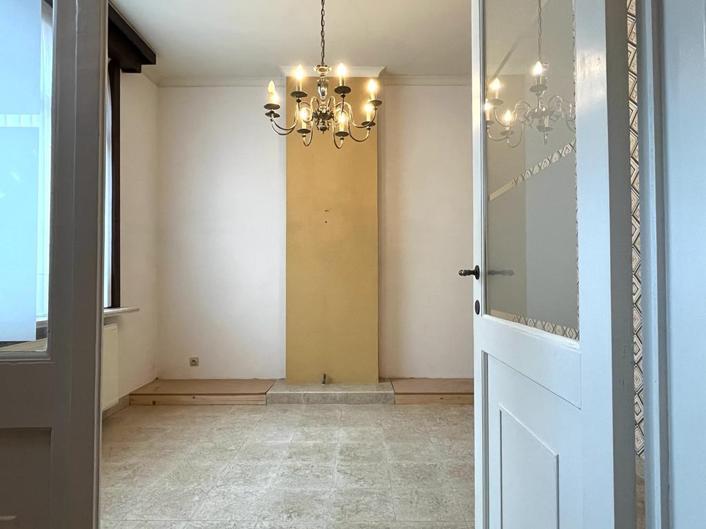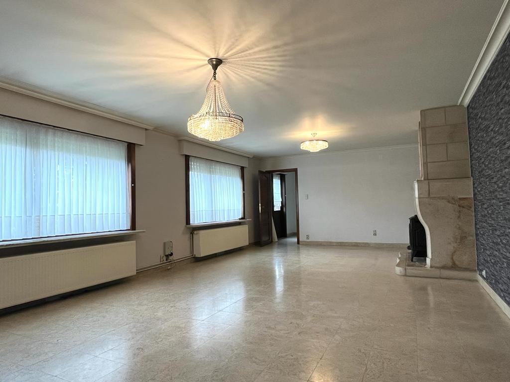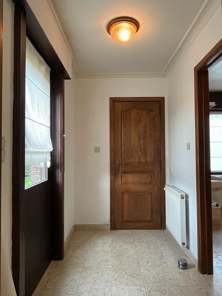 Bij het binnenkomen van de woning hebben we aan onze linkerkant een aparte ruimte die mogelijks als slaapkamers of bureauruimte gebruikt kan worden. Op het einde van de inkomhal komen we in de leefruimte met een open haard in natuursteen. Aansluitend bevindt zich de keuken met een doorgang richting de kelder. Achteraan de woning vinden we een apart toilet met daarnaast de badkamer.