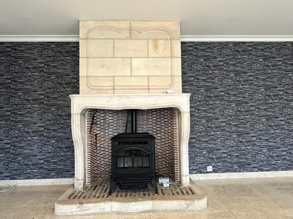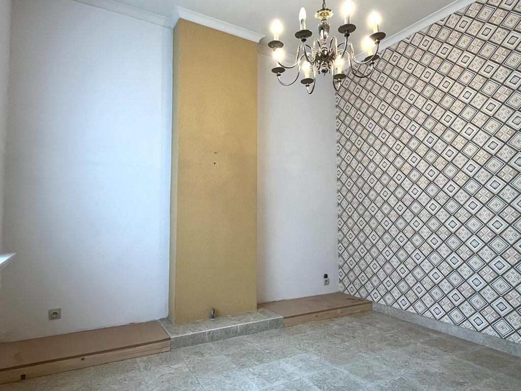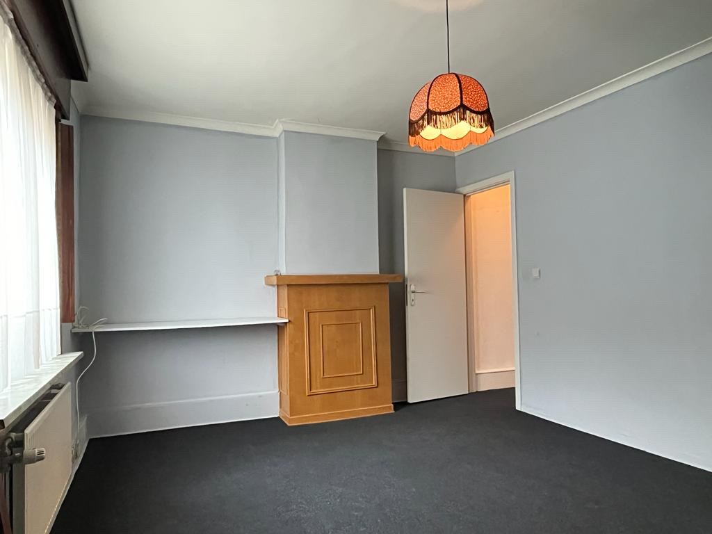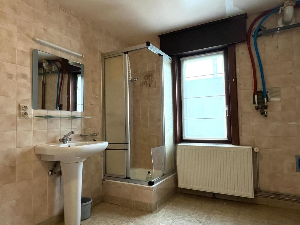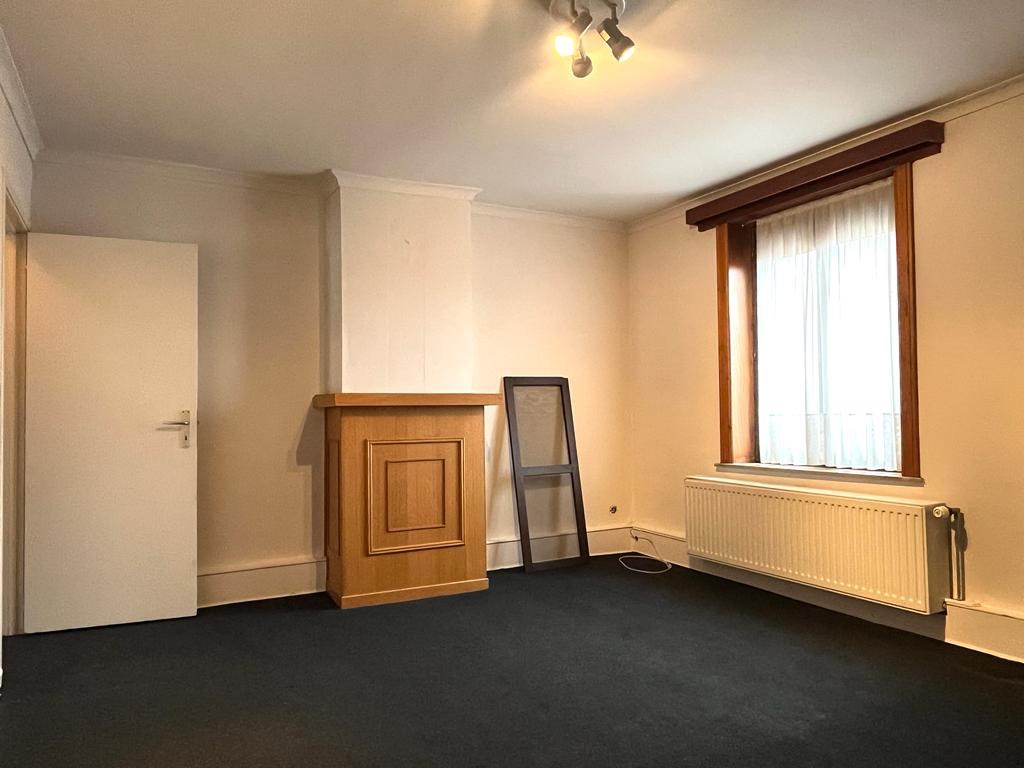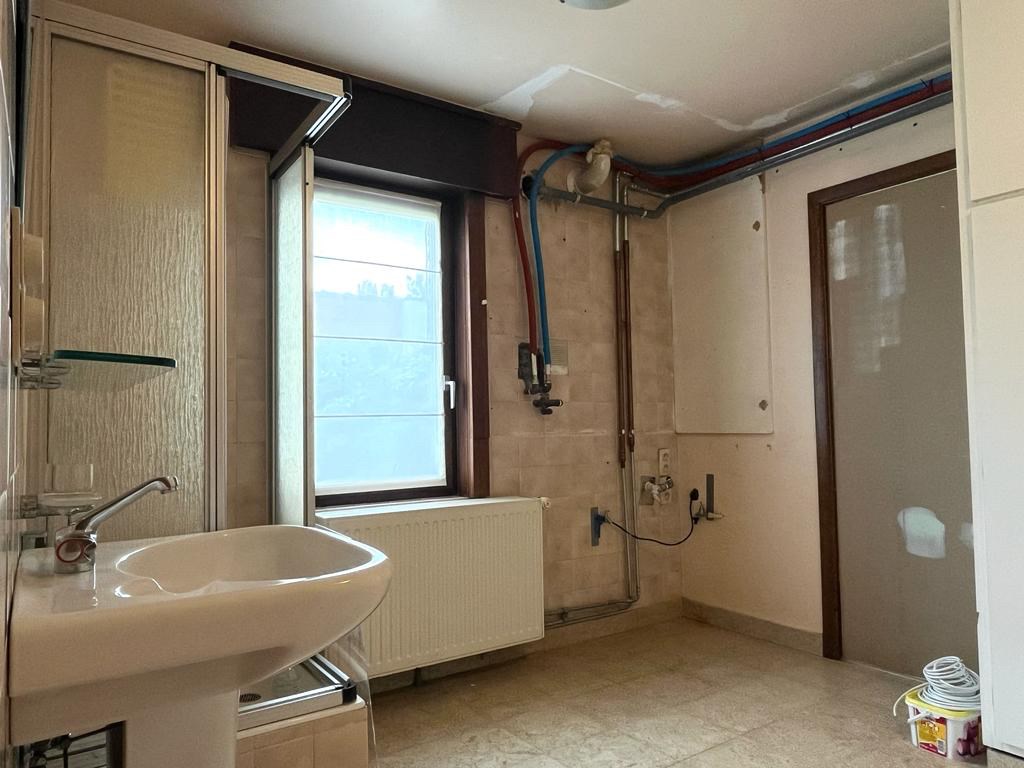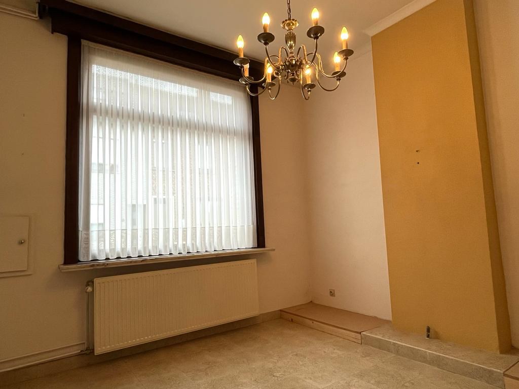 Bij het binnenkomen van de woning hebben we aan onze linkerkant een aparte ruimte die mogelijks als slaapkamers of bureauruimte gebruikt kan worden. Op het einde van de inkomhal komen we in de leefruimte met een open haard in natuursteen. Aansluitend bevindt zich de keuken met een doorgang richting de kelder. Achteraan de woning vinden we een apart toilet met daarnaast de badkamer.