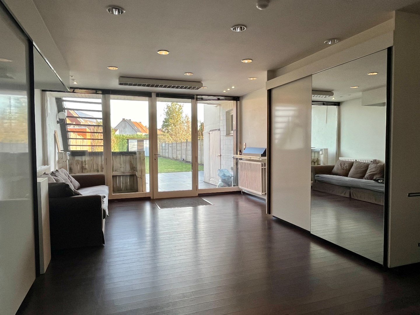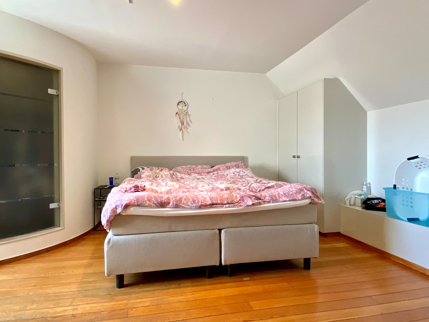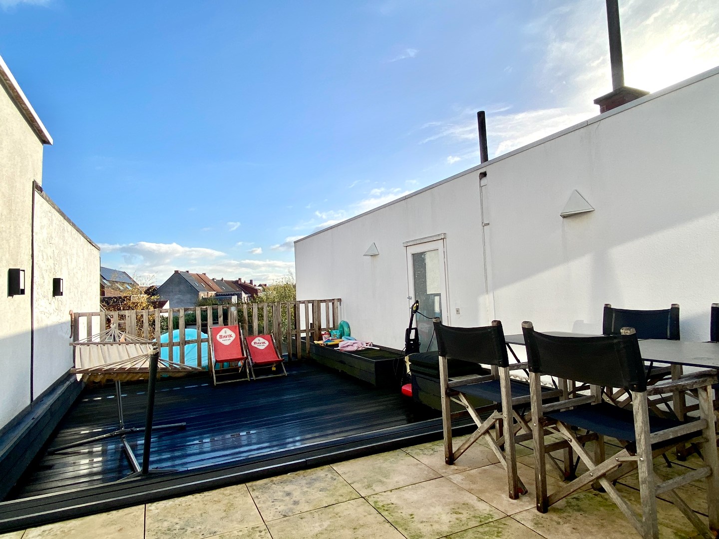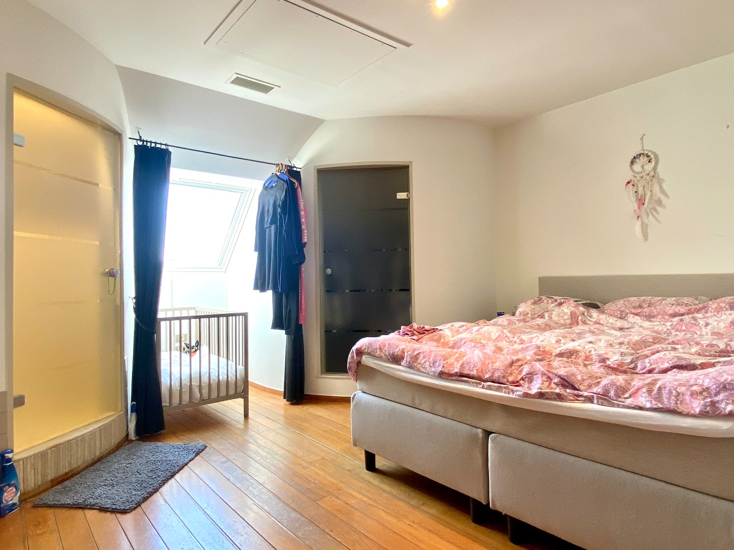 Aparte inkom met vestiaire. Boven is er een grote leefruimte met voldoende zonlicht en parket. Verder is er aan aparte keuken met schuifraam naar het groot terras. Op het dak verdiep zijn 2 slaapkamers en een kleine dressing/bureau.
