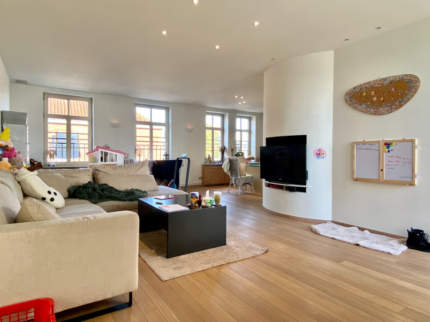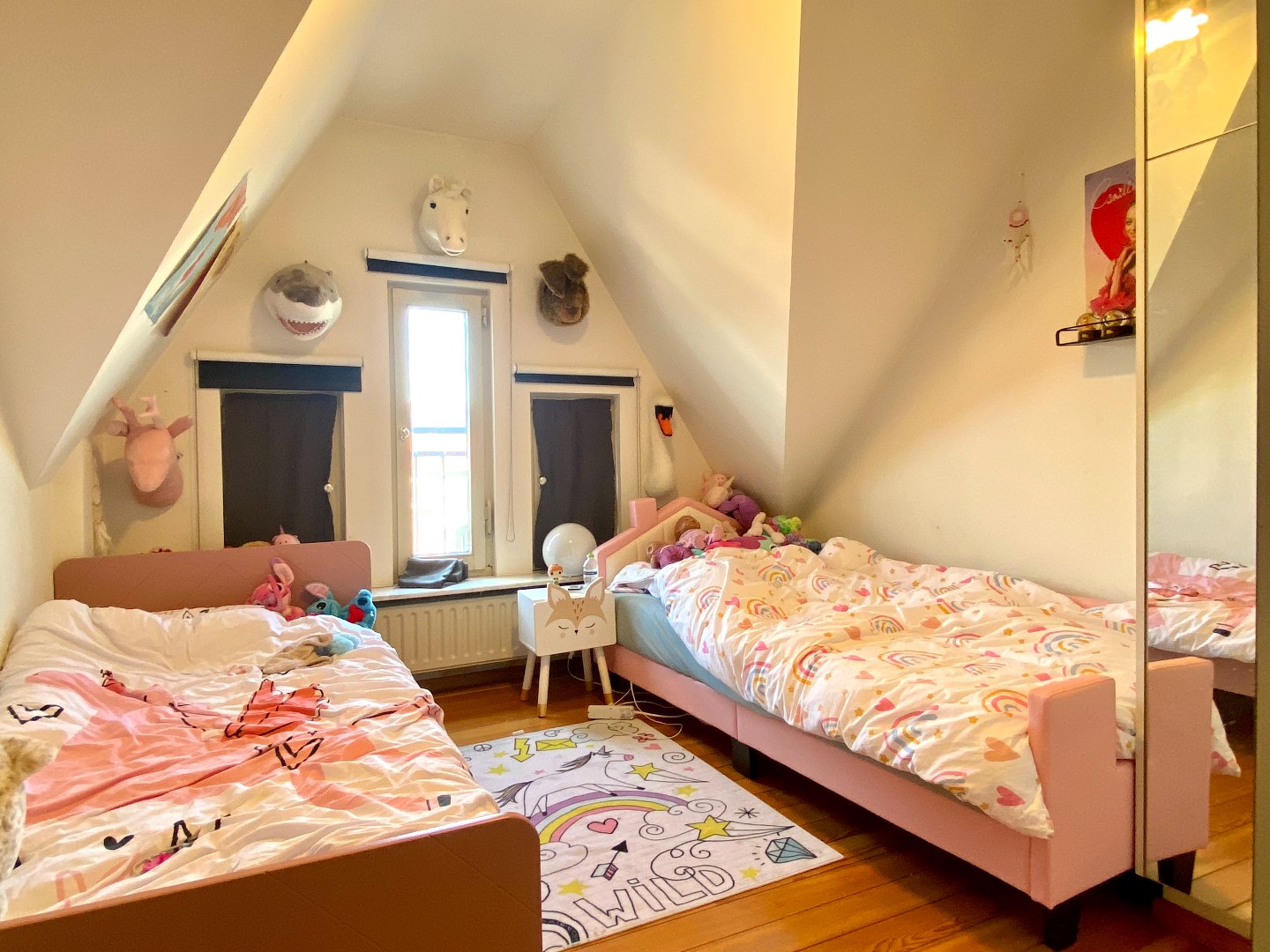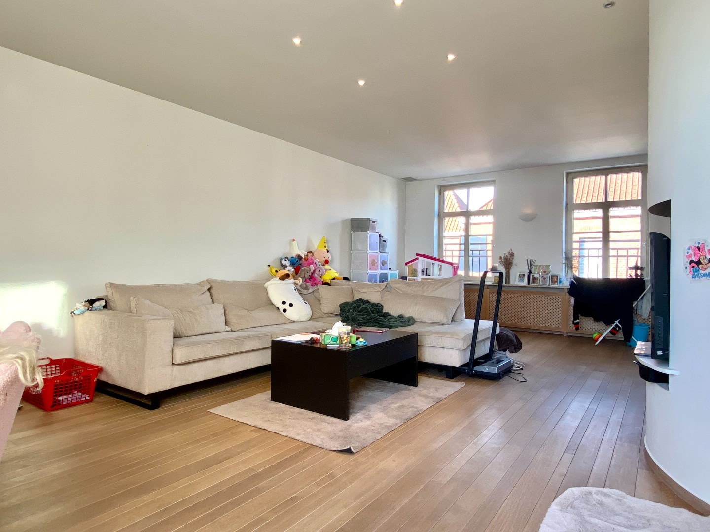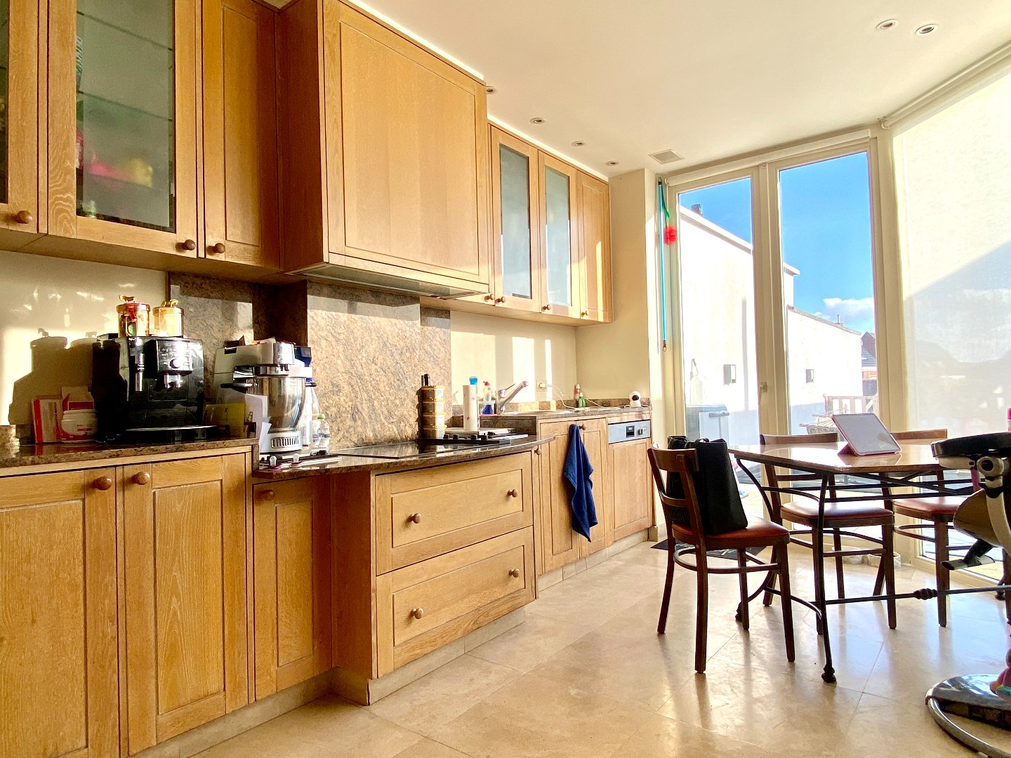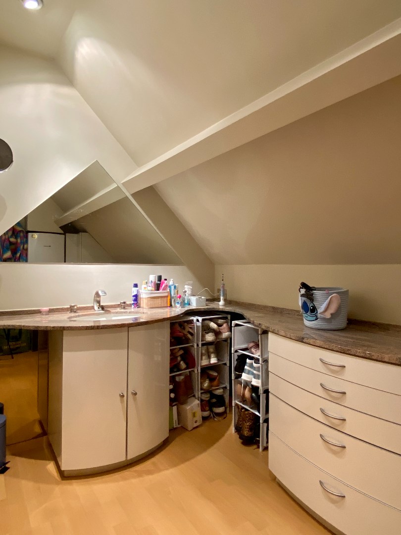 Aparte inkom met vestiaire. Boven is er een grote leefruimte met voldoende zonlicht en parket. Verder is er aan aparte keuken met schuifraam naar het groot terras. Op het dak verdiep zijn 2 slaapkamers en een kleine dressing/bureau.
