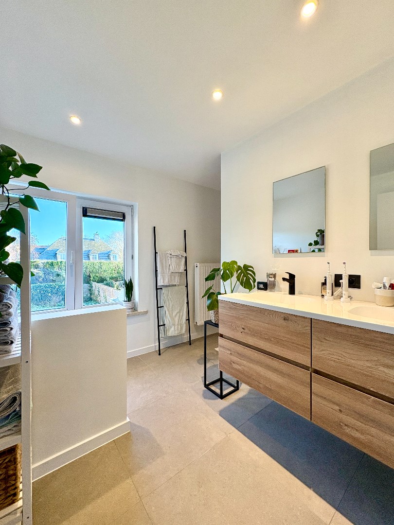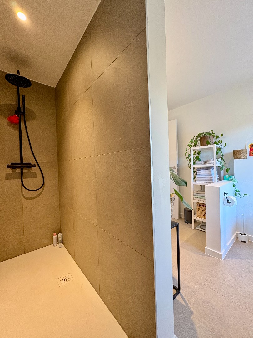 Het verdiep bevat 3 ruime slaapkamers en een badkamer. Deze heeft op zijn beurt een apart toilet, dubbel wastafel en zeer ruime inloopdouche. Een schuifladder brengt ons naar de bergzolder.