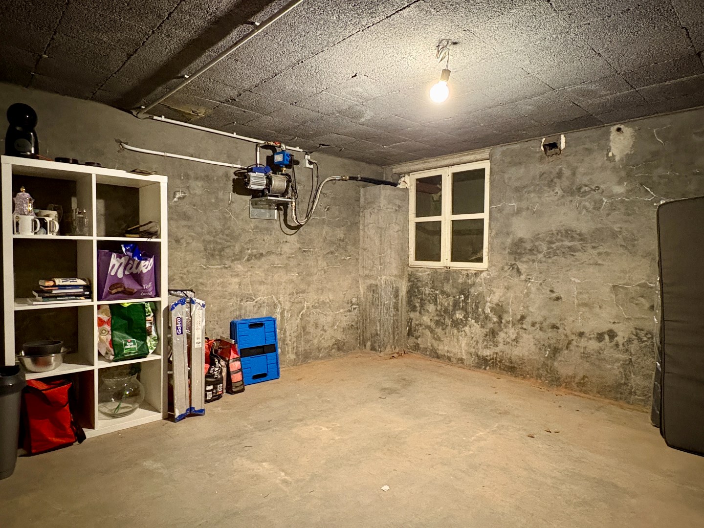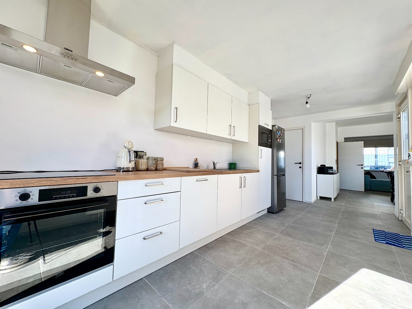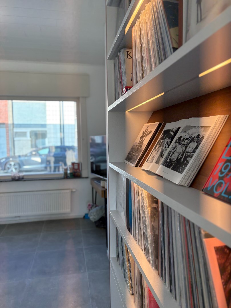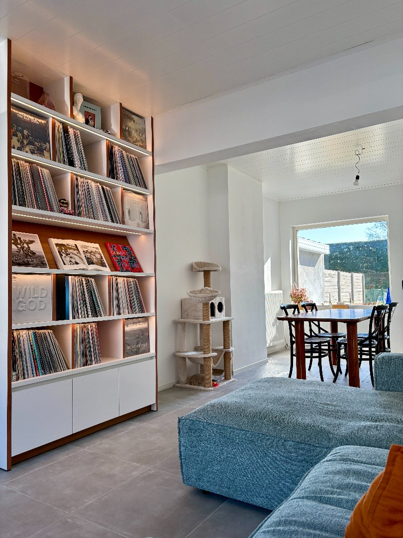 Inkom met apart toilet, leefruimte met opmaat gemaakte boekenkast (vinylkast met indirecte verlichting), eetplaats en ruime keuken. Deze is op zijn beurt voorzien van alle nodige toestellen en heeft een praktisch en hoge kelder om de hoek.