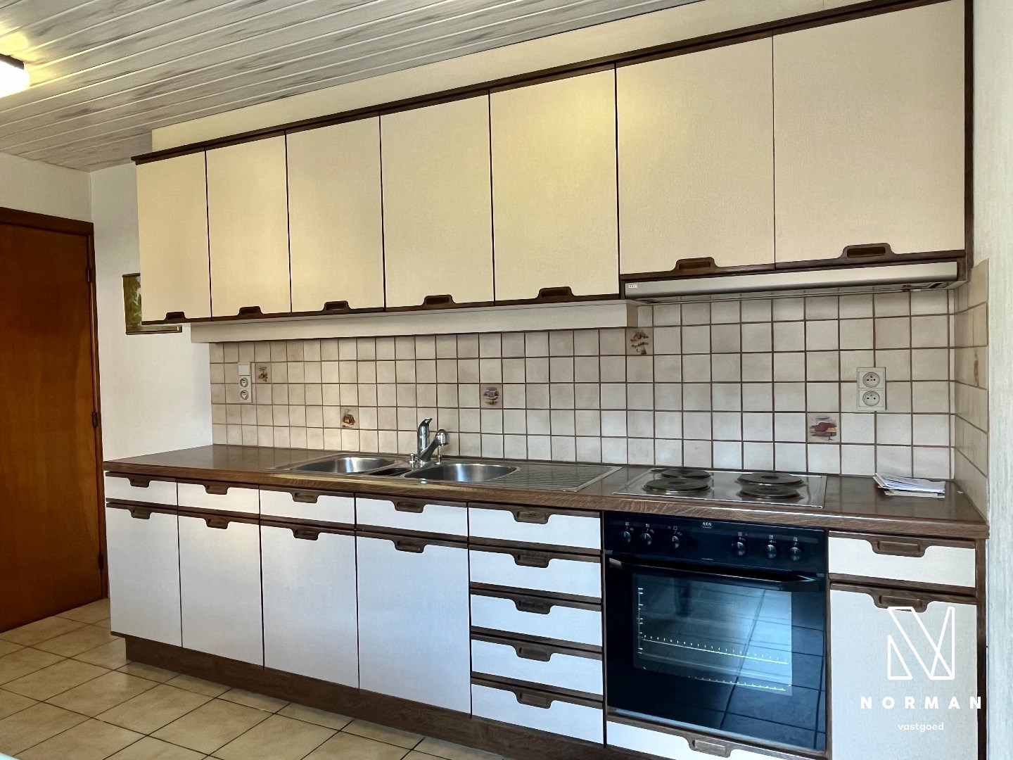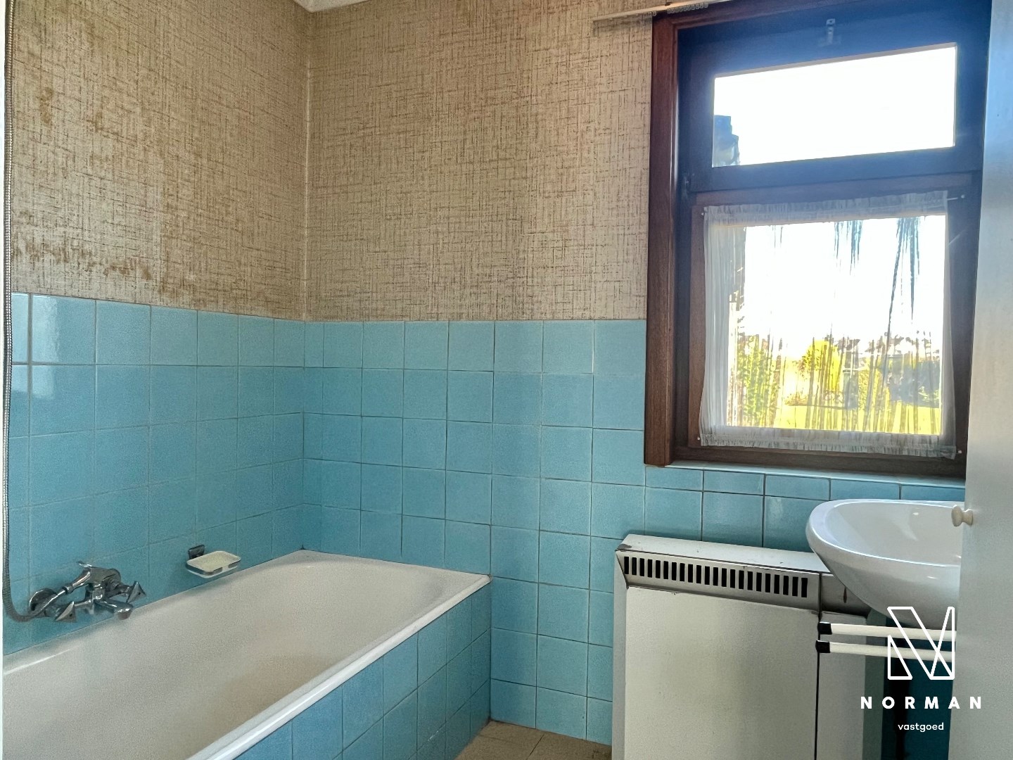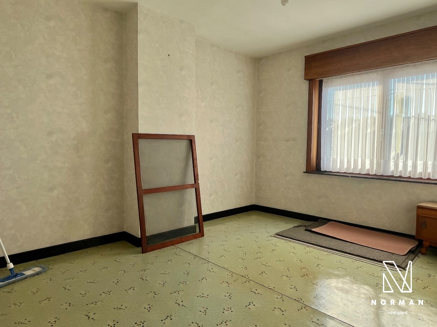 Inkom met aan de rechterzijde de leefruimte. Aansluitend heb je de keuken en de ruime, droge kelder. Op het gelijkvloers is ook de badkamer met bad en lavabo. Er is ook een apart gastentoilet.