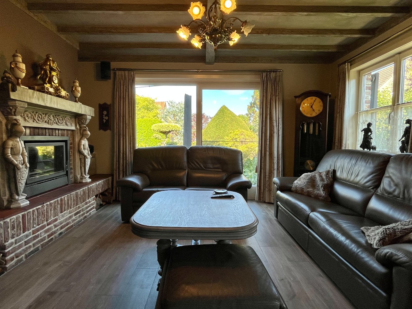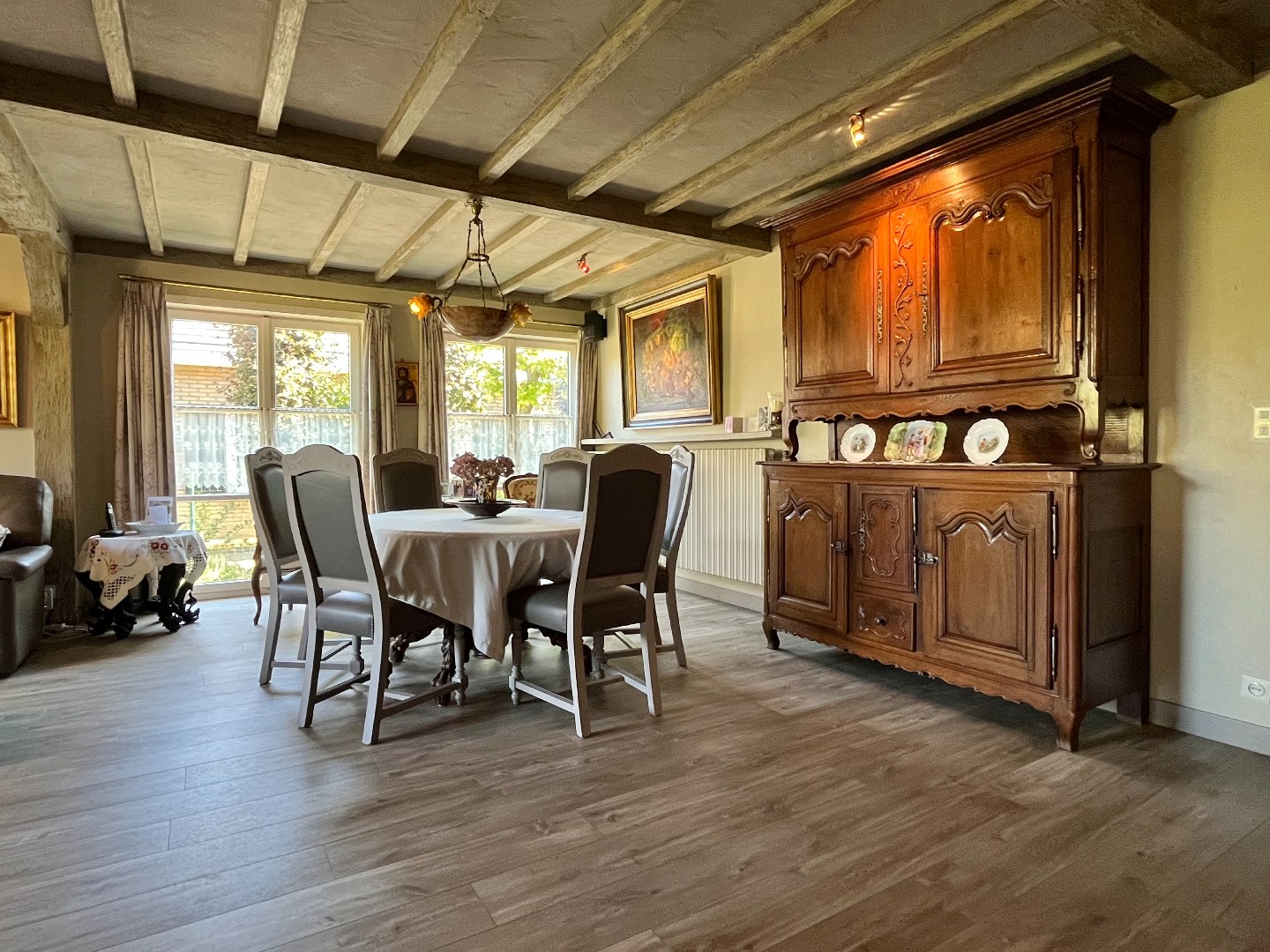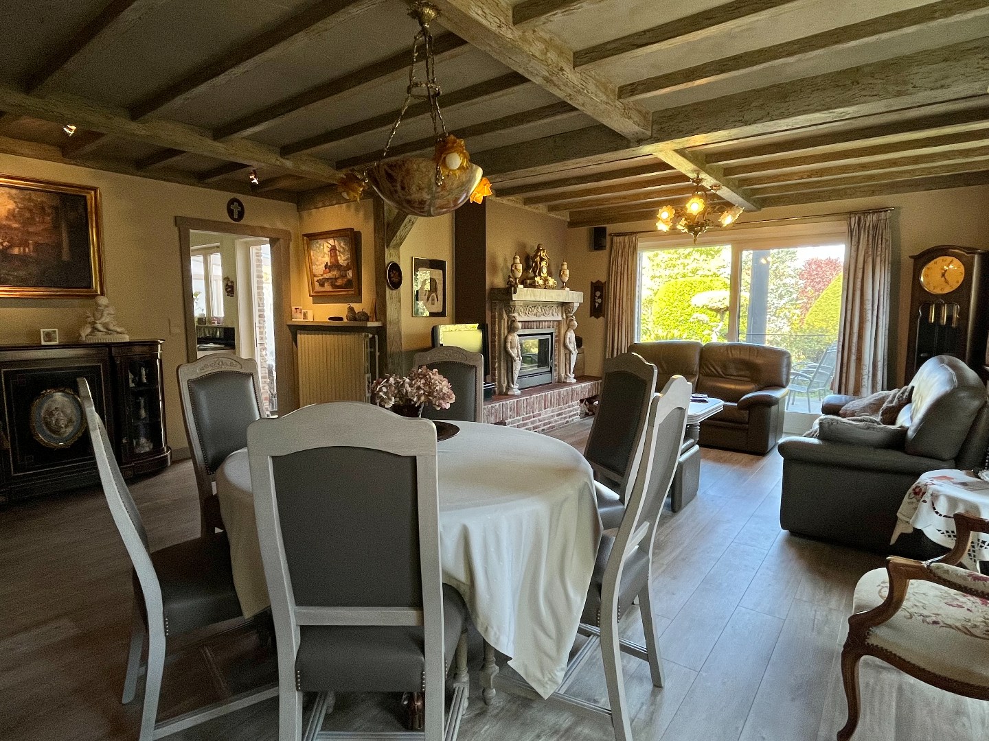 Bij het binnenkomen van de woning stap je de inkomhal binnen, die rechtstreeks toegang biedt tot de ruime living met uitzicht op de tuin. Hier zorgt een gezellige houtkachel voor extra warmte en sfeer.