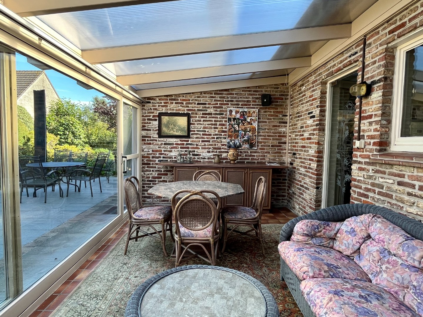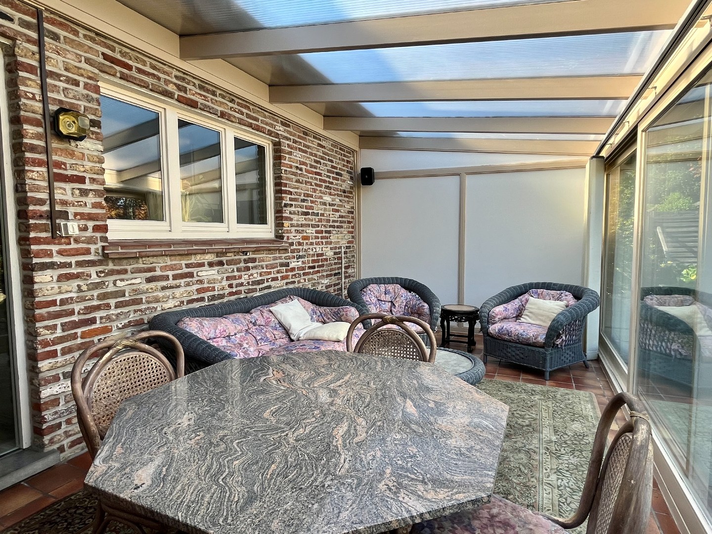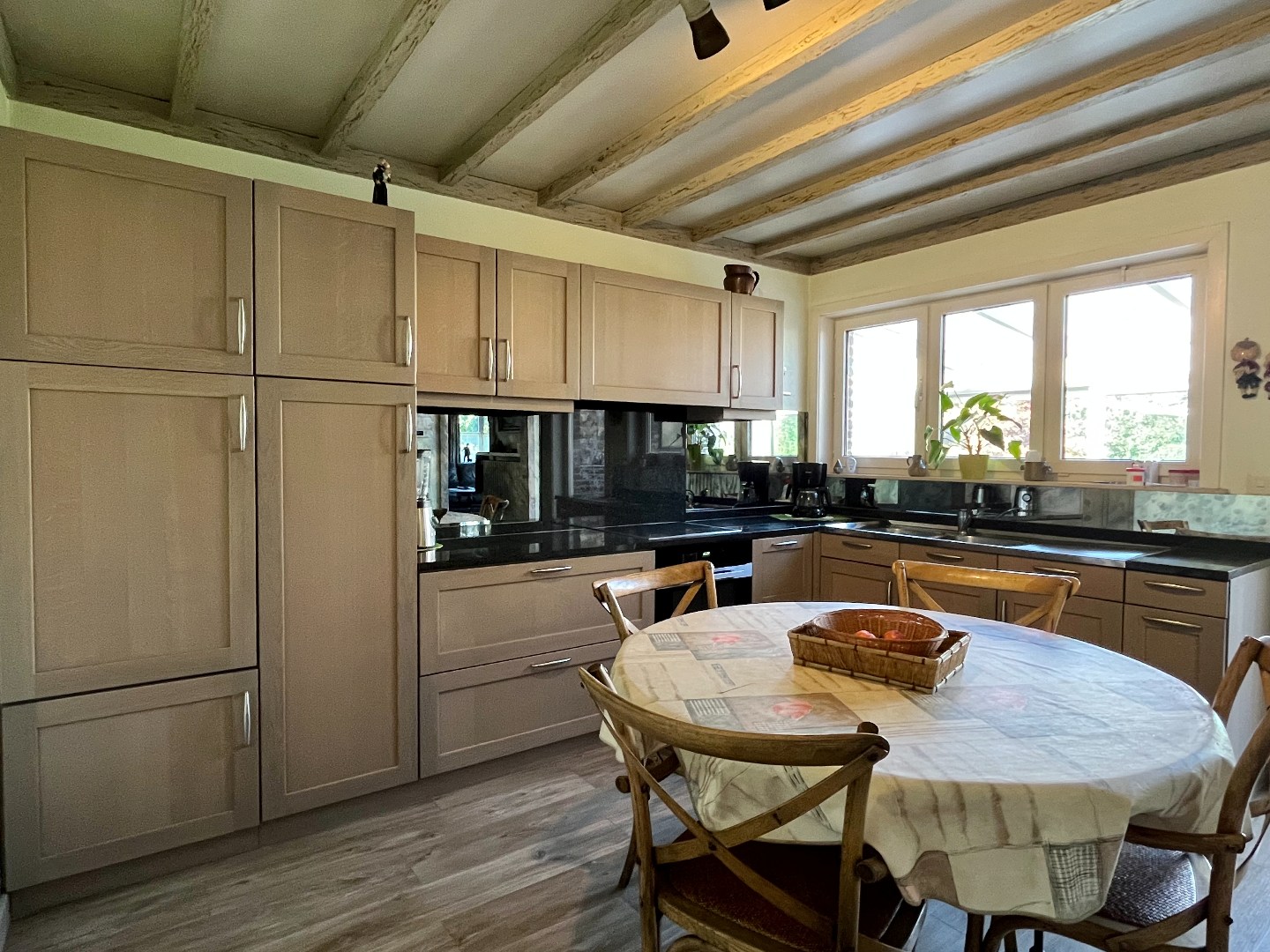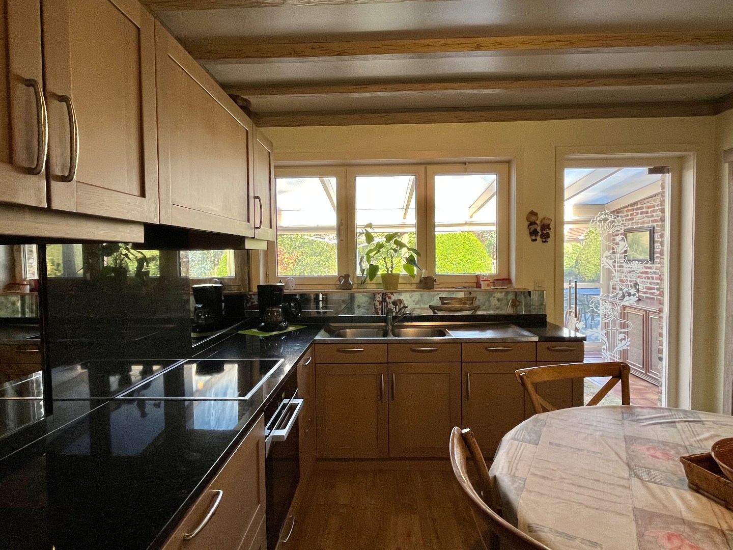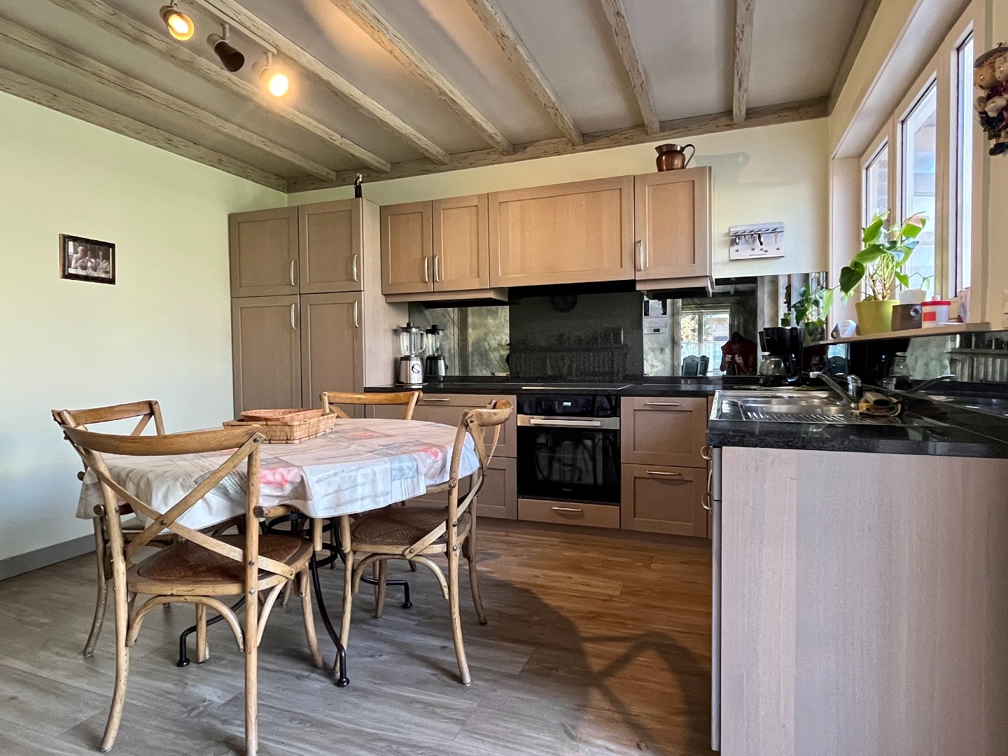 Aansluitend bevindt zich de uitgeruste keuken, met voldoende ruimte om een eettafel te plaatsen. Via een glazen deur kom je in de veranda, een ideale plek om tijdens de zomermaanden te genieten.