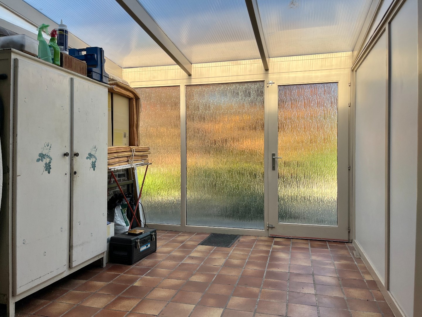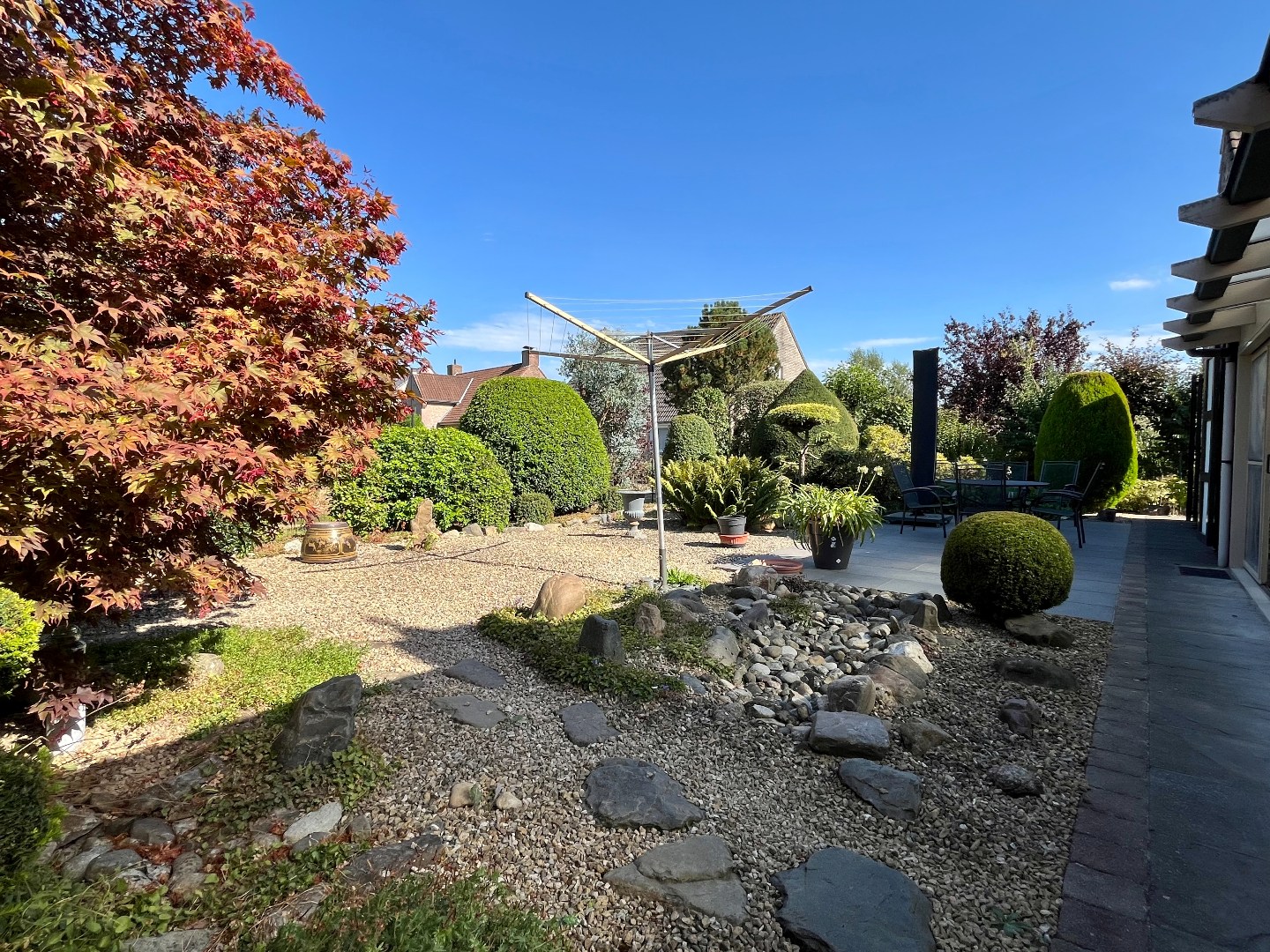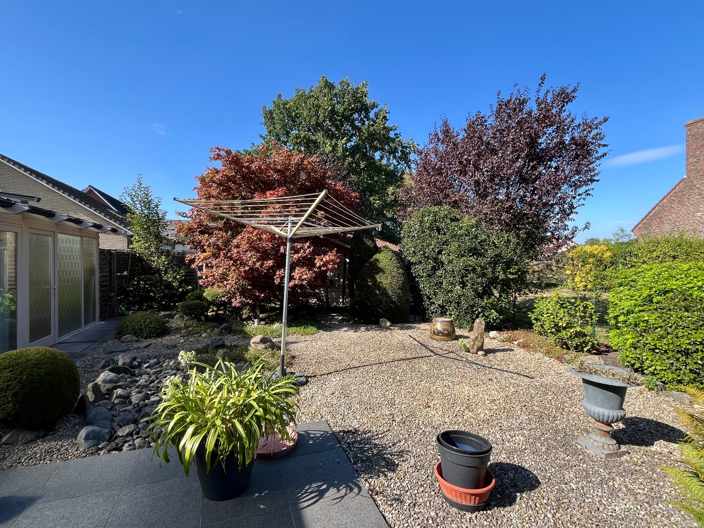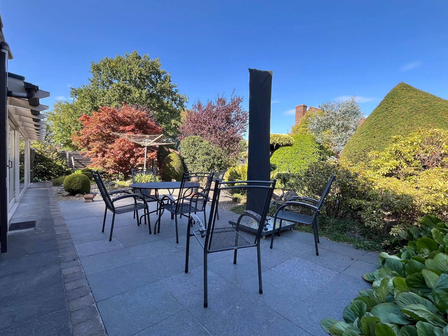 De gezellige, volledig omheinde tuin loopt rondom de woning en biedt veel privacy.