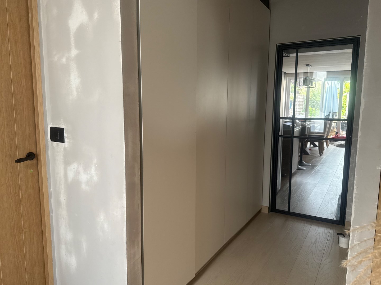 Bij het betreden van de woning kom je binnen in een ruime inkomhal met ingemaakte kasten. Aan de linkerkant bevindt zich een praktische wasruimte, waar ook de technische installaties zijn ondergebracht. Aan de rechterkant tref je de volledig uitgeruste badkamer met een inloopdouche, dubbele lavabo en een bad. Er is ook een afzonderlijk gastentoilet aanwezig.