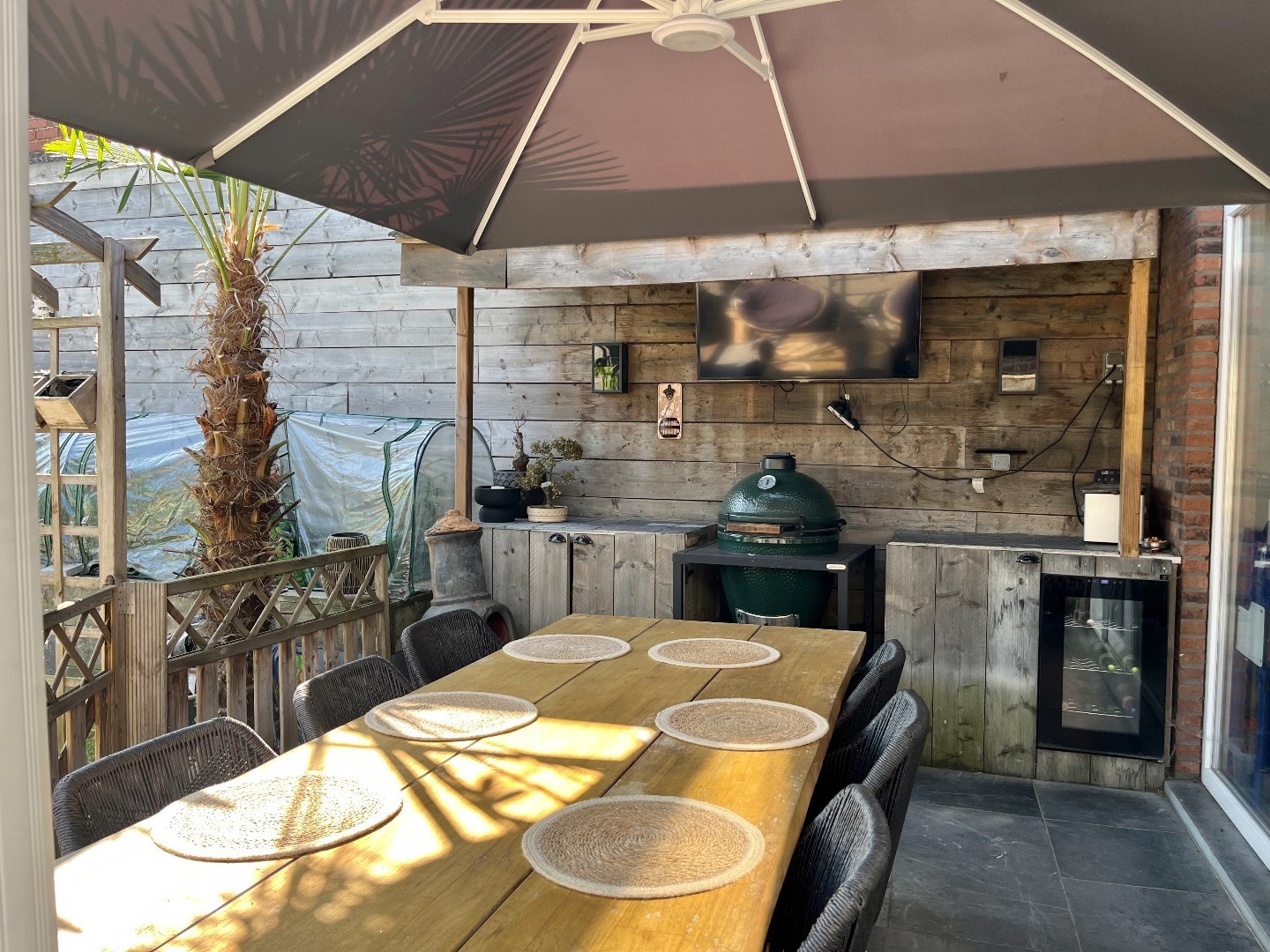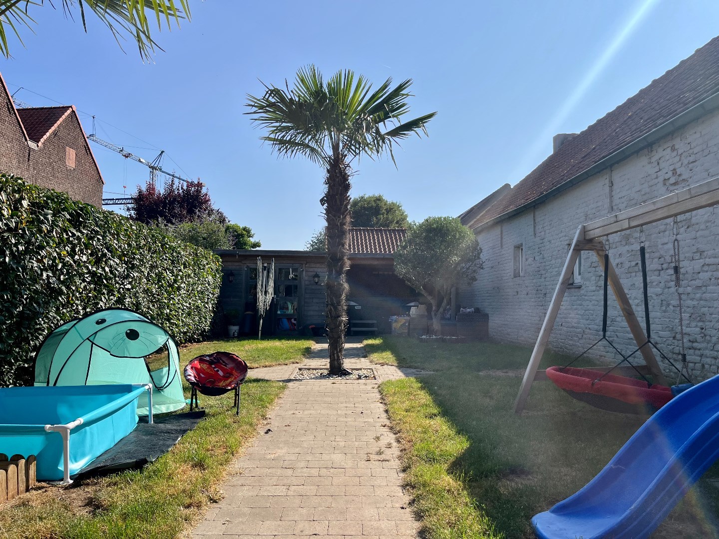 Buiten geniet je van een ruime tuin met een tuinhuis achteraan, perfect voor opslag of als extra buitenruimte.