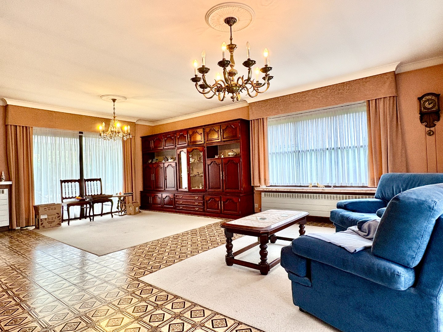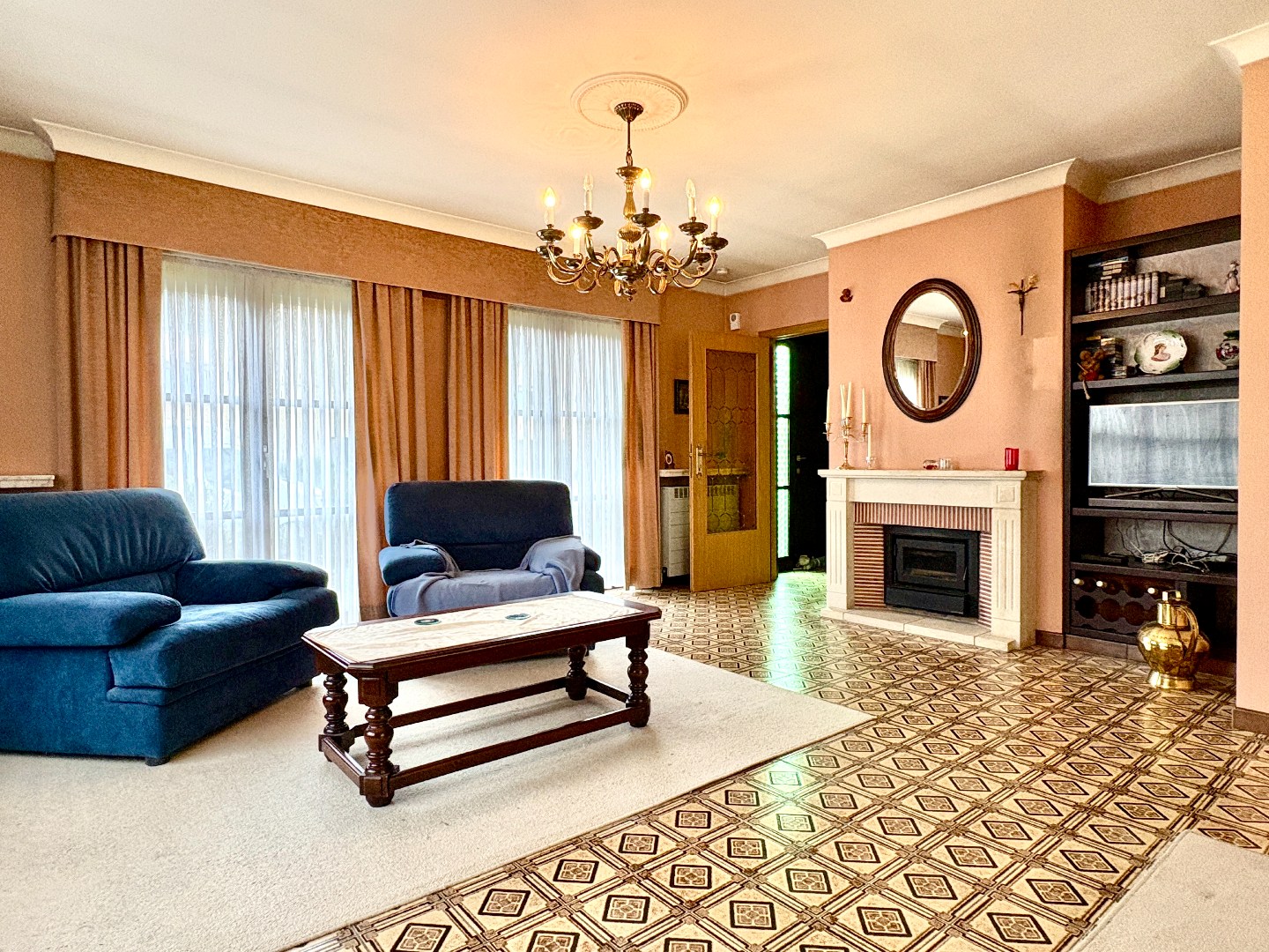 Inkom met apart toilet en vestiaire. Aan de linkerzijde is er een garage en gang die de 3 slaapkamers en badkamer verbind met elkaar. Aan de rechterzijde is er een zeer ruime leefruimte met aparte keuken. Deze keuken is quasi niet gebruikt en is werkelijk in nieuwstaat. Bij de keuken hoort er een aparte berging.