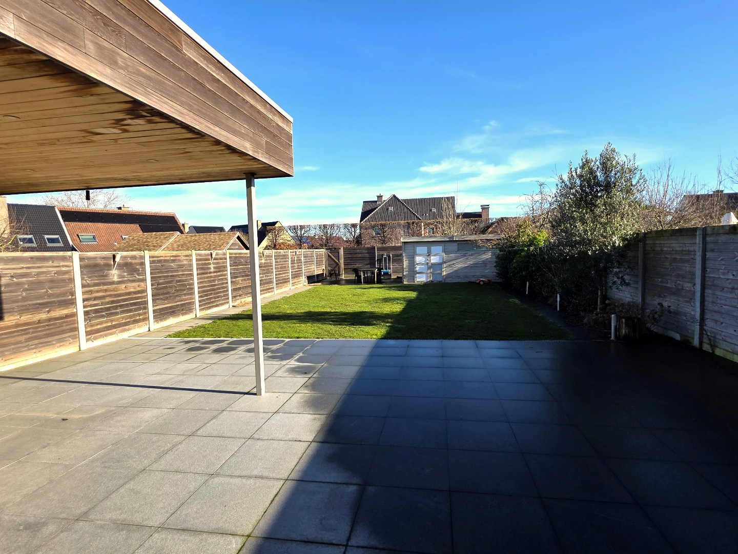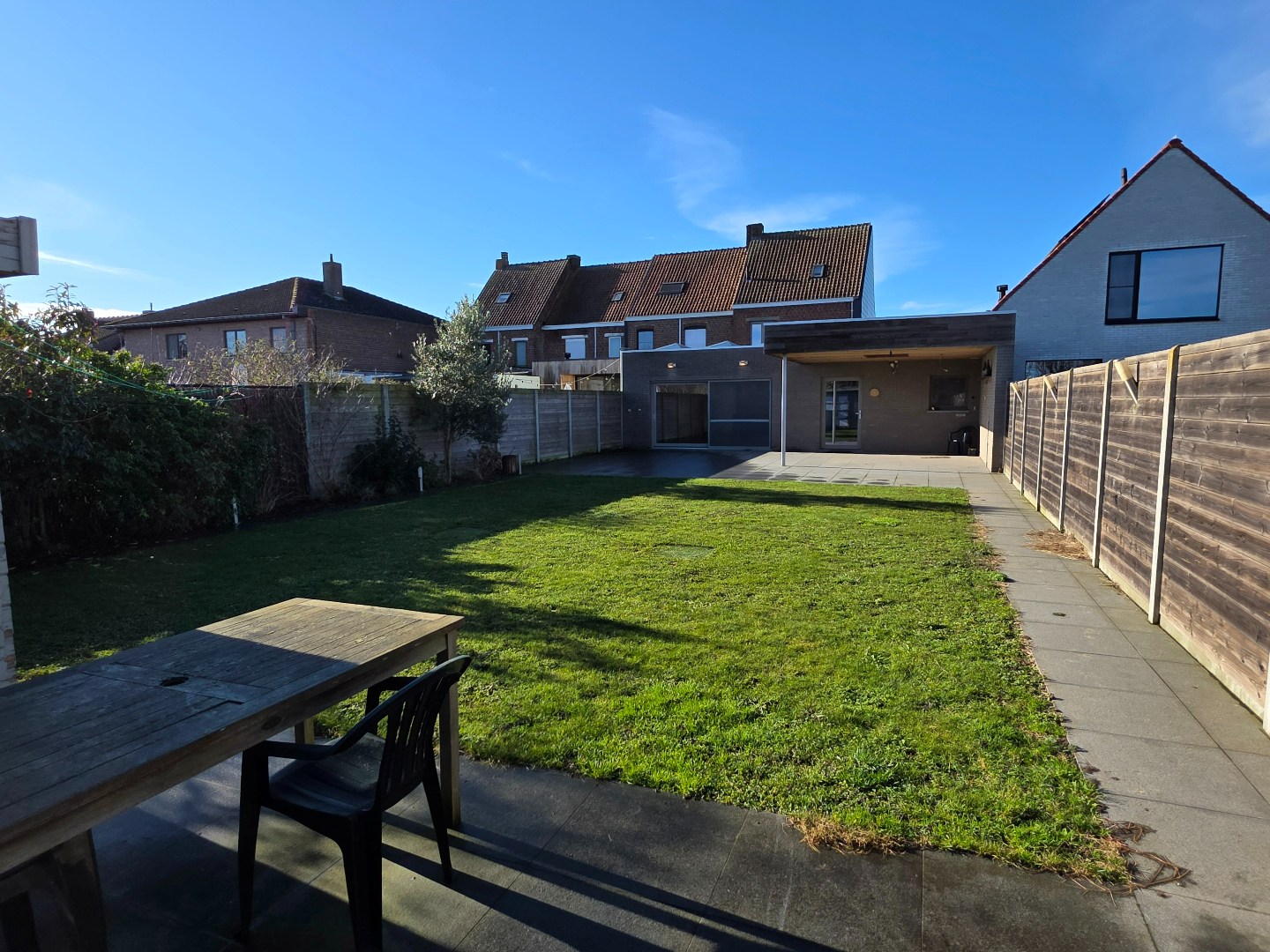 De tuin is volledig omheind, heeft een uitweg (met fiets of te voet), tuinhuis en verschillende terrassen (al dan niet overdekt).