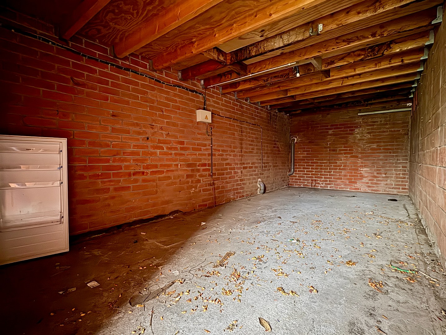 Aan de voorzijde is er een garage met bijhorende bergruimte. Ook is er een zeer ruime overdekte ruimte in de andere hoek van het perceel. Ideaal voor vele fietsen of stockage. Centraal op het perceel is de tuin. Via deze kan je de woning betreden. Er is een leefruimte met zitput en houtkachel. Verder is er een kelder met hierboven een voute-kamer. Aansluitend is de keuken met plaats voor een eettafel en vele kastenruimtes. Frigo, dampkap, kookplaats en zicht op de tuin. Op het gelijkvloers is er nog een badkamer met toilet en bad. Een vaste trap brengt ons naar het verdiep waar er een zeer grote slaapkamer is met heel wat inmaakkasten.
