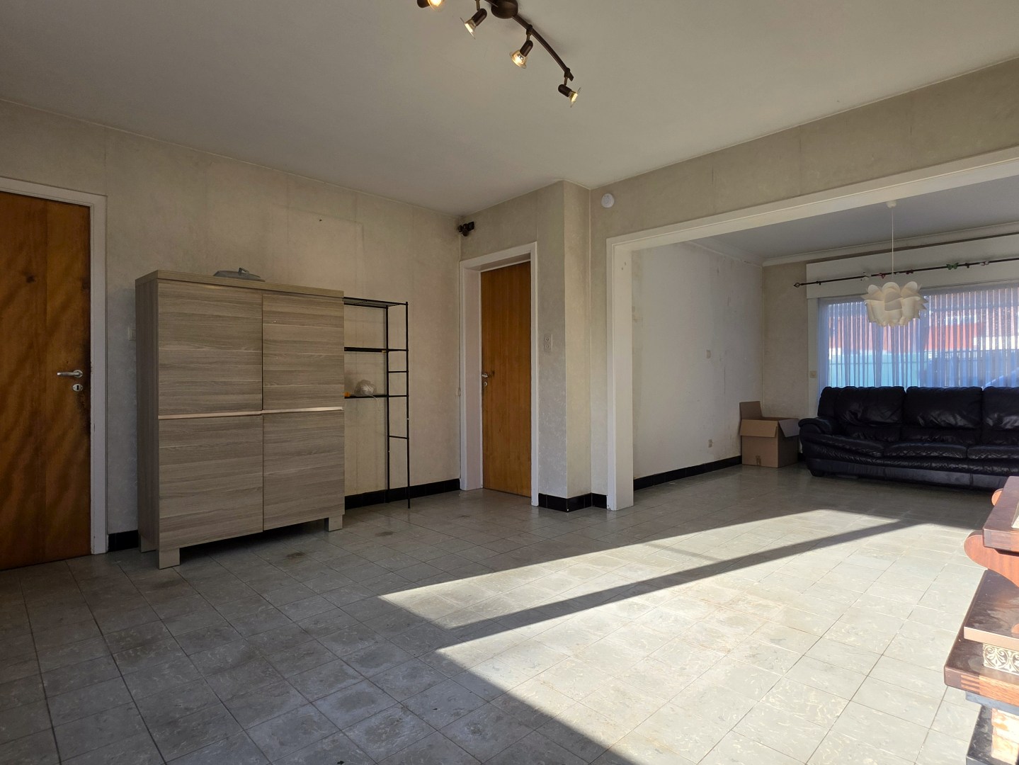 Stevige woning met betonstructuur te koop in Kuurne, waarvan het eerste verdiep al volledig gerenoveerd is.