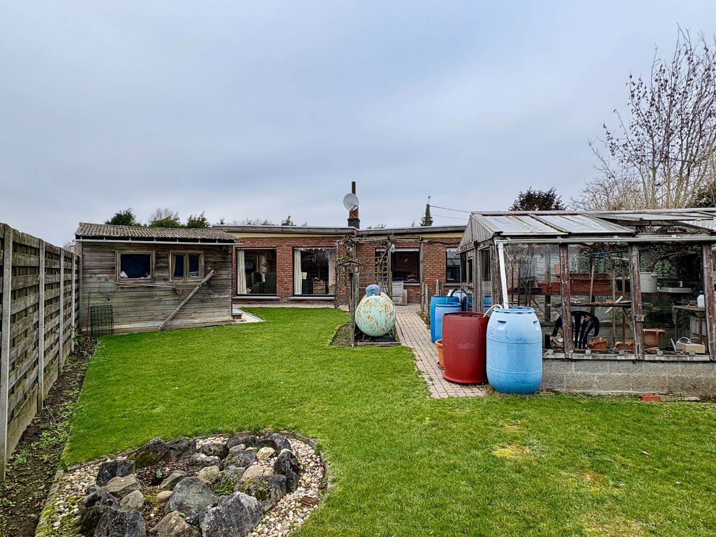 Gelijkvloerse woning op 628 m², 3 slaapkamers, mooi aangelegde tuin en garage.