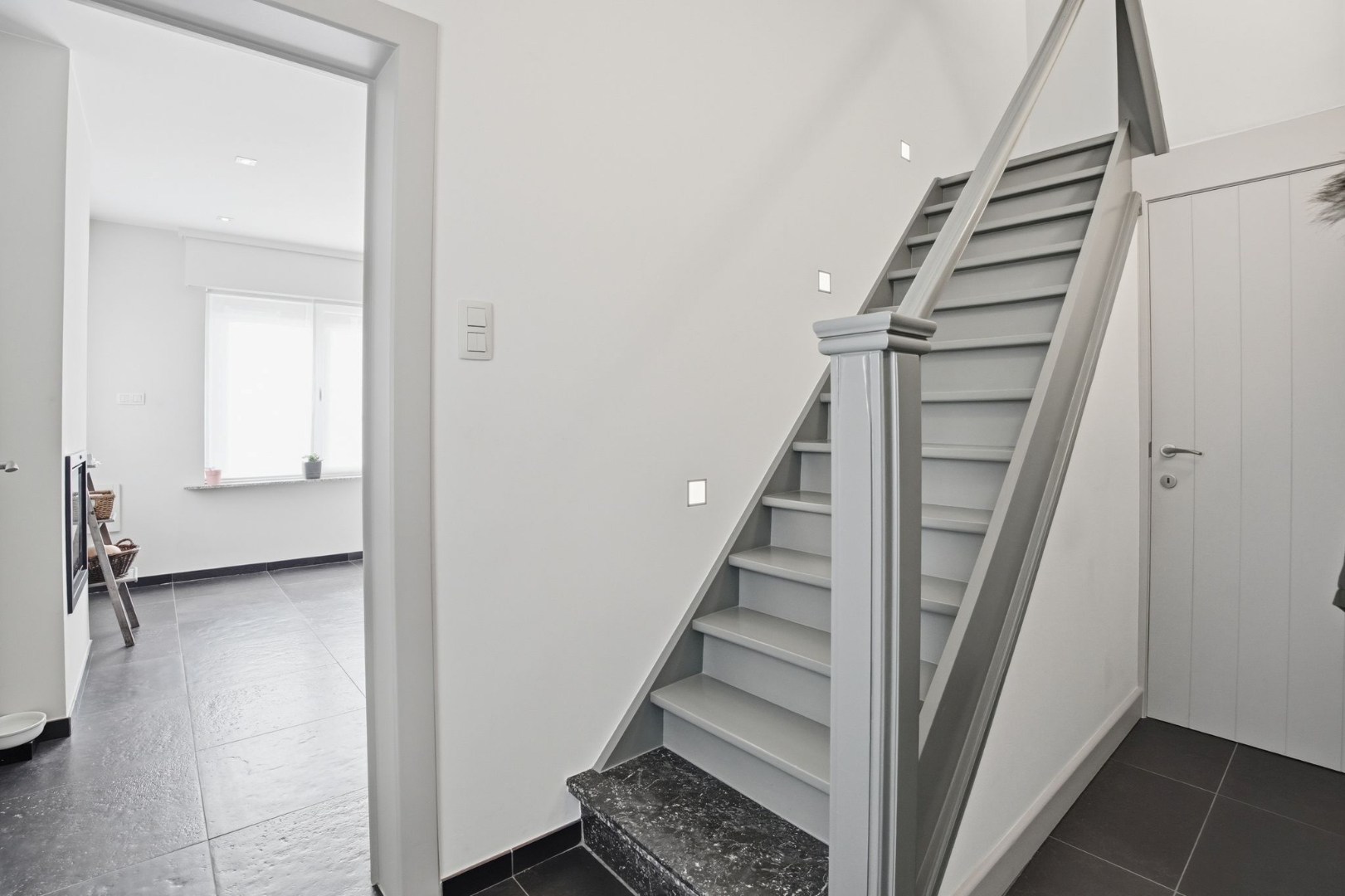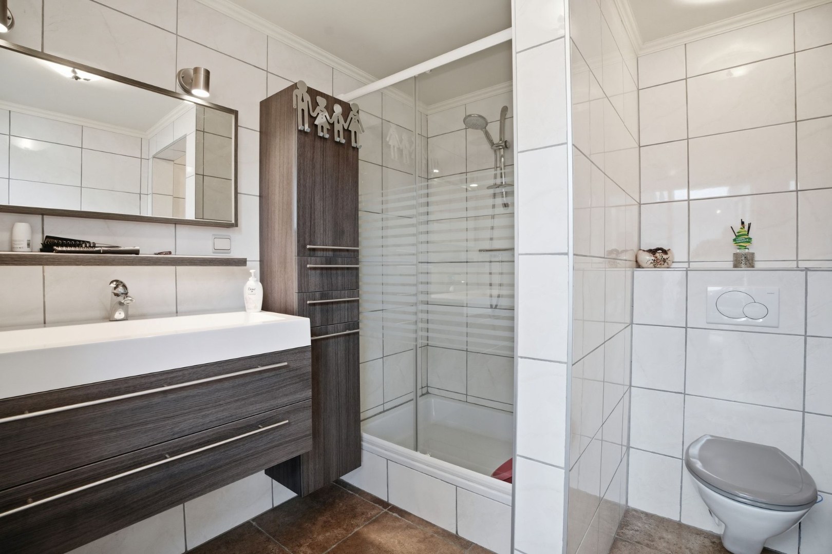Het gelijkvloers werd aangepakt/vernieuwd in 2016 en heeft de volgende indeling: Inkomhall met doorgang naar de droge kelder, grote open eetkeuken met sterke lichtinval, leef en zitruimte, veranda (vernieuw dak 2020), badkamer met toilet, douche en wastafel.
