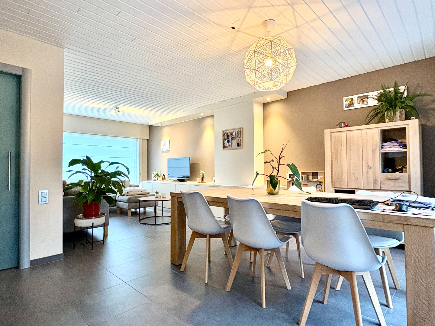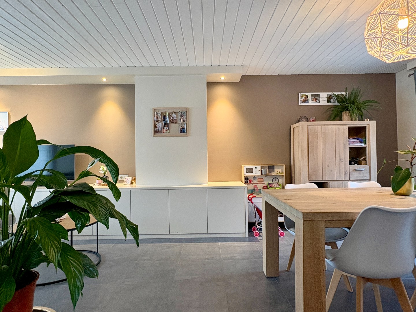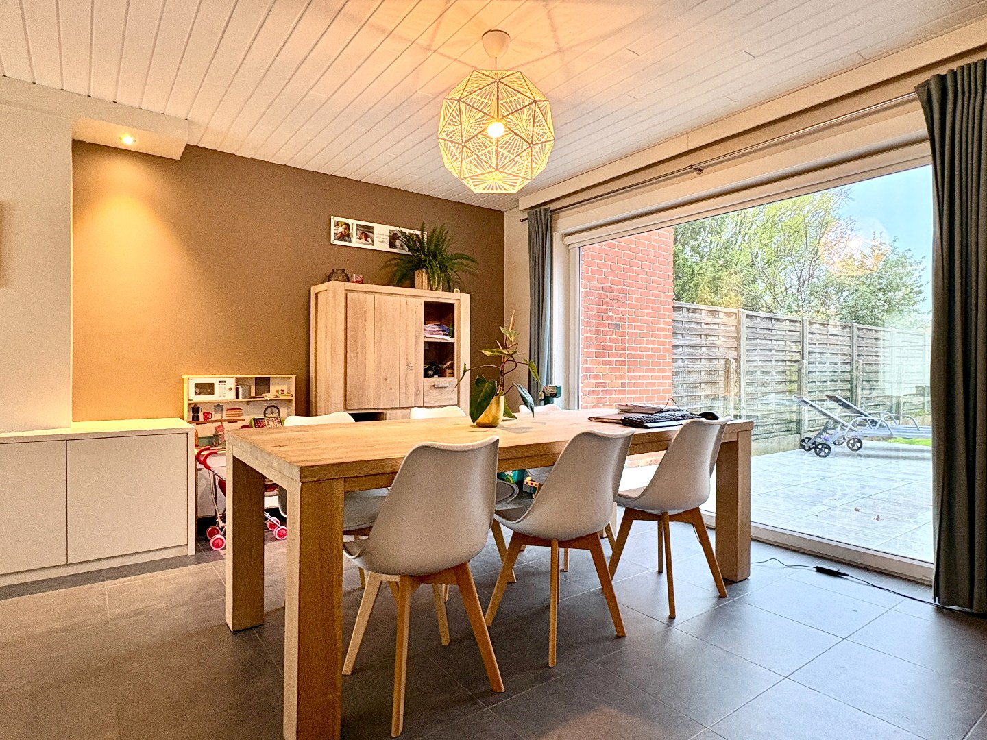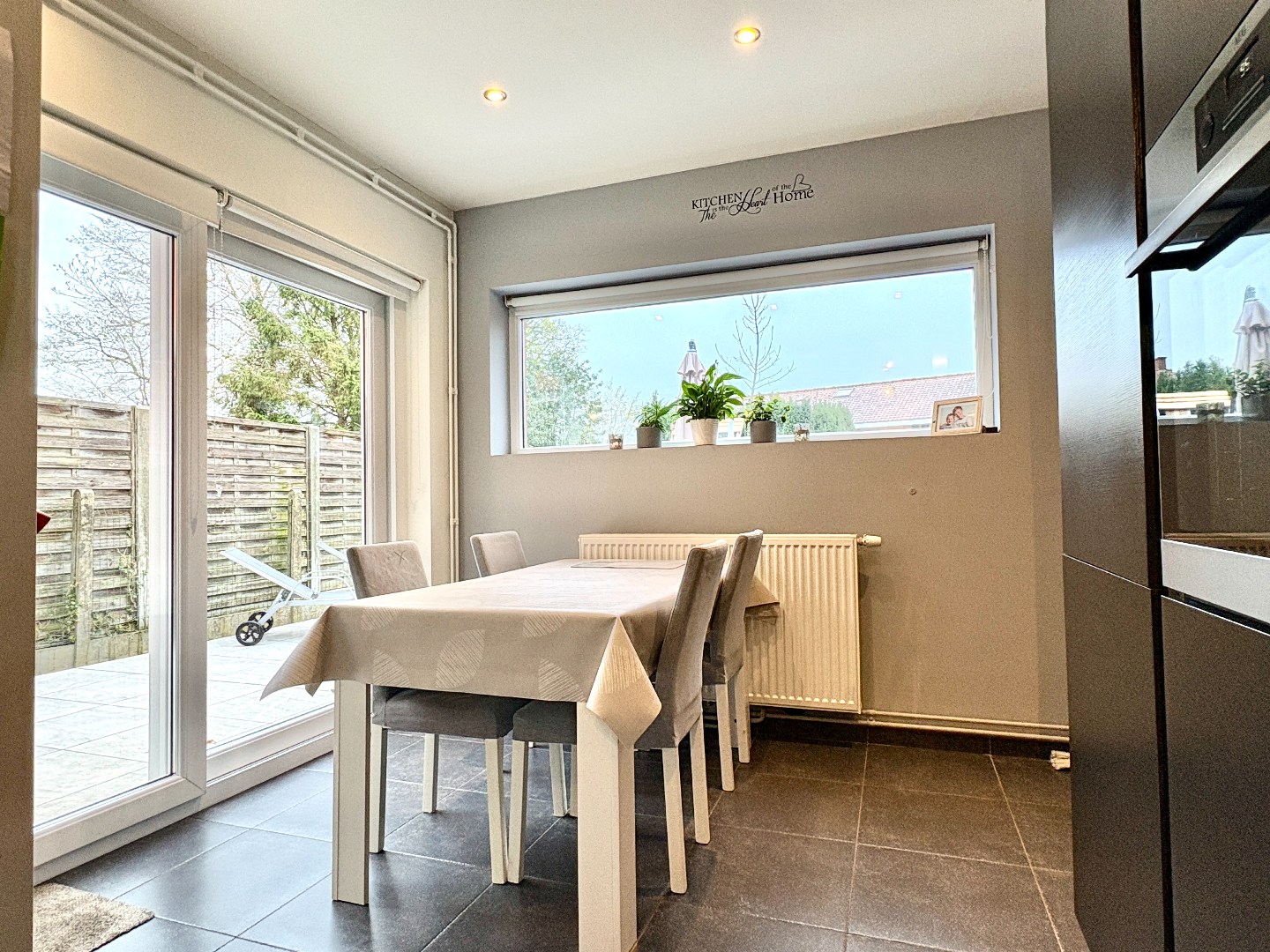 Aangename leefruimte met zithoek en eetplaats, grote raampartijen en een open keuken gedeelte. De keuken heeft een aangename uitbouw waar er nog een eetplaats is bijgecreëerd. Enerzijds kan je via de keuken naar de kelder, anderzijds naar de aanpalende garage. Bergruimte genoeg!