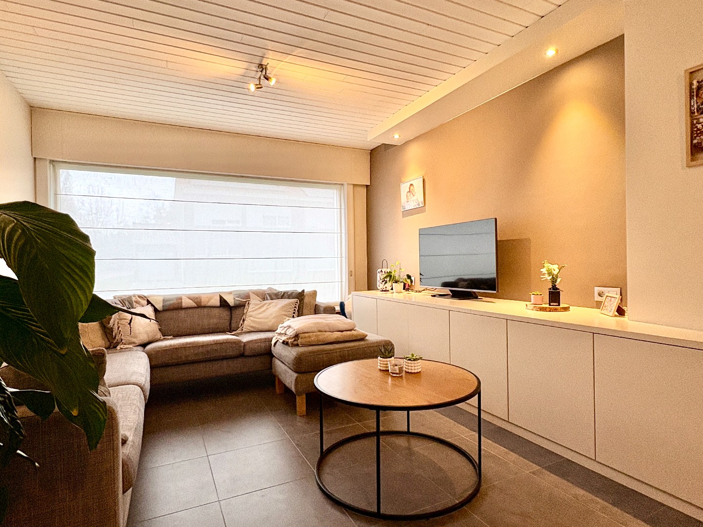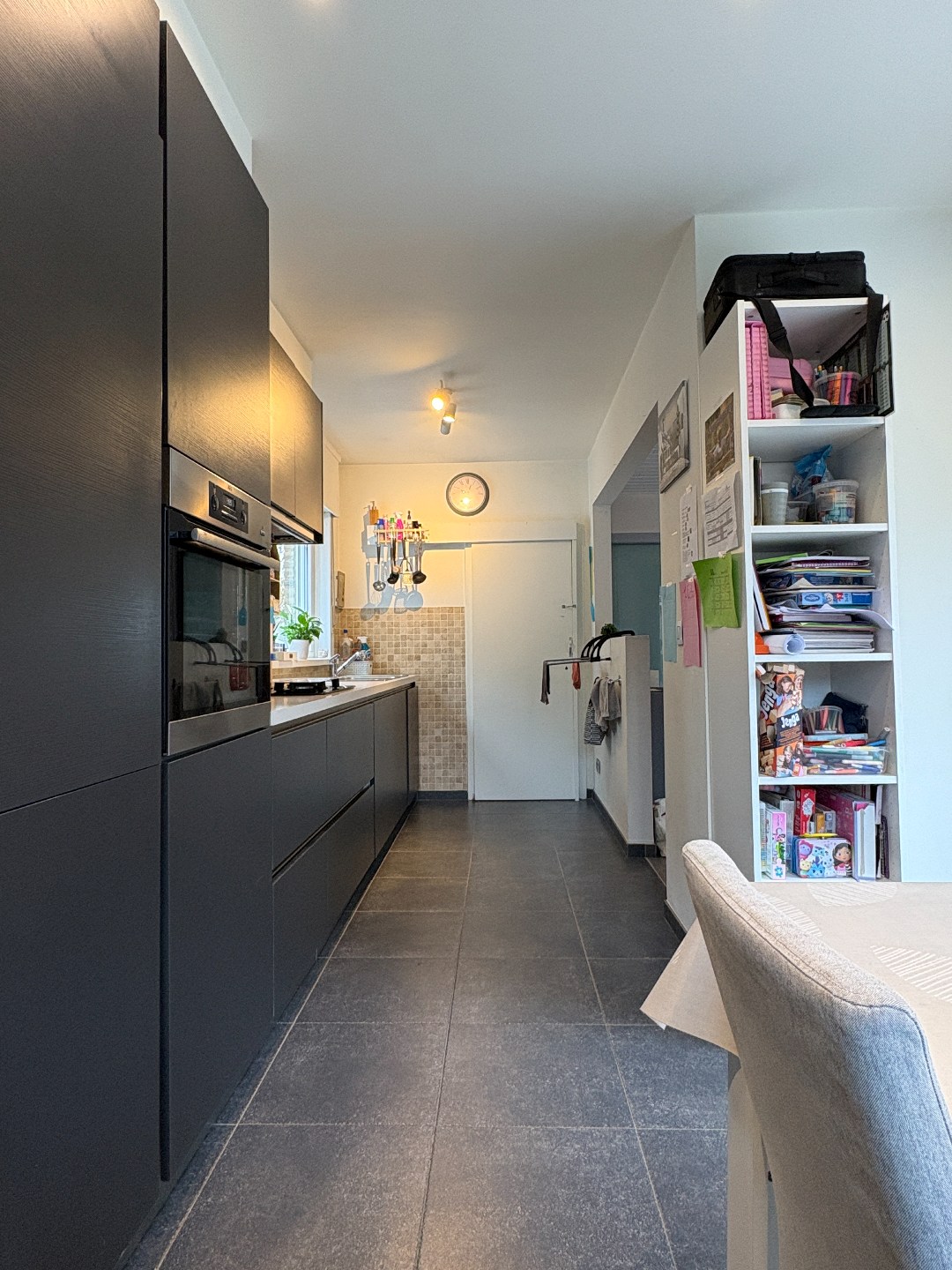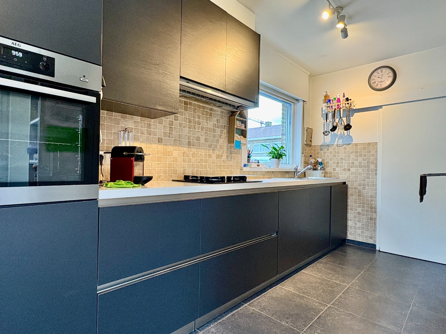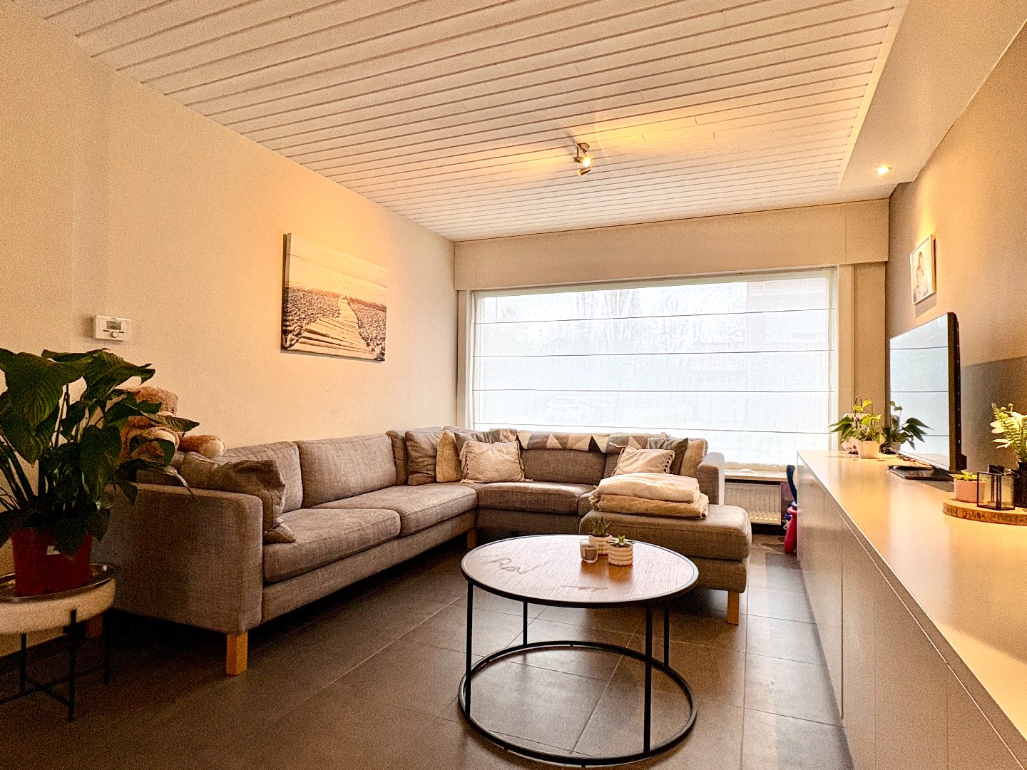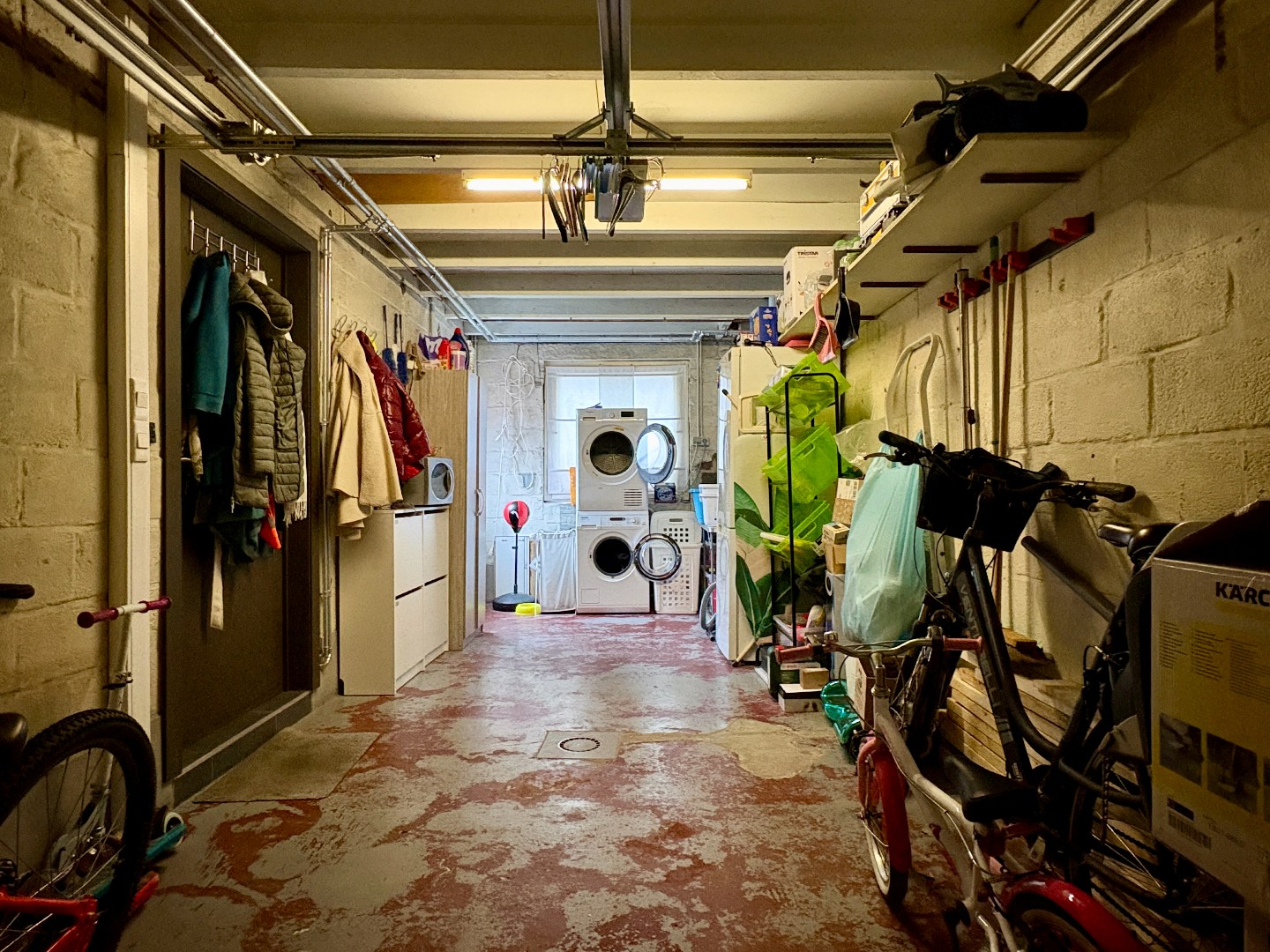 Aangename leefruimte met zithoek en eetplaats, grote raampartijen en een open keuken gedeelte. De keuken heeft een aangename uitbouw waar er nog een eetplaats is bijgecreëerd. Enerzijds kan je via de keuken naar de kelder, anderzijds naar de aanpalende garage. Bergruimte genoeg!