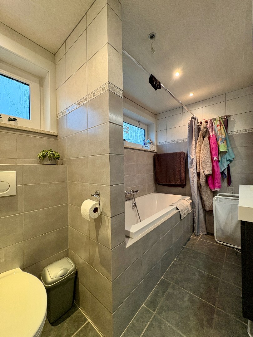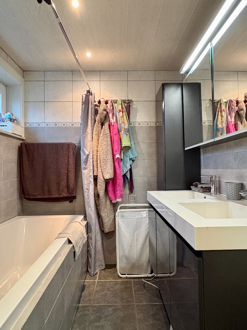 Verder is er op het gelijkvloers een badkamer met ligbad, wastafel, handdoekendroger en toilet. Op het verdiep zijn er 4! slaapkamers. Allen met rechte muren en voldoende ruim. Een schuifladder brengt ons naar de zolder.